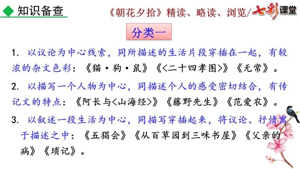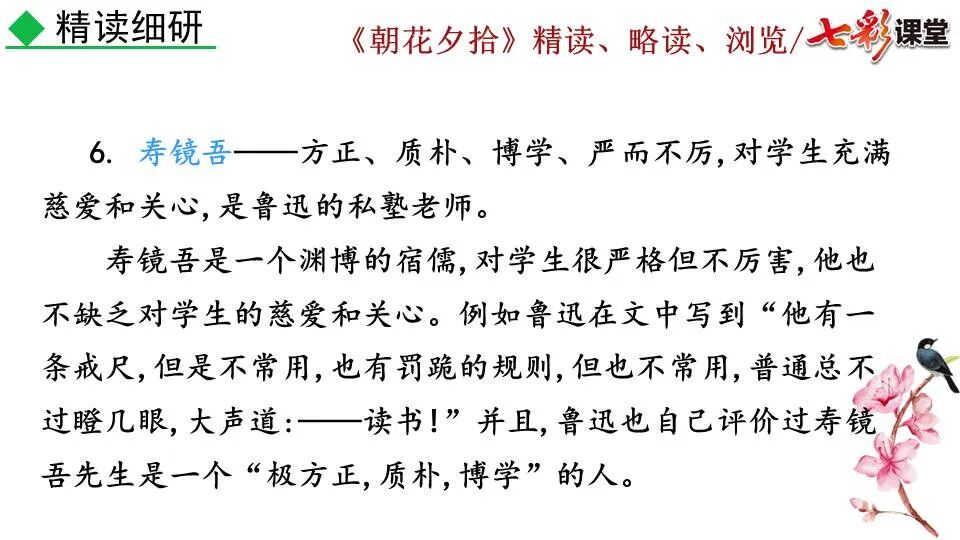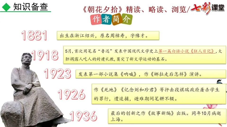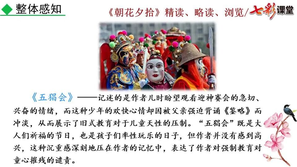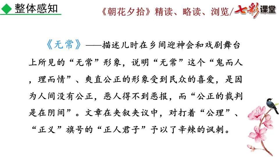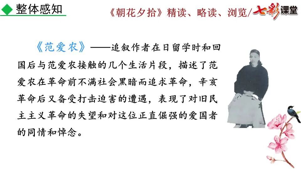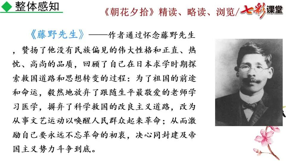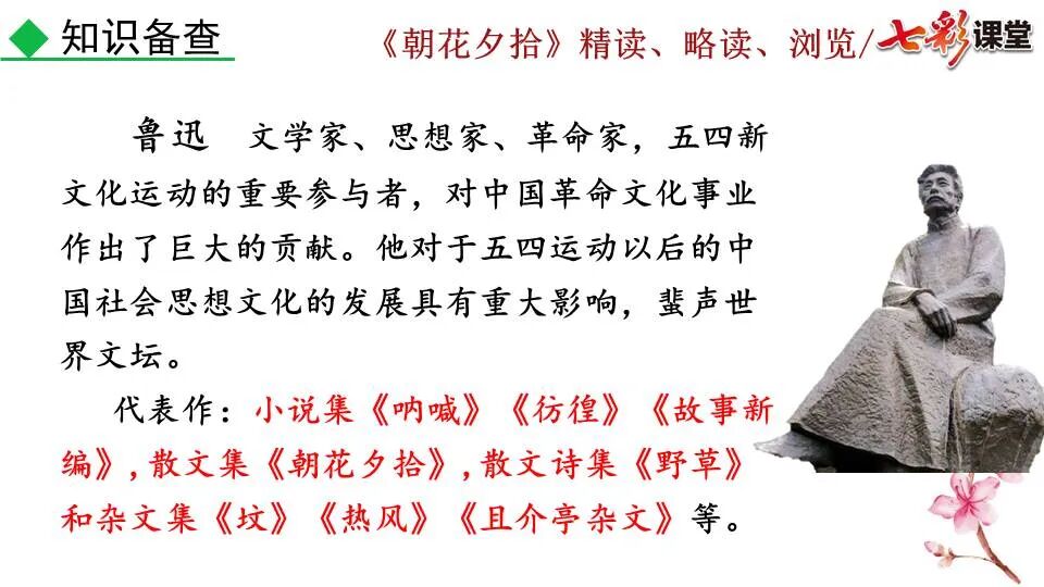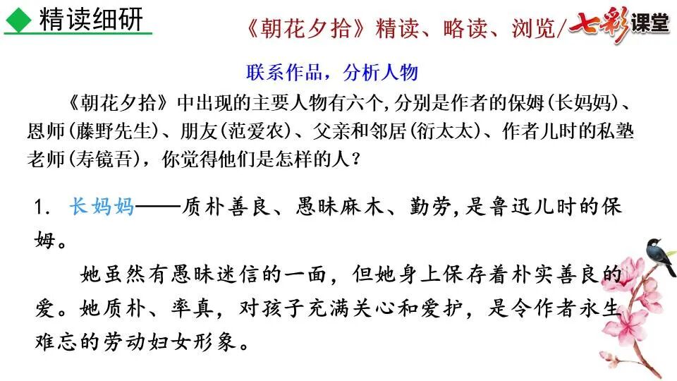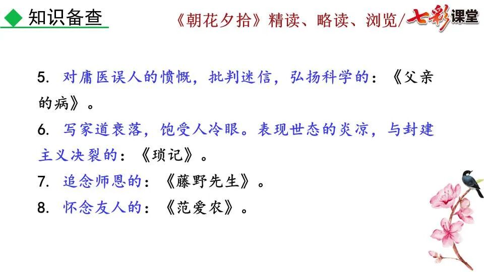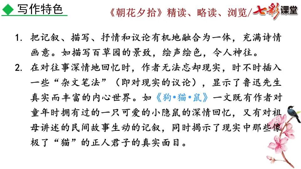 1.《朝花夕拾》是一部回忆性散文集,也是鲁迅惟一一部散文集,写于1926年,最初在《莽草》上发表时名为《旧事重提》。作者是鲁迅,他是我国现代伟大的的无产阶级文学家、思想家、革命家。 2. 在《朝花夕拾》的12篇文章中包括《狗·猫·鼠》,《阿长与<山海经>》、《二十四孝图》、《五猖会》、《无常》、《从百草园到三味书屋》、《父亲的病》、《琐记》、《藤野先生》、《范爱农》 等散文。外加一篇《小引》,一篇《后记》 3. 作者在《朝花夕拾》中全用第 一人称叙事。 二、作品的主要内容 1.《朝花夕拾》是鲁迅回忆童年,少年和青年时期不同生活经历与体验的文字,是记叙文,是回忆性散文。 2.《朝花夕拾》题目意义:“早晨的花晚上拾起”,意即“旧事重提”:“从记忆中抄出来的意思”。是“鲁迅回忆童年、少年和青年时期不同生活的经历与体验”。描绘了清末民初的生活画面。 三、各篇文章的主要内容和主题思想 1.《狗?猫?鼠》——在这篇文章里,鲁迅先生清算猫的罪行: 这篇文章主要通过对猫和鼠的一些秉性,行为的描写来比喻某些人。鲁迅先生在文中阐述他仇猫——即不喜欢猫的原因。其实这些原因与一类人的行为,性格很相像,例如写猫捕食到比自己弱小的动物就尽情玩弄,直到玩厌了,才吃掉,就像某些人,抓住了别人的弱点或不足之处,就想尽办法慢慢地折磨别人,好像如果不折磨够,就不甘心一样,如果别人犯了什么错,受到批评,说不定那种人就会在某个角落里偷偷地奸笑。 2.《阿长与〈山海经〉》——阿长是鲁迅小时候的保姆。记述儿时与阿长相处的情景,描写了长妈妈善良、朴实而又迷信、唠叨、“满肚子是麻烦的礼节”的性格;对她寻购赠送自己渴求已久的绘图《山海经》之情,充满了尊敬和感激。文章用深情的语言,表达了对这位劳动妇女的真诚的怀念。 3.《二十四孝图》——所谓《二十四孝图》主要目的是宣扬封建的孝道。鲁迅先生从自己小时阅读《二十四孝图》的感受入手,最反感“老莱娱亲”和“郭巨埋儿”,最不可思议的是“卧冰求鲤”,形象地揭露了封建孝道的虚伪和残酷。指斥这类封建孝道不顾儿童的性命,将“肉麻当作有趣”,“以不情为伦纪,诬蔑了古人,教坏了后人”。 老莱娱亲:老莱子,春秋时期楚国隐士,为躲避世乱,自耕于蒙山南麓。他孝顺父母,尽拣美味供奉双亲,70岁尚不言老,常穿着五色彩衣,手持拨浪鼓如小孩子般戏耍,以博父母开怀。一次为双亲送水,进屋时跌了一跤,他怕父母伤心,索性躺在地上学小孩子哭,二老大笑。 郭巨埋儿:郭巨,晋代隆虑(今河南林县)人,一说河内温县(今河南温县西南)人,原本家道殷实。父亲死后,他把家产分作两份,给了两个弟弟,自己独取母亲供养,对母极孝。后家境逐渐贫困,妻子生一男孩,郭巨担心,养这个孩子,必然影响供养母亲,遂和妻子商议:“儿子可以再有,母亲死了不能复活,不如埋掉儿子,节省些粮食供养母亲。”当他们挖坑时,在地下二尺处忽见一坛黄金,上书“天赐郭巨,官不得取,民不得夺”。夫妻得到黄金,回家孝敬母亲,并得以兼养孩子。 哭竹生笋:在三国时,有一个孝子,姓孟,名宗,字恭武,从小就丧了父亲,家里十分贫寒,母子俩相依为命。长大后,母亲年纪老迈,体弱多病。不管母亲想吃什么,他都想方设法满足她。一天,母亲病重,想吃竹笋煮羹,但这时正是冬天,冰天雪地,风雪交加,哪来竹笋呢?他无可奈何,想不出什么好的办法,就跑到竹林抱竹痛哭。哭了半天,只觉得全身发热,风吹过来也是热的。他睁眼一看,四周的冰雪都融化了,草木也由枯转青了,再仔细瞧瞧,周围长出了许多竹笋。他的孝心感动了天地。他把竹笋让母亲吃了,母亲的病就好了。有诗颂曰:泪滴朔风寒,萧萧竹数竿;须臾冬笋出,天意招平安。 子路负米:仲由,字子路、季路,春秋时期鲁国人,孔子的得意弟子,性格直率勇敢,十分孝顺。早年家中贫穷,自己常常采野菜做饭食,却从百里之外负米回家侍奉双亲。父母死后,他做了大官,奉命到楚国去,随从的车马有百乘之众,所积的粮食有万钟之多。坐在垒叠的锦褥上,吃着丰盛的筵席,他常常怀念双亲,慨叹说:“即使我想吃野菜,为父母亲去负米,哪里能够再得呢?”孔子赞扬说:“你侍奉父母,可以说是生时尽力,死后思念哪! 黄香扇枕:黄香,东汉江夏安陆人,九岁丧母,事父极孝。酷夏时为父亲扇凉枕席;寒冬时用身体为父亲温暖被褥。少年时即博通经典,文采飞扬,京师广泛流传“天下无双,江夏黄童”。安帝(107-125年)时任魏郡(今属河北)太守,魏郡遭受水灾,黄香尽其所有赈济灾民。著有《九宫赋》、《天子冠颂》等。 陆绩怀桔:陆绩,三国时期吴国吴县华亭(今上海市松江)人,科学家。六岁时,随父亲陆康到九江谒见袁术,袁术拿出橘子招待,陆绩往怀里藏了两个橘子。临行时,橘子滚落地上,袁术嘲笑道:“陆郎来我家作客,走的时候还要怀藏主人的橘子吗?”陆绩回答说:“母亲喜欢吃橘子,我想拿回去送给母亲尝尝。”袁术见他小小年纪就懂得孝顺母亲,十分惊奇。陆绩成年后,博学多识,通晓天文、历算,曾作《浑天图》,注《易经》,撰写《太玄经注》。 卧冰求鲤:晋朝时期,有个叫王祥的人,心地善良。他幼年时失去了母亲。后来继母朱氏对他不慈爱,时常在他父亲面前说三道四,搬弄是非。他父亲对他也逐渐冷淡。王祥的继母喜欢吃鲤鱼。有一年冬天,天气很冷,冰