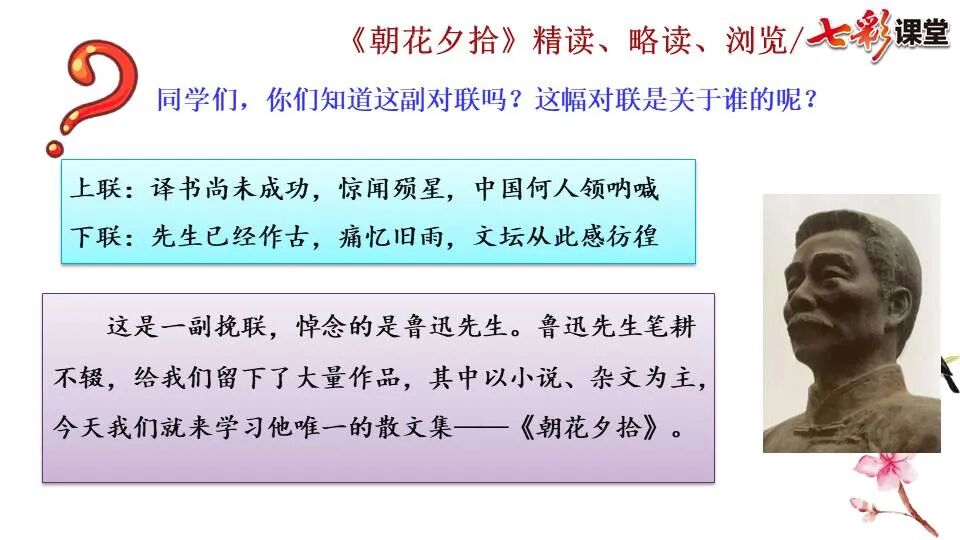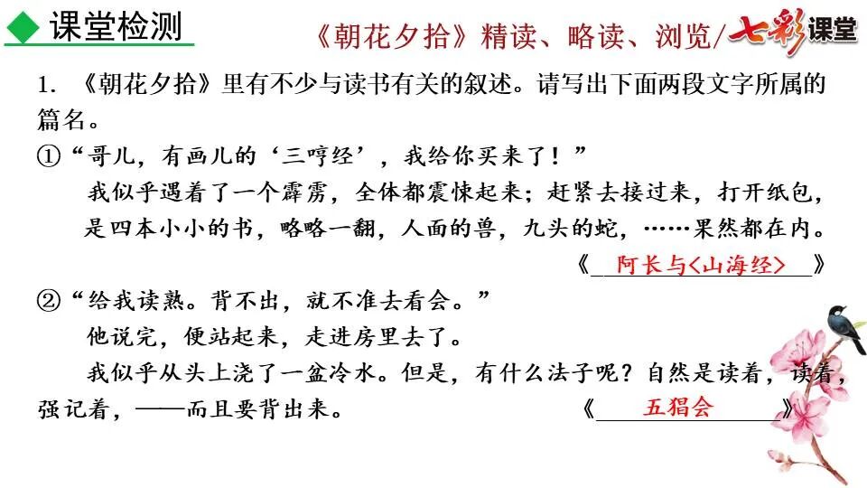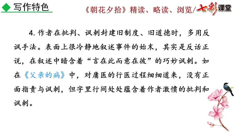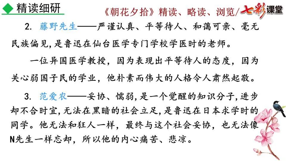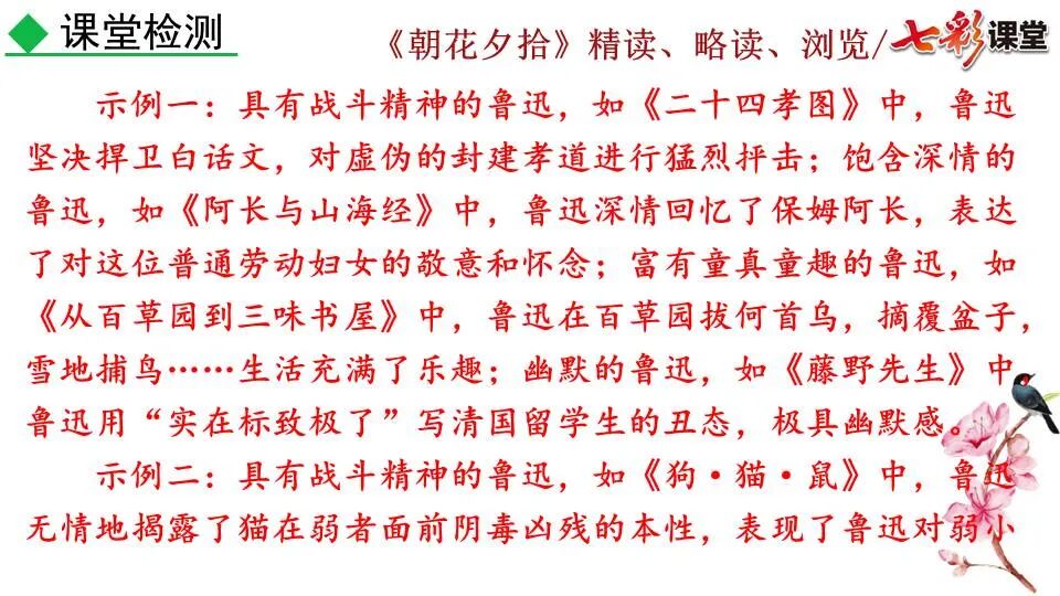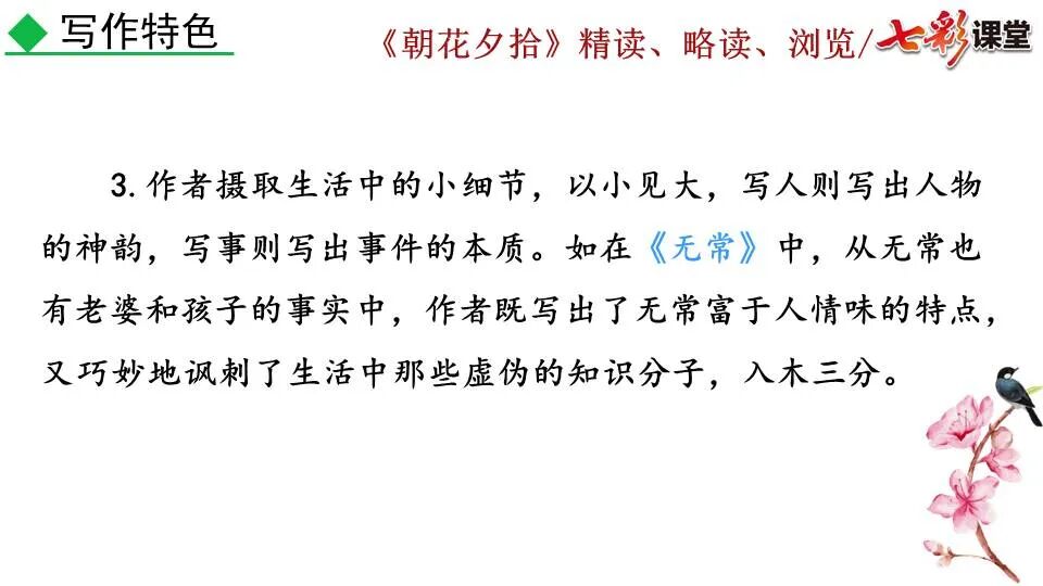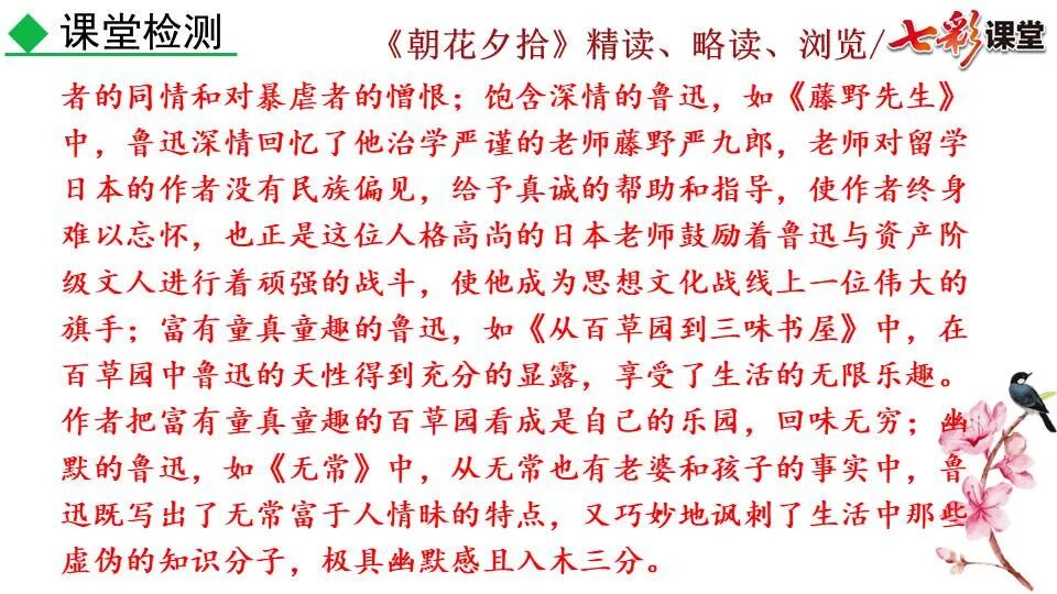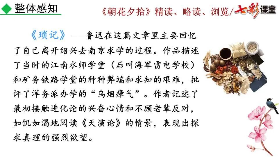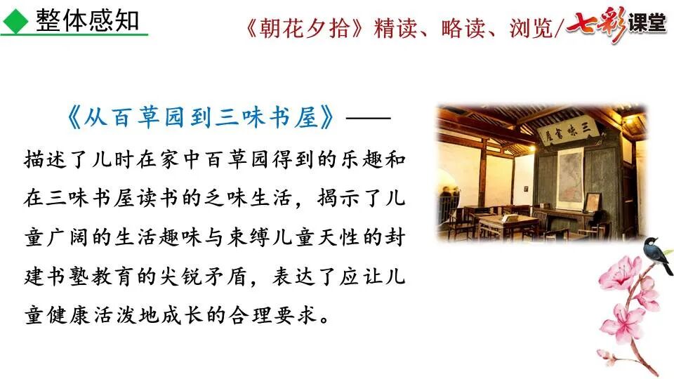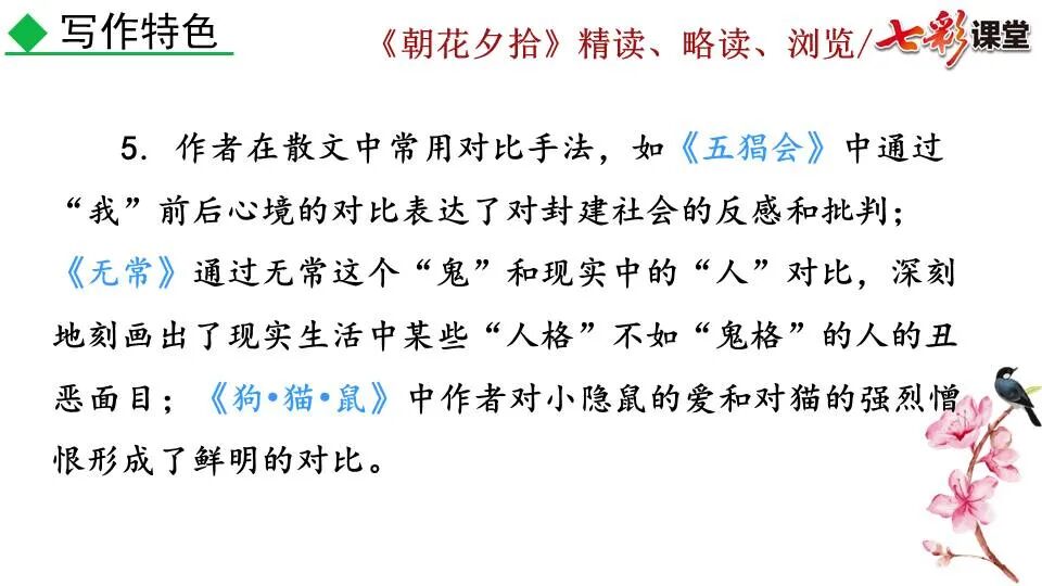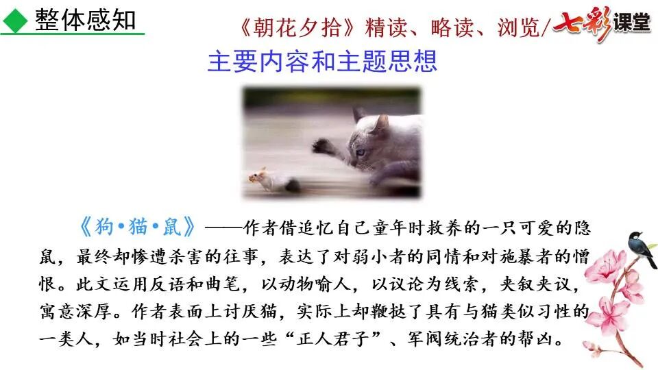 1.《朝花夕拾》是一部回忆性散文集,也是鲁迅惟一一部散文集,写于1926年,最初在《莽草》上发表时名为《旧事重提》。作者是鲁迅,他是我国现代伟大的的无产阶级文学家、思想家、革命家。 2. 在《朝花夕拾》的12篇文章中包括《狗·猫·鼠》,《阿长与<山海经>》、《二十四孝图》、《五猖会》、《无常》、《从百草园到三味书屋》、《父亲的病》、《琐记》、《藤野先生》、《范爱农》 等散文。外加一篇《小引》,一篇《后记》 3. 作者在《朝花夕拾》中全用第 一人称叙事。 二、作品的主要内容 1.《朝花夕拾》是鲁迅回忆童年,少年和青年时期不同生活经历与体验的文字,是记叙文,是回忆性散文。 2.《朝花夕拾》题目意义:“早晨的花晚上拾起”,意即“旧事重提”:“从记忆中抄出来的意思”。是“鲁迅回忆童年、少年和青年时期不同生活的经历与体验”。描绘了清末民初的生活画面。 三、各篇文章的主要内容和主题思想 1.《狗?猫?鼠》——在这篇文章里,鲁迅先生清算猫的罪行: 这篇文章主要通过对猫和鼠的一些秉性,行为的描写来比喻某些人。鲁迅先生在文中阐述他仇猫——即不喜欢猫的原因。其实这些原因与一类人的行为,性格很相像,例如写猫捕食到比自己弱小的动物就尽情玩弄,直到玩厌了,才吃掉,就像某些人,抓住了别人的弱点或不足之处,就想尽办法慢慢地折磨别人,好像如果不折磨够,就不甘心一样,如果别人犯了什么错,受到批评,说不定那种人就会在某个角落里偷偷地奸笑。 2.《阿长与〈山海经〉》——阿长是鲁迅小时候的保姆。记述儿时与阿长相处的情景,描写了长妈妈善良、朴实而又迷信、唠叨、“满肚子是麻烦的礼节”的性格;对她寻购赠送自己渴求已久的绘图《山海经》之情,充满了尊敬和感激。文章用深情的语言,表达了对这位劳动妇女的真诚的怀念。 3.《二十四孝图》——所谓《二十四孝图》主要目的是宣扬封建的孝道。鲁迅先生从自己小时阅读《二十四孝图》的感受入手,最反感“老莱娱亲”和“郭巨埋儿”,最不可思议的是“卧冰求鲤”,形象地揭露了封建孝道的虚伪和残酷。指斥这类封建孝道不顾儿童的性命,将“肉麻当作有趣”,“以不情为伦纪,诬蔑了古人,教坏了后人”。 老莱娱亲:老莱子,春秋时期楚国隐士,为躲避世乱,自耕于蒙山南麓。他孝顺父母,尽拣美味供奉双亲,70岁尚不言老,常穿着五色彩衣,手持拨浪鼓如小孩子般戏耍,以博父母开怀。一次为双亲送水,进屋时跌了一跤,他怕父母伤心,索性躺在地上学小孩子哭,二老大笑。 郭巨埋儿:郭巨,晋代隆虑(今河南林县)人,一说河内温县(今河南温县西南)人,原本家道殷实。父亲死后,他把家产分作两份,给了两个弟弟,自己独取母亲供养,对母极孝。后家境逐渐贫困,妻子生一男孩,郭巨担心,养这个孩子,必然影响供养母亲,遂和妻子商议:“儿子可以再有,母亲死了不能复活,不如埋掉儿子,节省些粮食供养母亲。”当他们挖坑时,在地下二尺处忽见一坛黄金,上书“天赐郭巨,官不得取,民不得夺”。夫妻得到黄金,回家孝敬母亲,并得以兼养孩子。 哭竹生笋:在三国时,有一个孝子,姓孟,名宗,字恭武,从小就丧了父亲,家里十分贫寒,母子俩相依为命。长大后,母亲年纪老迈,体弱多病。不管母亲想吃什么,他都想方设法满足她。一天,母亲病重,想吃竹笋煮羹,但这时正是冬天,冰天雪地,风雪交加,哪来竹笋呢?他无可奈何,想不出什么好的办法,就跑到竹林抱竹痛哭。哭了半天,只觉得全身发热,风吹过来也是热的。他睁眼一看,四周的冰雪都融化了,草木也由枯转青了,再仔细瞧瞧,周围长出了许多竹笋。他的孝心感动了天地。他把竹笋让母亲吃了,母亲的病就好了。有诗颂曰:泪滴朔风寒,萧萧竹数竿;须臾冬笋出,天意招平安。 子路负米:仲由,字子路、季路,春秋时期鲁国人,孔子的得意弟子,性格直率勇敢,十分孝顺。早年家中贫穷,自己常常采野菜做饭食,却从百里之外负米回家侍奉双亲。父母死后,他做了大官,奉命到楚国去,随从的车马有百乘之众,所积的粮食有万钟之多。坐在垒叠的锦褥上,吃着丰盛的筵席,他常常怀念双亲,慨叹说:“即使我想吃野菜,为父母亲去负米,哪里能够再得呢?”孔子赞扬说:“你侍奉父母,可以说是生时尽力,死后思念哪! 黄香扇枕:黄香,东汉江夏安陆人,九岁丧母,事父极孝。酷夏时为父亲扇凉枕席;寒冬时用身体为父亲温暖被褥。少年时即博通经典,文采飞扬,京师广泛流传“天下无双,江夏黄童”。安帝(107-125年)时任魏郡(今属河北)太守,魏郡遭受水灾,黄香尽其所有赈济灾民。著有《九宫赋》、《天子冠颂》等。 陆绩怀桔:陆绩,三国时期吴国吴县华亭(今上海市松江)人,科学家。六岁时,随父亲陆康到九江谒见袁术,袁术拿出橘子招待,陆绩往怀里藏了两个橘子。临行时,橘子滚落地上,袁术嘲笑道:“陆郎来我家作客,走的时候还要怀藏主人的橘子吗?”陆绩回答说:“母亲喜欢吃橘子,我想拿回去送给母亲尝尝。”袁术见他小小年纪就懂得孝顺母亲,十分惊奇。陆绩成年后,博学多识,通晓天文、历算,曾作《浑天图》,注《易经》,撰写《太玄经注》。 卧冰求鲤:晋朝时期,有个叫王祥的人,心地善良。他幼年时失去了母亲。后来继母朱氏对他不慈爱,时常在他父亲面前说三道四,搬弄是非。他父亲对他也逐渐冷淡。王祥的继母喜欢吃鲤鱼。有一年冬天,天气很冷,冰
