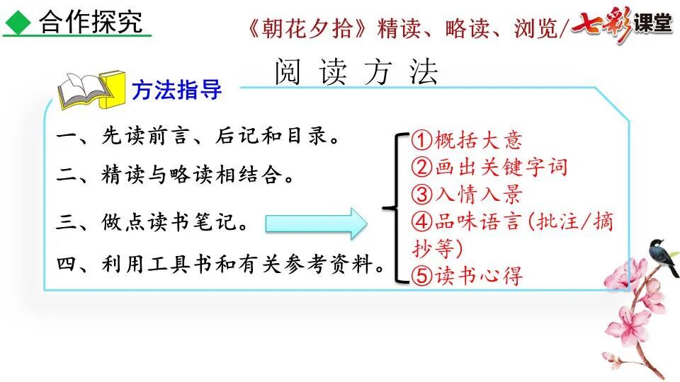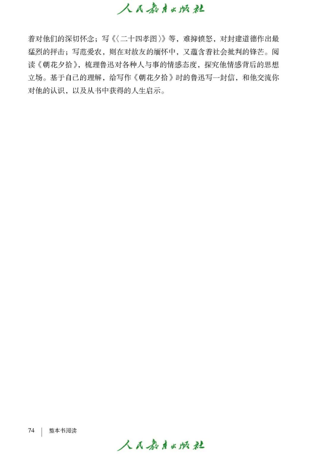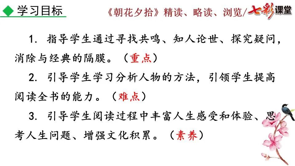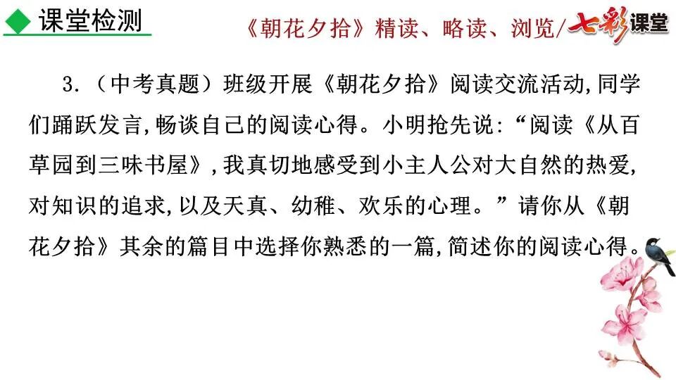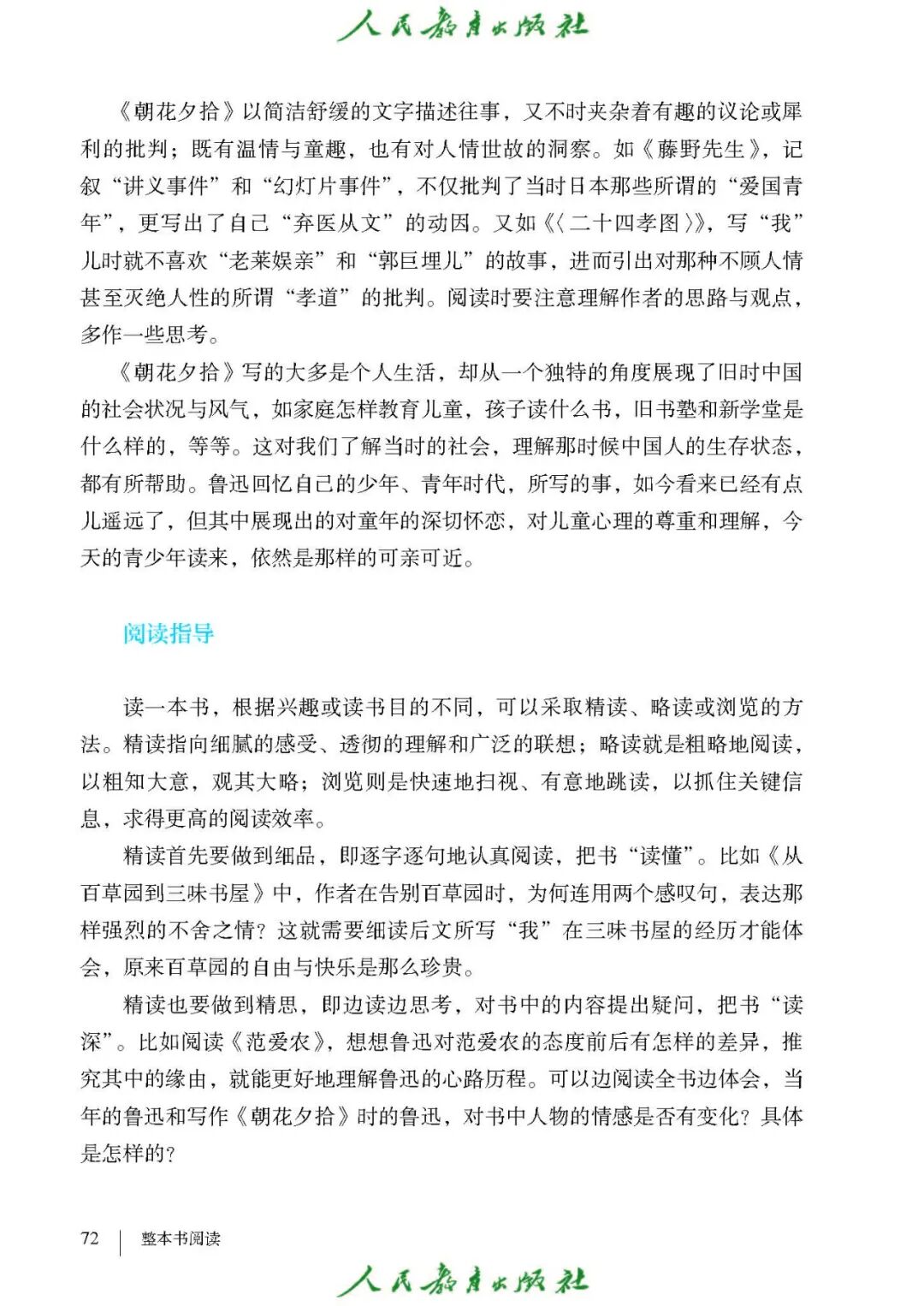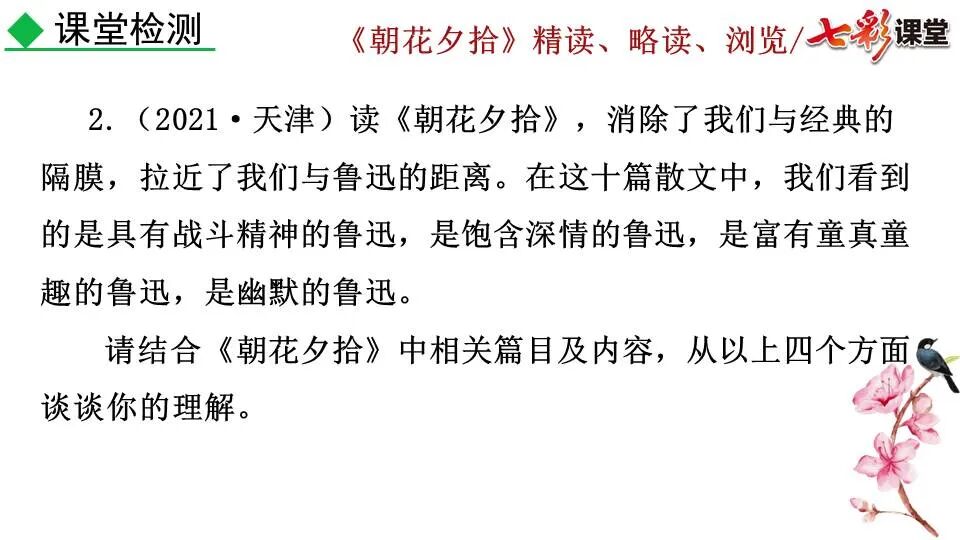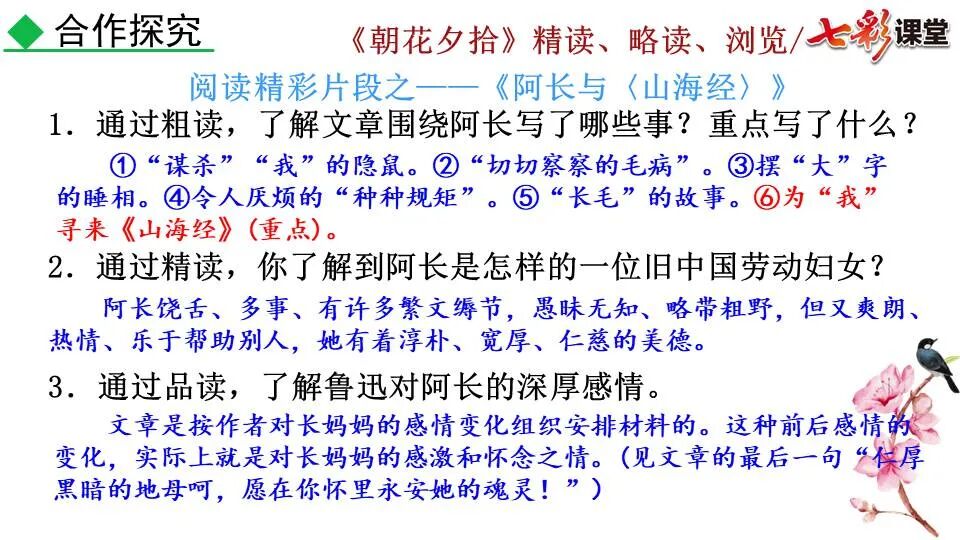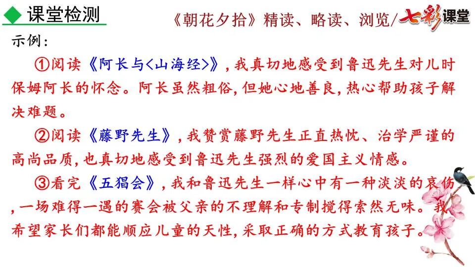 1.《朝花夕拾》是一部回忆性散文集,也是鲁迅惟一一部散文集,写于1926年,最初在《莽草》上发表时名为《旧事重提》。作者是鲁迅,他是我国现代伟大的的无产阶级文学家、思想家、革命家。 2. 在《朝花夕拾》的12篇文章中包括《狗·猫·鼠》,《阿长与<山海经>》、《二十四孝图》、《五猖会》、《无常》、《从百草园到三味书屋》、《父亲的病》、《琐记》、《藤野先生》、《范爱农》 等散文。外加一篇《小引》,一篇《后记》 3. 作者在《朝花夕拾》中全用第 一人称叙事。 二、作品的主要内容 1.《朝花夕拾》是鲁迅回忆童年,少年和青年时期不同生活经历与体验的文字,是记叙文,是回忆性散文。 2.《朝花夕拾》题目意义:“早晨的花晚上拾起”,意即“旧事重提”:“从记忆中抄出来的意思”。是“鲁迅回忆童年、少年和青年时期不同生活的经历与体验”。描绘了清末民初的生活画面。 三、各篇文章的主要内容和主题思想 1.《狗?猫?鼠》——在这篇文章里,鲁迅先生清算猫的罪行: 这篇文章主要通过对猫和鼠的一些秉性,行为的描写来比喻某些人。鲁迅先生在文中阐述他仇猫——即不喜欢猫的原因。其实这些原因与一类人的行为,性格很相像,例如写猫捕食到比自己弱小的动物就尽情玩弄,直到玩厌了,才吃掉,就像某些人,抓住了别人的弱点或不足之处,就想尽办法慢慢地折磨别人,好像如果不折磨够,就不甘心一样,如果别人犯了什么错,受到批评,说不定那种人就会在某个角落里偷偷地奸笑。 2.《阿长与〈山海经〉》——阿长是鲁迅小时候的保姆。记述儿时与阿长相处的情景,描写了长妈妈善良、朴实而又迷信、唠叨、“满肚子是麻烦的礼节”的性格;对她寻购赠送自己渴求已久的绘图《山海经》之情,充满了尊敬和感激。文章用深情的语言,表达了对这位劳动妇女的真诚的怀念。 3.《二十四孝图》——所谓《二十四孝图》主要目的是宣扬封建的孝道。鲁迅先生从自己小时阅读《二十四孝图》的感受入手,最反感“老莱娱亲”和“郭巨埋儿”,最不可思议的是“卧冰求鲤”,形象地揭露了封建孝道的虚伪和残酷。指斥这类封建孝道不顾儿童的性命,将“肉麻当作有趣”,“以不情为伦纪,诬蔑了古人,教坏了后人”。 老莱娱亲:老莱子,春秋时期楚国隐士,为躲避世乱,自耕于蒙山南麓。他孝顺父母,尽拣美味供奉双亲,70岁尚不言老,常穿着五色彩衣,手持拨浪鼓如小孩子般戏耍,以博父母开怀。一次为双亲送水,进屋时跌了一跤,他怕父母伤心,索性躺在地上学小孩子哭,二老大笑。 郭巨埋儿:郭巨,晋代隆虑(今河南林县)人,一说河内温县(今河南温县西南)人,原本家道殷实。父亲死后,他把家产分作两份,给了两个弟弟,自己独取母亲供养,对母极孝。后家境逐渐贫困,妻子生一男孩,郭巨担心,养这个孩子,必然影响供养母亲,遂和妻子商议:“儿子可以再有,母亲死了不能复活,不如埋掉儿子,节省些粮食供养母亲。”当他们挖坑时,在地下二尺处忽见一坛黄金,上书“天赐郭巨,官不得取,民不得夺”。夫妻得到黄金,回家孝敬母亲,并得以兼养孩子。 哭竹生笋:在三国时,有一个孝子,姓孟,名宗,字恭武,从小就丧了父亲,家里十分贫寒,母子俩相依为命。长大后,母亲年纪老迈,体弱多病。不管母亲想吃什么,他都想方设法满足她。一天,母亲病重,想吃竹笋煮羹,但这时正是冬天,冰天雪地,风雪交加,哪来竹笋呢?他无可奈何,想不出什么好的办法,就跑到竹林抱竹痛哭。哭了半天,只觉得全身发热,风吹过来也是热的。他睁眼一看,四周的冰雪都融化了,草木也由枯转青了,再仔细瞧瞧,周围长出了许多竹笋。他的孝心感动了天地。他把竹笋让母亲吃了,母亲的病就好了。有诗颂曰:泪滴朔风寒,萧萧竹数竿;须臾冬笋出,天意招平安。 子路负米:仲由,字子路、季路,春秋时期鲁国人,孔子的得意弟子,性格直率勇敢,十分孝顺。早年家中贫穷,自己常常采野菜做饭食,却从百里之外负米回家侍奉双亲。父母死后,他做了大官,奉命到楚国去,随从的车马有百乘之众,所积的粮食有万钟之多。坐在垒叠的锦褥上,吃着丰盛的筵席,他常常怀念双亲,慨叹说:“即使我想吃野菜,为父母亲去负米,哪里能够再得呢?”孔子赞扬说:“你侍奉父母,可以说是生时尽力,死后思念哪! 黄香扇枕:黄香,东汉江夏安陆人,九岁丧母,事父极孝。酷夏时为父亲扇凉枕席;寒冬时用身体为父亲温暖被褥。少年时即博通经典,文采飞扬,京师广泛流传“天下无双,江夏黄童”。安帝(107-125年)时任魏郡(今属河北)太守,魏郡遭受水灾,黄香尽其所有赈济灾民。著有《九宫赋》、《天子冠颂》等。 陆绩怀桔:陆绩,三国时期吴国吴县华亭(今上海市松江)人,科学家。六岁时,随父亲陆康到九江谒见袁术,袁术拿出橘子招待,陆绩往怀里藏了两个橘子。临行时,橘子滚落地上,袁术嘲笑道:“陆郎来我家作客,走的时候还要怀藏主人的橘子吗?”陆绩回答说:“母亲喜欢吃橘子,我想拿回去送给母亲尝尝。”袁术见他小小年纪就懂得孝顺母亲,十分惊奇。陆绩成年后,博学多识,通晓天文、历算,曾作《浑天图》,注《易经》,撰写《太玄经注》。 卧冰求鲤:晋朝时期,有个叫王祥的人,心地善良。他幼年时失去了母亲。后来继母朱氏对他不慈爱,时常在他父亲面前说三道四,搬弄是非。他父亲对他也逐渐冷淡。王祥的继母喜欢吃鲤鱼。有一年冬天,天气很冷,冰