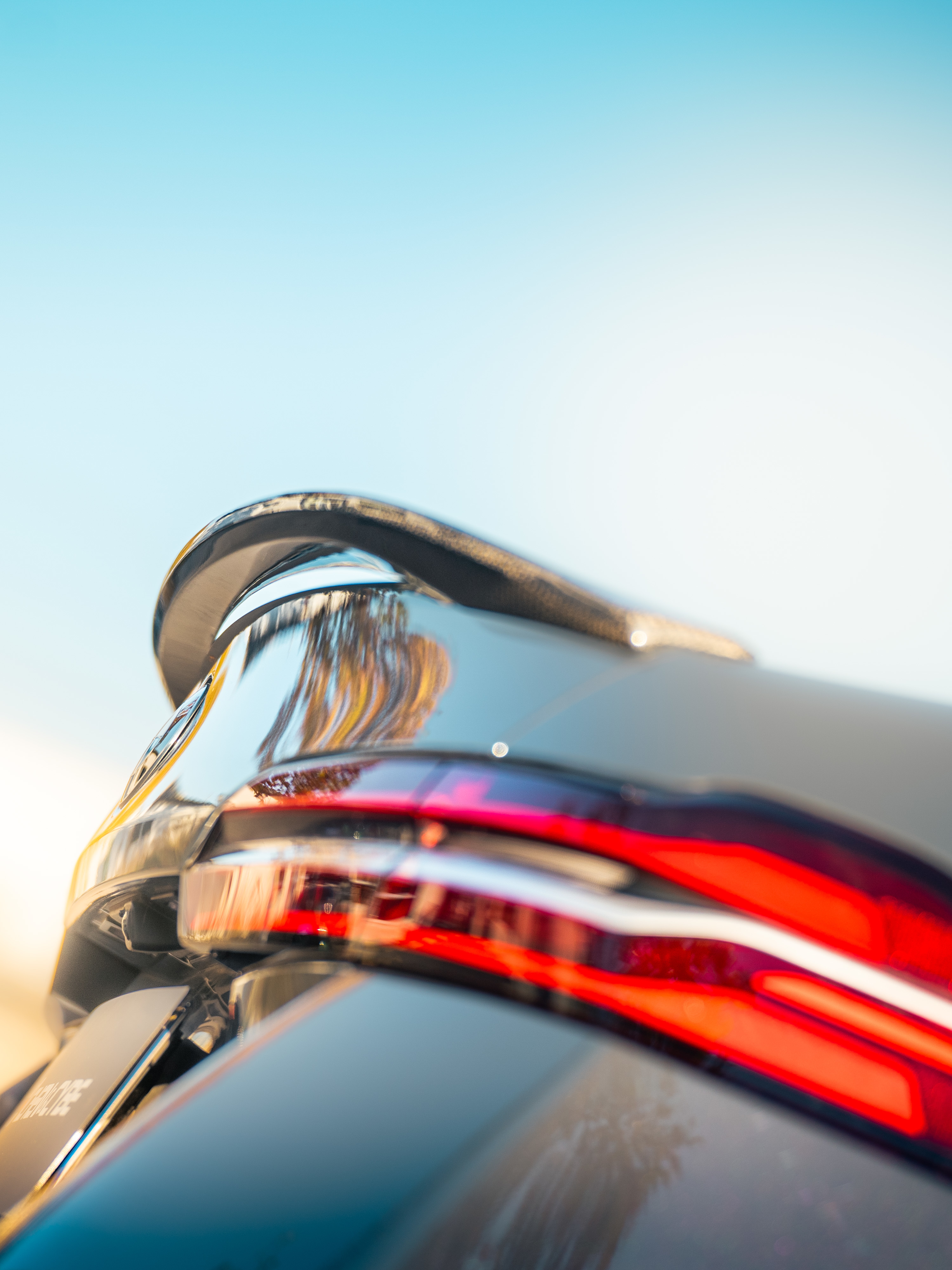 来到车尾,雷肯茨博的碳纤维后唇和尾翼更是将车辆的战斗风格展现得淋漓尽致。后唇的设计较为宽大,与车尾的保险杠完美贴合,形成了一个整体的扩散器造型。其碳纤维纹理与前唇相呼应,使车辆的整体改装风格更加统一和谐。在功能上,后唇能够有效地梳理车尾的气流,减少空气阻力,提高车辆的行驶稳定性,同时也为车辆增添了一份运动气息。g68
