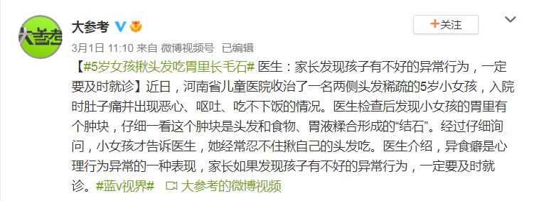 2022年3月光明网报道,江苏9岁女孩老喊肚子疼,一查胃里藏着1斤多头发。