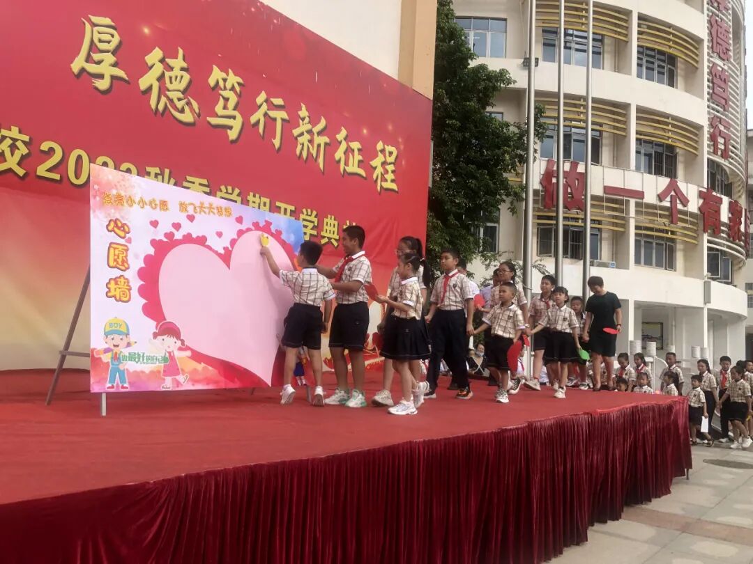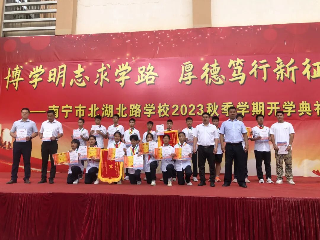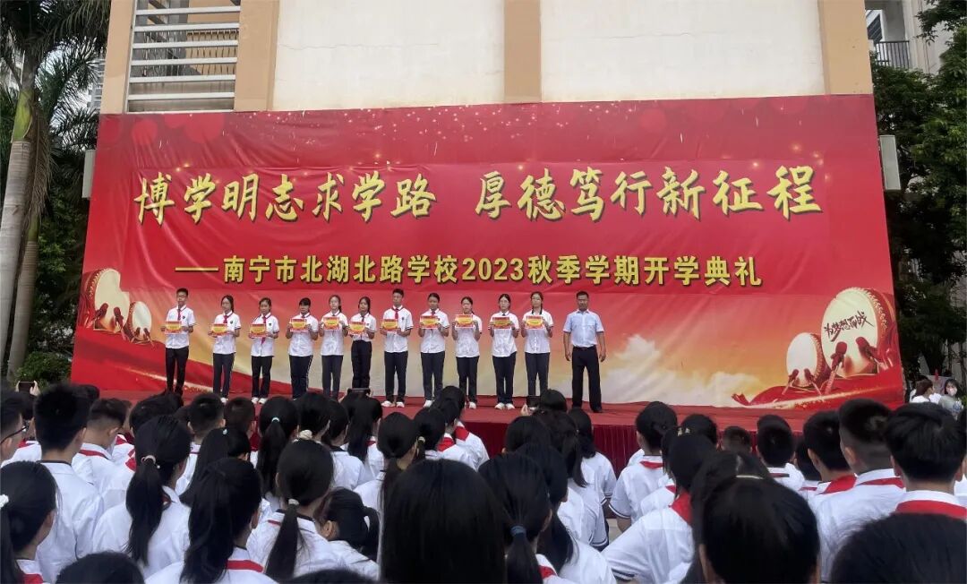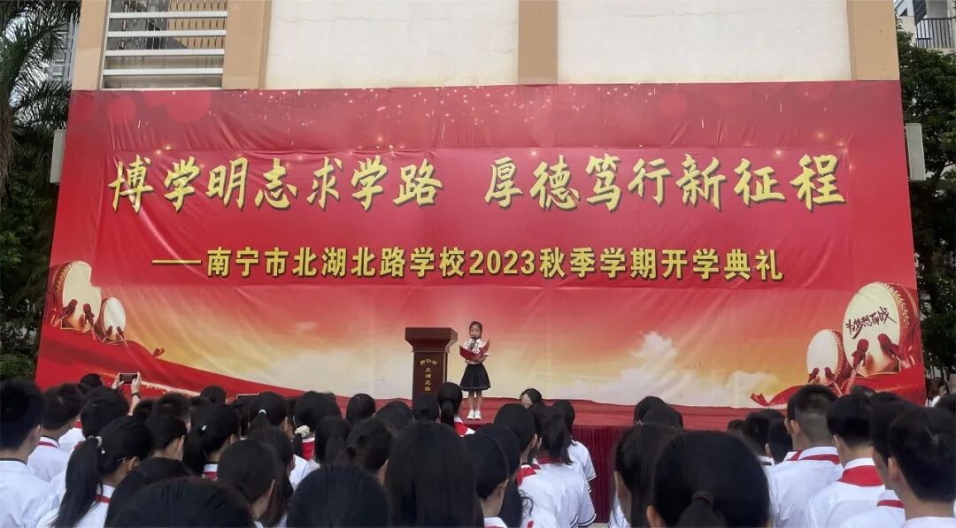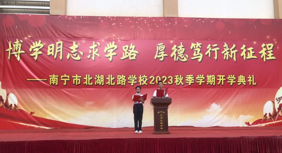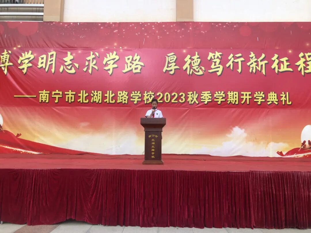 博学明志求学路 厚德笃行新征程 ——南宁市北湖北路学校2023年秋季学期开学典礼 秋风送爽启征程,奋辑杨帆再出发。2023年8月28日,南宁市北湖北路学校全体师生齐聚操场,隆重举行2023年秋季学期开学典礼。本次开学典礼由我校学生代表莫子涵、何光益主持。 铸爱国魂,立鸿鹄志 风来旌旗动,光耀文墨香,开学典礼在庄严的国歌声中拉开帷幕。校国旗队迈着整齐划一的步伐走上升旗台,嘹亮国歌响彻校园。全体师生注目致礼,激昂的旋律流入心底,励志做一个有家国情怀的人。 博学明志,厚德笃行 博学明志,厚德笃行。吴俸俊校长以饱满的热情向全体师生致以亲切的问候并欢迎大家回到美丽的校园。校长在致词中提出:“希望同学们坚定信念,做有家国情怀的好少年;做品行端正,真诚可信的好少年;做勇于拼搏,文武兼修的好少年。希望同学们在新学期养成爱读书的好习惯,树立健康第一的意识,学会合作,在努力和奋斗中实现自己的青春梦想,用时代和奋斗书写精彩人生!”校长的嘱托萦绕耳畔,进入新学年,北湖北路的学子定会青春之我、奋斗之我,从心出发,逐梦前行。 以梦为马,不负韶华 新生代表在开学典礼上庄重承诺:作为新时代青少年,要勤思考、勤于问、勤于练,带着老师们殷切的期望,带着家长们深情的嘱托,脚踏实地,在困难与磨练中挑战自我,再谱华章。 回顾过去,展望未来 上学期是收获的学期,我们一路奔跑,收获满满惊喜。学年伊始,对上学期取得优异成绩的师生进行表彰。他们不畏困难,追求卓越;他们乘风破浪,逆势而上;他们砥砺前行,为北湖北路学校 北湖北路学校谱写新的辉煌! 寻梦而行,向阳而生 一曲《我们都是追梦人》教师代表与舞蹈队学生一齐跳出青春舞动的旋律,在这个属于奋斗者的新时代,人人都有追梦的权利,人人都是梦想的铸造者。伴着音乐节拍,学生代表在新学期许愿墙上贴下自己的新学期目标,希望同学们不忘初心,奋力追梦,成就更好的自己,开学典礼缓缓落下帷幕。 博学明志求学路,厚德笃行新征程。朝气蓬勃的北湖北路学子正踌躇满志,踏梦而来,以一往无前的奋斗姿态,在披荆斩棘中开拓前行,全力开启全新的篇章! 【END】 主编 / 吴俸俊 顾问 / 罗瑞才 文字 /文誉频 拍摄/ 黄艳珊 陆艳彬 审核 / 吴少宁 公众号编辑 / 黄艳珊![]()