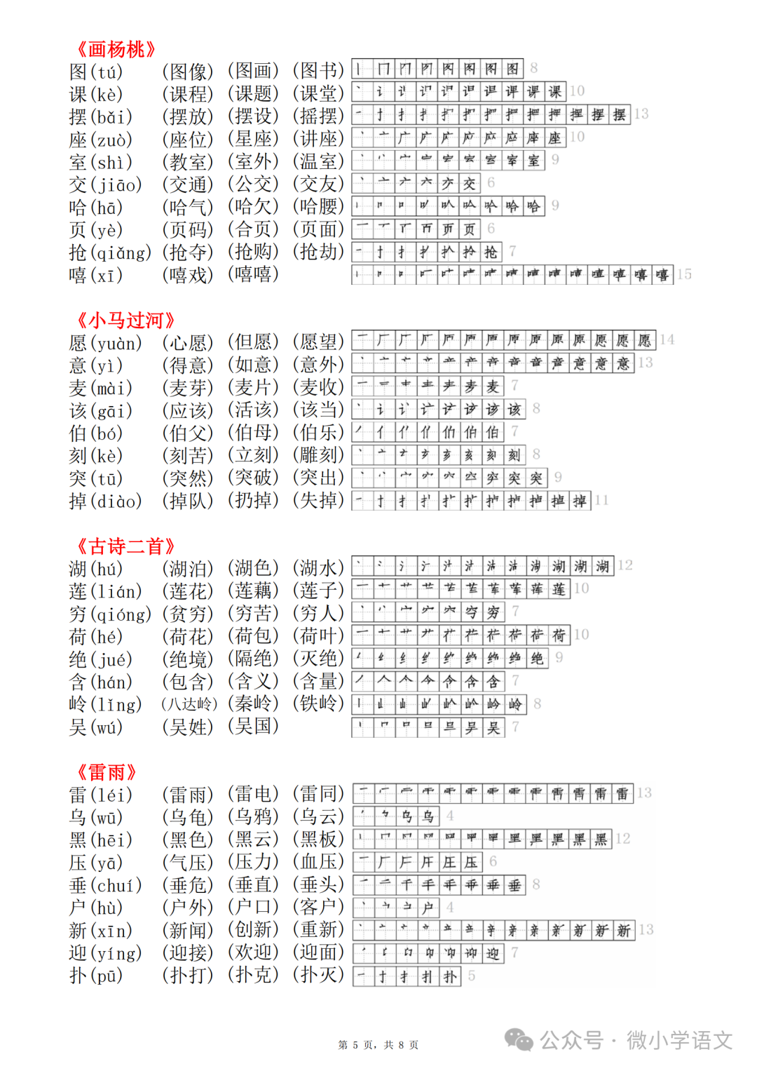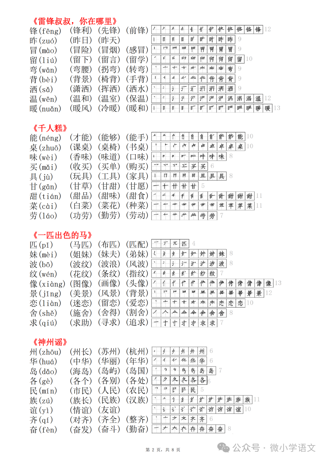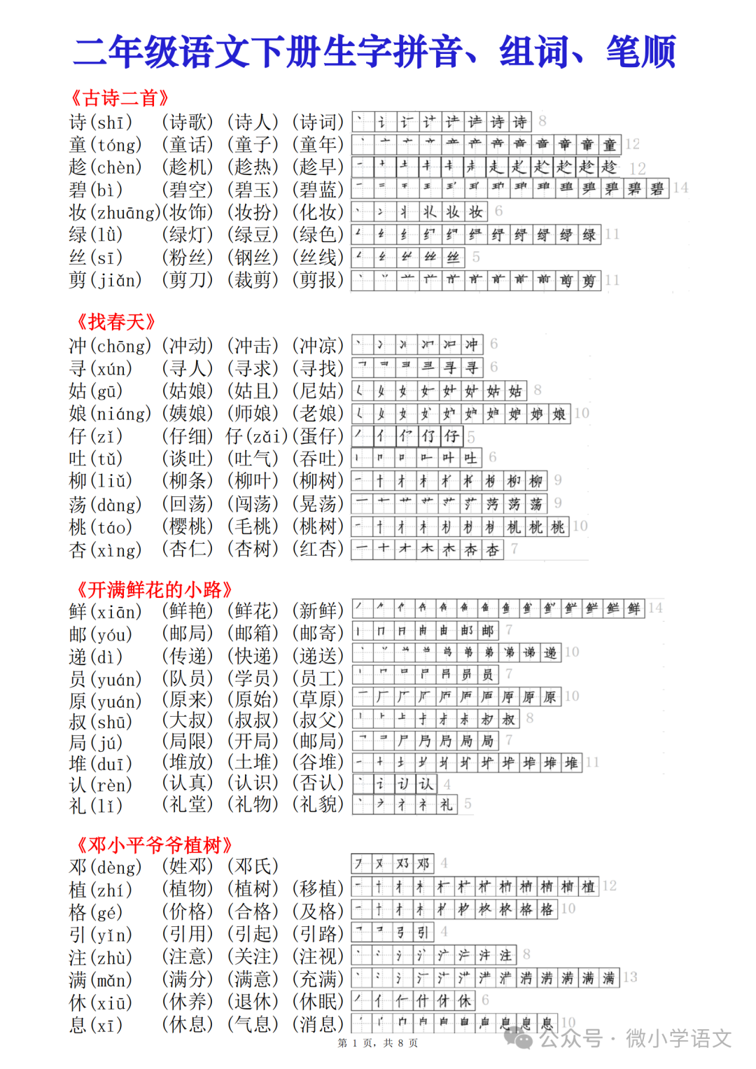 25年二年级下册语文《生字表汇总》(拼音、组词、笔顺),电子版可下载,课文生字是语文学习的重点,这份生字表包含了二年级下册语文必需掌握的生字、拼音、组词、笔顺等内容,寒假预习的时候多背一背,为下学期的语文学习奠定扎实的基础。 (温馨提示:文末有完整电子版领取方式) 二年级下册生字表 二年级下册生字表![]()