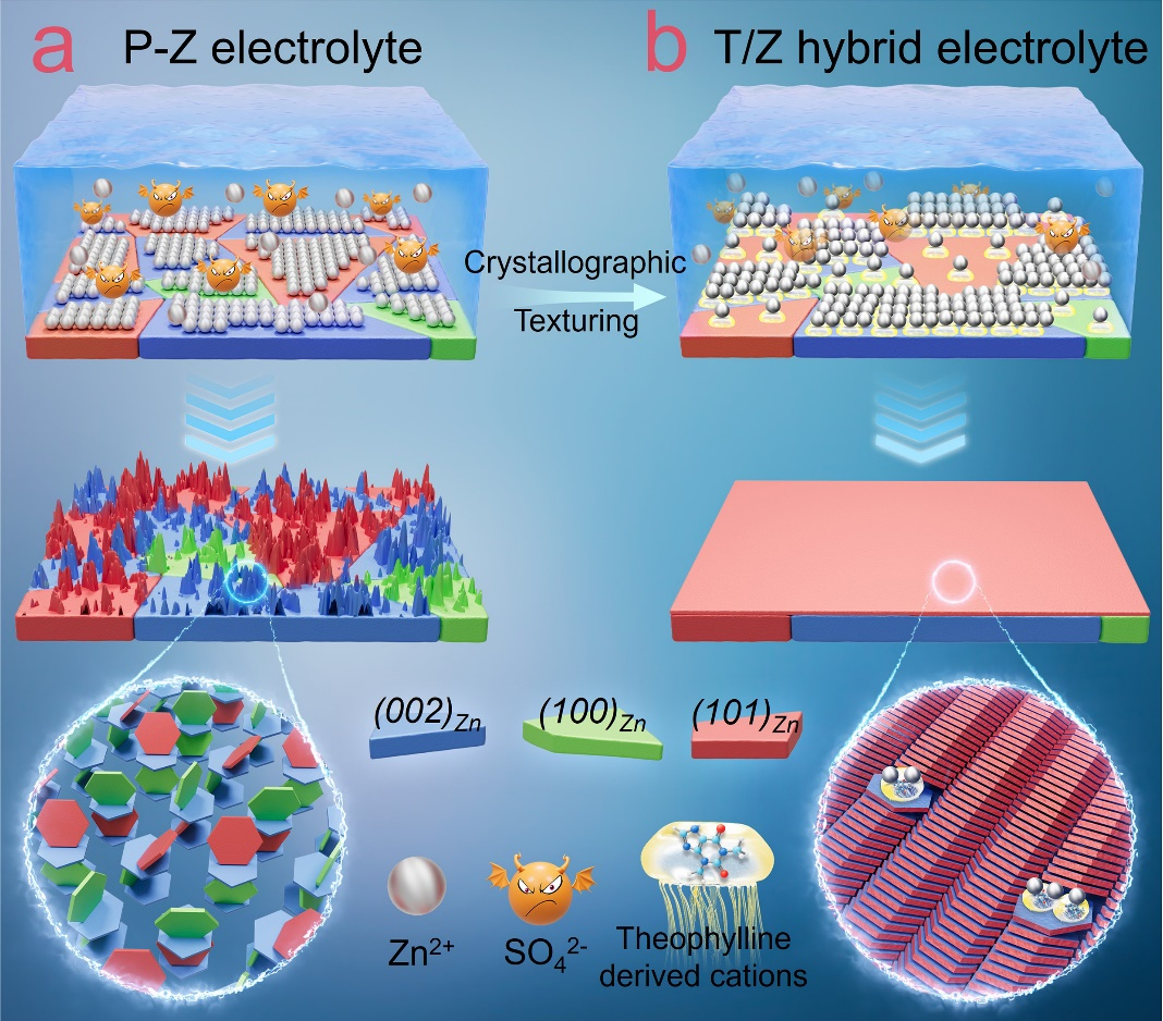 鉴于此,近日安徽大学胡海波教授和深圳哈工大莫富年博士,中科院微电子所李博研究员合作研究发现,通过在ZnSO4电解质中引入微量茶碱添加剂,织构化暴露(101)Zn 晶面在促进无枝晶锌沉积方面同样有效。实验结果和理论模拟计算表明:茶碱衍生的阳离子由于较高的吸附能而倾向于吸附在(002)Zn晶面上,从而使得(002)Zn晶面获得与Zn2+离子更强的亲和力而加速生长。这有助于(101)Zn晶面的织构暴露,进而实现MZAs表面锌的有序取向生长(机制图1b),从而使其在高达40%的放电深度下电沉积/溶解循环能够超过650小时,显著提高了AZMBs的能效(1000次循环后容量保持率为76.7%)相对于不含添加剂的电池(36.3%)。该工作不仅提供了一种新颖的,可有效增强锌阳极电化学可逆性的表面织构新方法,而且进一步加深了对锌阳极表面织构工程和无枝晶锌沉积行为关系的理论认识,为实现无枝晶锌阳极的设计制备开辟了新的路径。