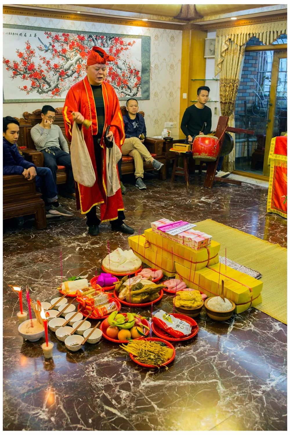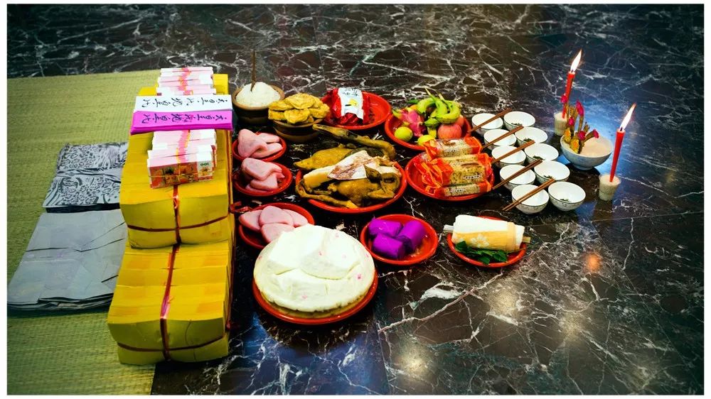 入厝打油火首先要致办五牲和发果(用某种环形器皿装着,发酵而成的巨型面包,祀拜土地神,称为谢土。