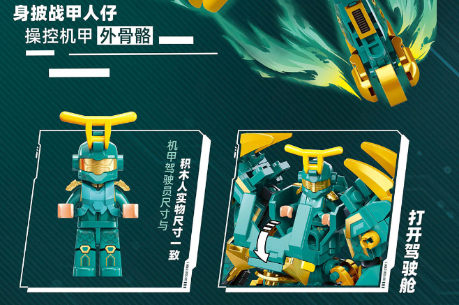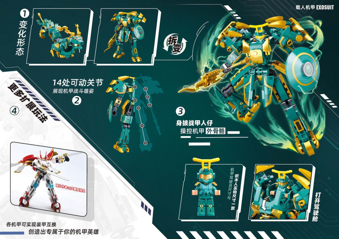 以小鲁班今年的山海经-青龙载人机甲积木为例。产品拥有战士机甲、神兽青龙两种形态(各种形态需要单独拼装)。战士形态下,全身有14处关节可动,玩家可根据个人喜好将产品摆放成不同姿势;神兽状态则是运用了仿生设计,使得神兽外观造型非常生动。