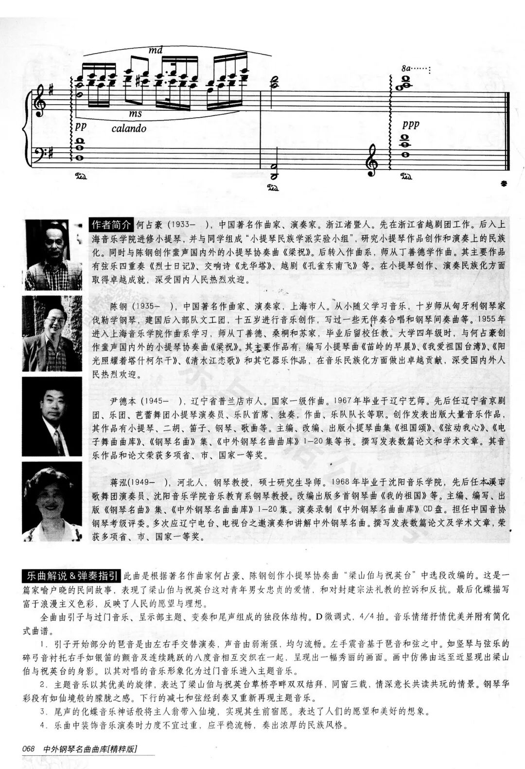 大家还记得这位演奏《梁祝》老奶奶吗?没看过的同学先看一下,最重要的是小编终于找到了巫漪丽老师版本的乐谱(基本原貌,前奏少许不一样,基本能听出来),此前巫漪丽老师爆火网络的时候,非常多的同学向我们索要此谱,今天终于有了,想练的同学赶紧吧~ 钢琴谱 就在去年,巫漪丽老人用这首钢琴改编的《梁祝》感动了万千网友,由此让这支经典乐曲再一次响彻了千家万户,她在很多场合奏响了此曲,最不容错过,也是十分令人动容的还有她和小提琴家吕思清以及合唱团的合作版本。 节选自央视《经典咏流传》节目片段 网友:“原来这才是生命触发的艺术” 这位老艺术家是谁? 巫漪丽生于1930年。中国第一代钢琴家 、中国钢琴启蒙人之一。她6岁开始学琴,18岁便成为上海滩夺目的钢琴演奏家。她师从世界钢琴大师李斯特的再传弟子、意大利著名音乐家梅百器先生,与中国老一辈钢琴家吴乐懿、朱工一、周广仁、傅聪同门学艺…… 据《中国文化报》报道, 巫漪丽在1962年被评为国家一级钢琴演奏家,并于中南海受到周恩来总理亲切接见;她出身名门望族,外公李云书曾资助孙中山辛亥革命。 不能停留于做西洋乐器的“传教士” 老奶奶始终认为自己身上流淌的是中华民族的血液,自己作为一个西洋乐器演奏家,不能停留于做西洋乐器的“传教士”,更要敢于用西洋乐器来创新性地表达中华民族的音乐。 于是,钢琴在她的双手下,不仅是一个演奏工具,更是她表达和释放中华民族情怀的一个平台。她对中国音乐作品深入钻研,对乐曲的诠释更有独到之处。 END 最受欢迎的钢琴类公众号 音乐与生活 钢琴文章丨教程丨乐谱 关注 关注我们,回复相应数字即可随时查看 常桦599视频教程 查看回复1 常桦拜厄视频教程 查看回复2 常桦849视频教程 查看回复3 请输入正文 基础乐理 查看回复4 郎朗教你弹钢琴 查看回复5 五线谱符号全解 查看回复6 请输入正文 文章精选 钢琴老师陷传销 用音符求救成功 查看回复7 那些纯属浪费时间的练琴 查看回复8 一张表格揭晓你练琴的努力程度! 查看回复9 请输入正文 气死钢琴伴奏的那些坑爹事儿 查看回复10 一架钢琴调律前和调律后~ 查看回复11 要是共享钢琴来了,那就厉害啦~ 查看回复12 长按指纹 一键关注