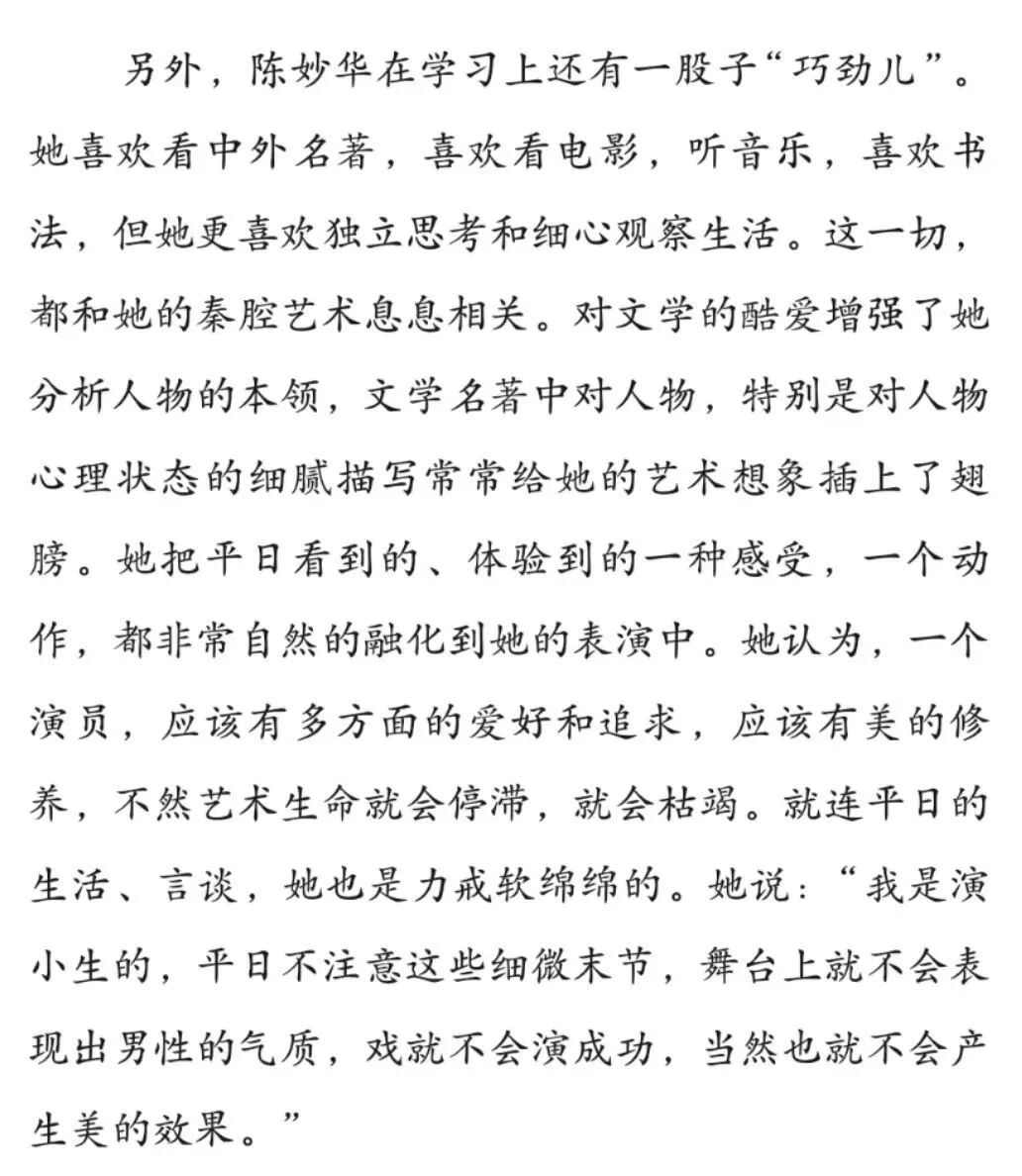 是啊,难怪不少观众都有这样的感觉,看了陈妙华的戏,总是得到一种美的享受。也有许多外地同志曾这样讲:“原来对秦腔不了解,也不大喜爱,但是看了陈妙华的表演以后,对秦腔这门艺术不但有所了解,而且还产生了感情。”