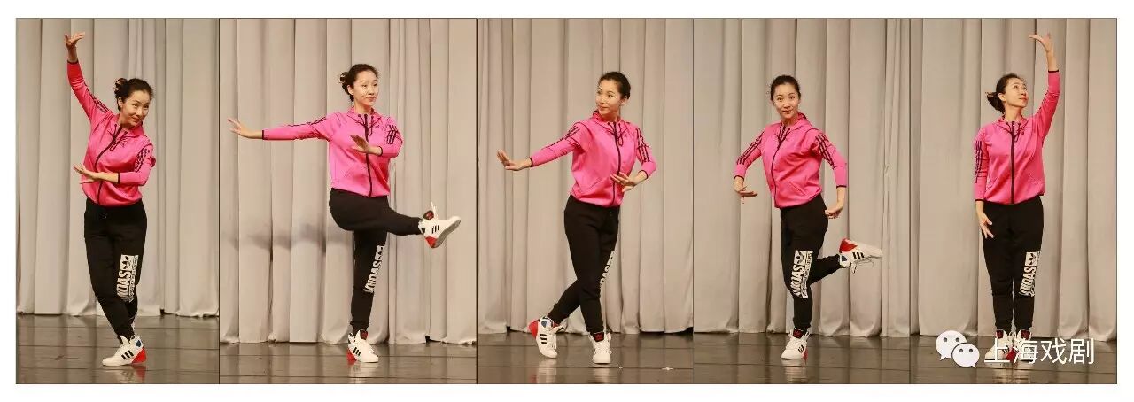 第三节:步法运动。主要化用中国戏曲身段的“蹉步”“花梆步”“弓箭步”等动作程式。