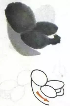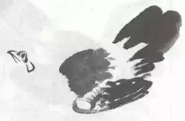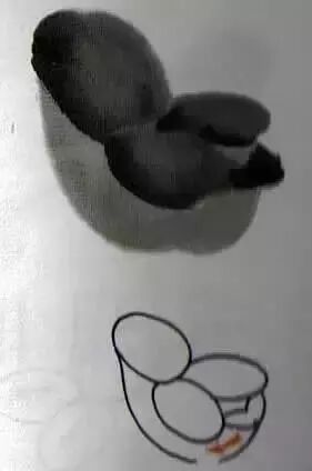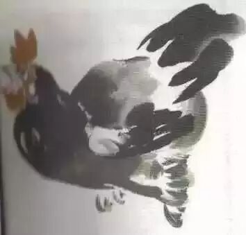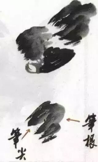 用浓墨画出头和颈要注意构图,用笔要活,不能用笔平涂,可是当留些飞白。见下图: