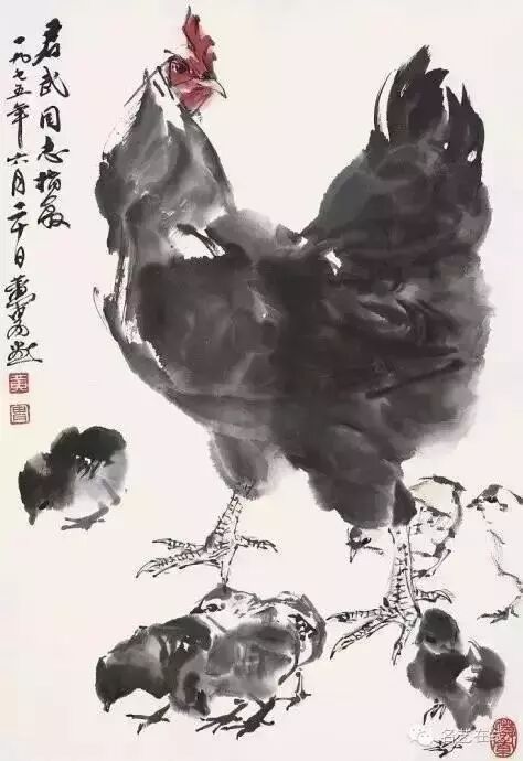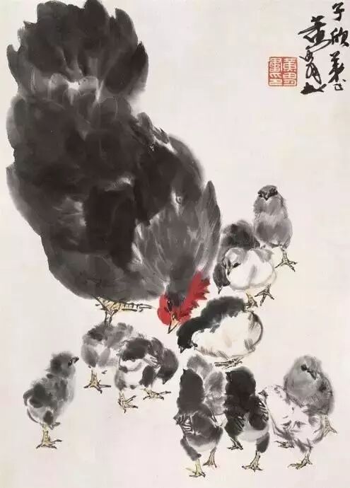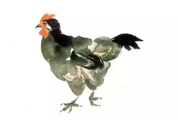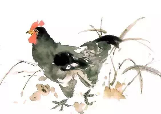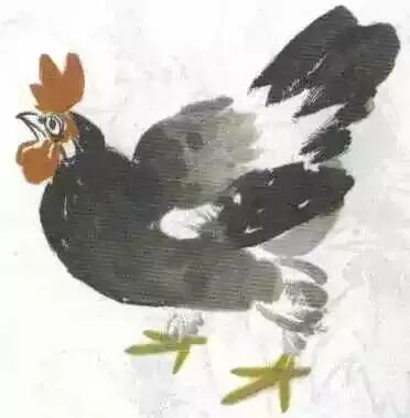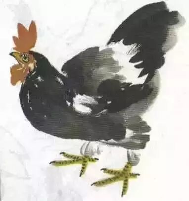 用小笔浓墨勾画嘴、眼,再用橙黄罩染嘴。颈部、背部、腹部、翅膀、腿、尾部及尾羽可用大笔墨色或赭黄色勾画。注意用墨或用色彩画时,要有浓淡变化,色彩搭配要合理,用笔准确,有层次感。鸡冠和肉垂用曙红色罩染。爪用小笔浓墨勾,再用藤黄罩染。创作母鸡作品时,应多与小鸡、草地搭配。