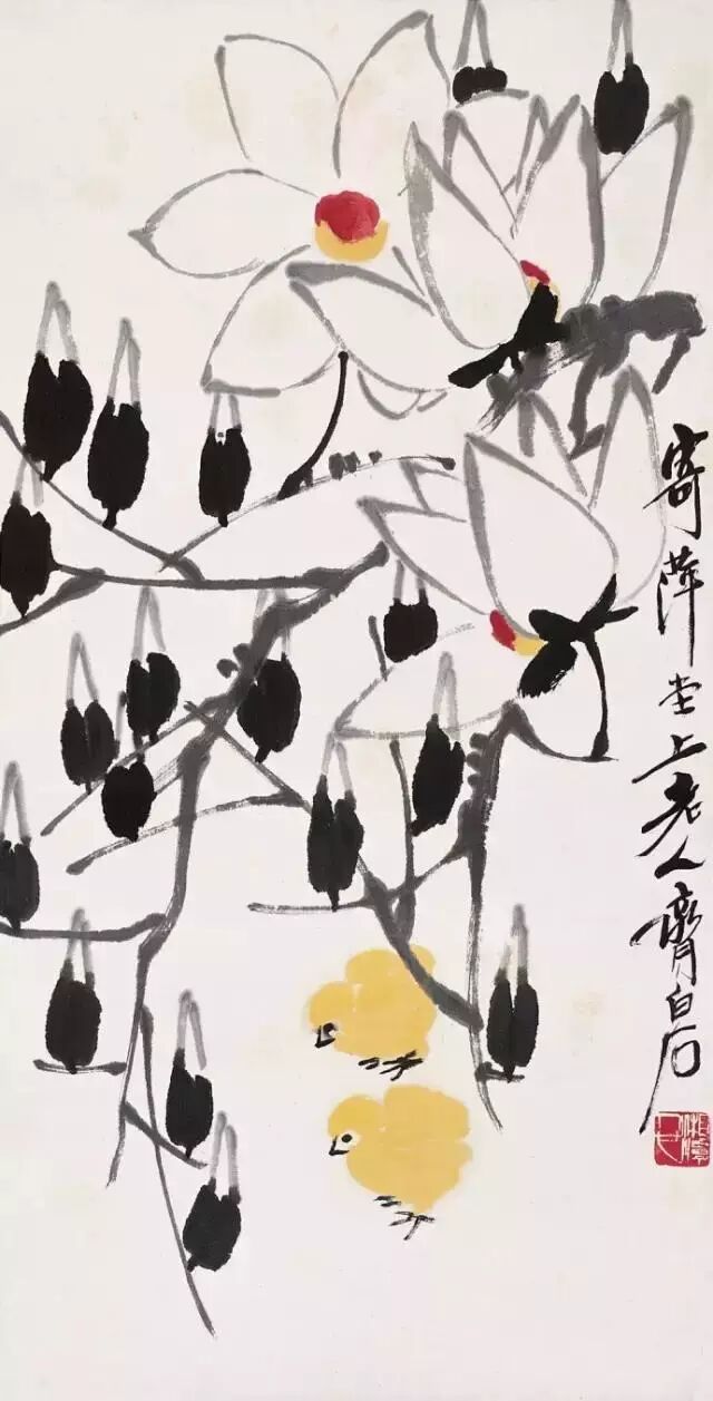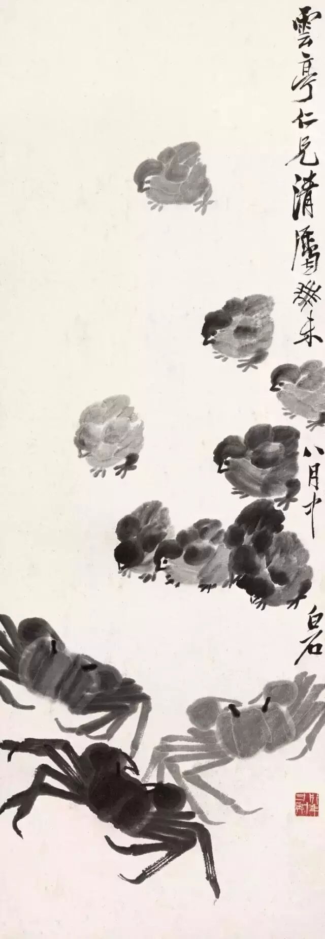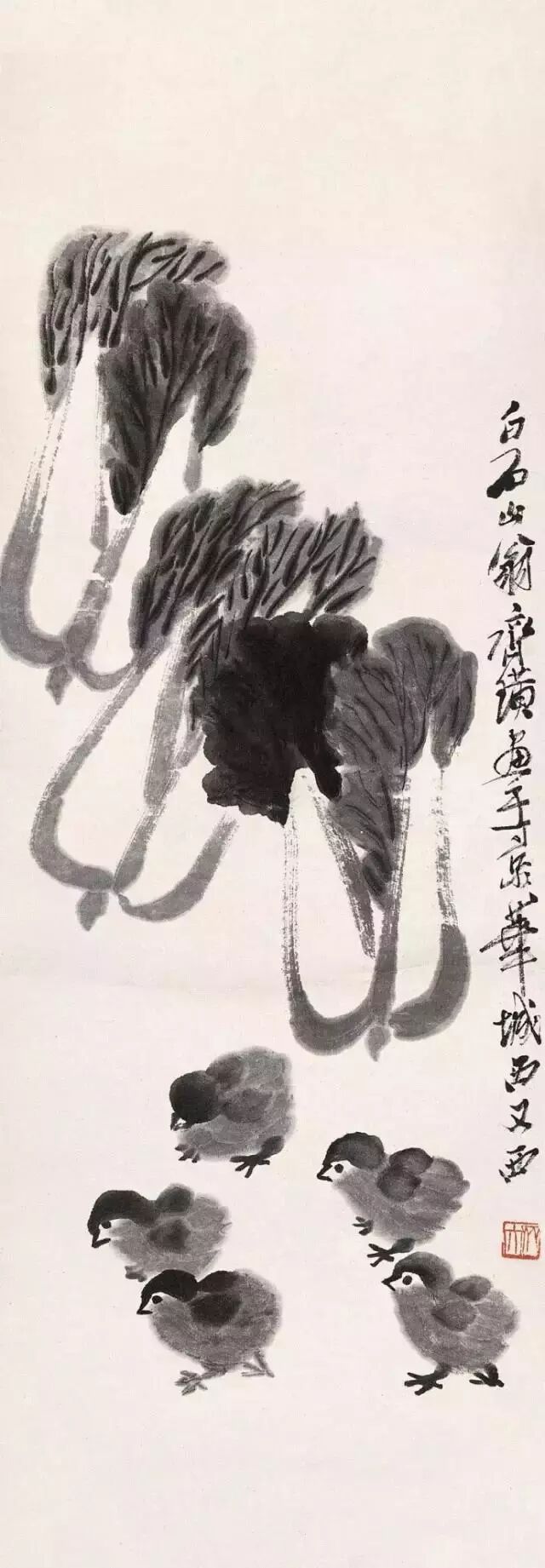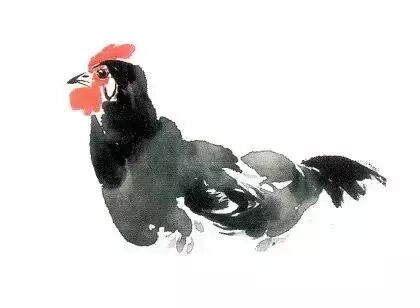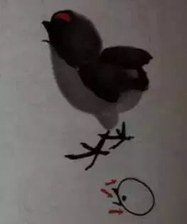 点嘴和眼和小飞羽及冠子用焦墨画嘴(短而宽)眼和小飞羽,最后用浓墨朱砂点小鸡冠子,一只小鸡就完成了。
