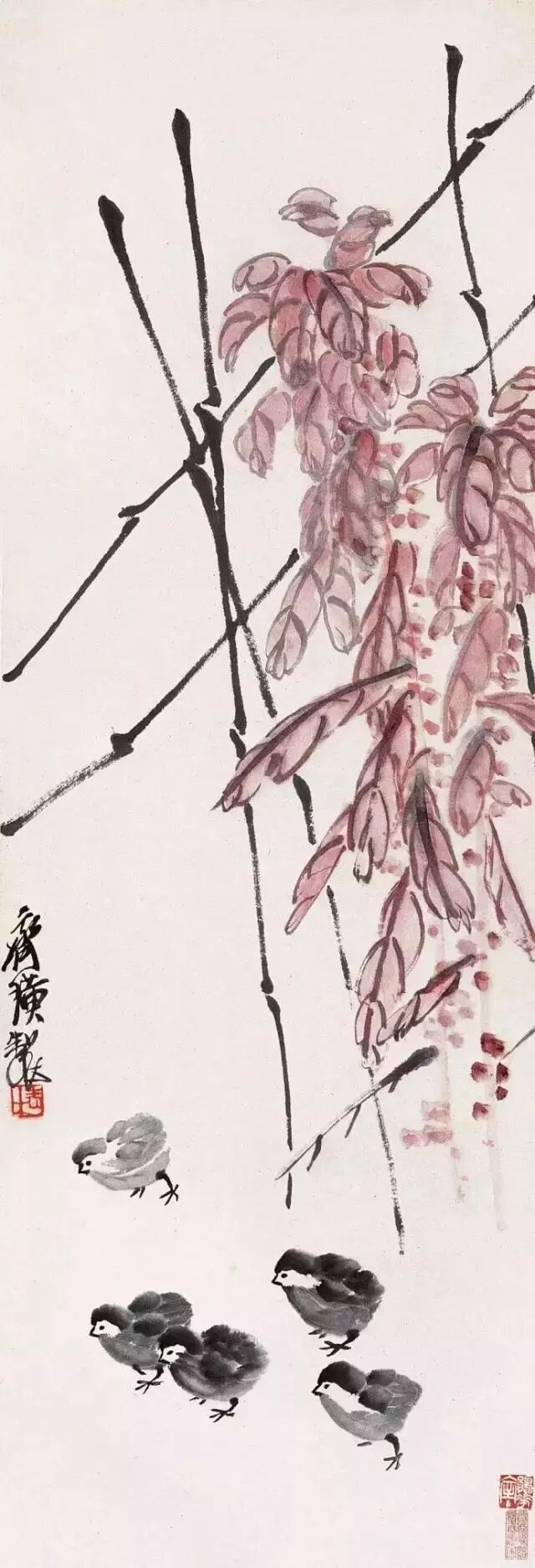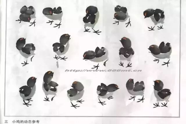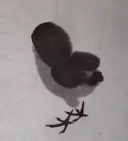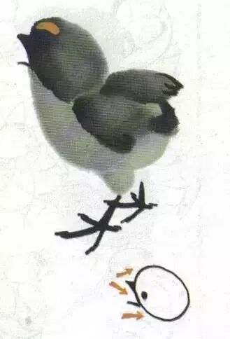 画大腿 用浓墨由腹部斜向后画一笔。画小鸡的小腿用小笔(小白云或叶筋笔)蘸焦墨,向斜前方画小腿用笔由细到粗。