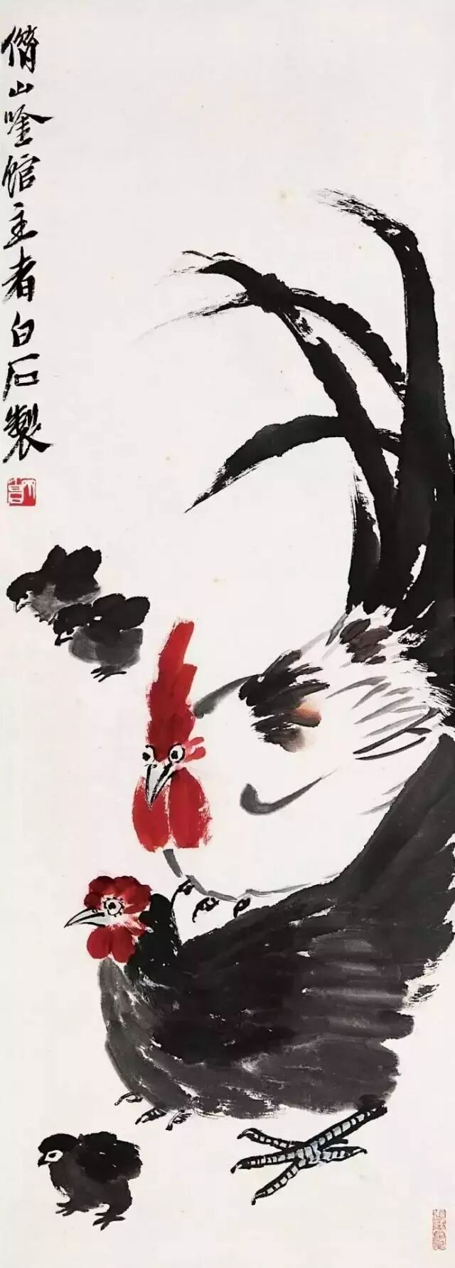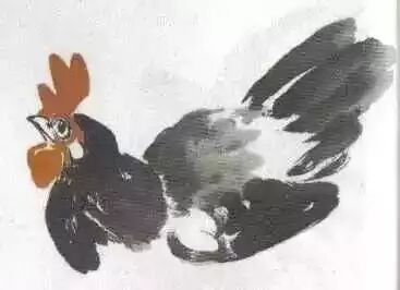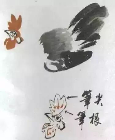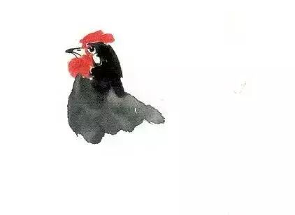 用大笔浓墨画头、嘴和眼,用曙红点鸡冠和肉垂。