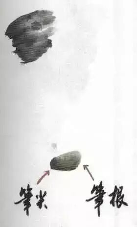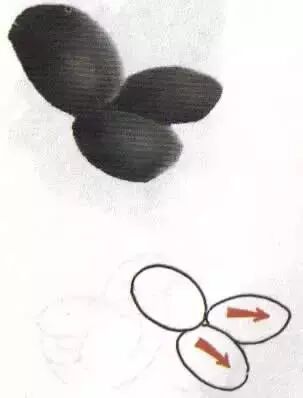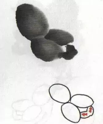 一笔点出头部,用中等大小的笔(如大兰竹、大白云)调中等墨色,笔尖上略浓,侧锋点出。