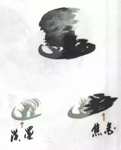 再用较淡较干的墨画出翅膀外行和复羽部分,行笔要快,用笔要灵活,在用焦墨画出飞羽。见下图: