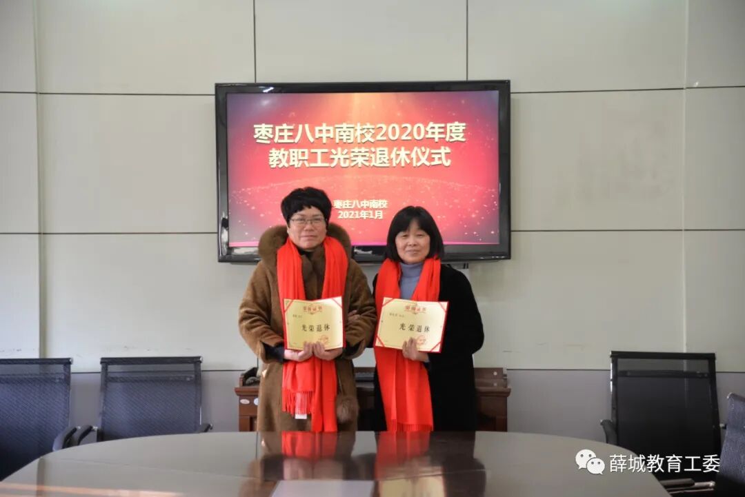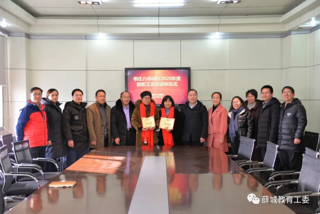 1月 枣庄八中南校13日,枣庄八中南校举行教师荣退仪式。常务副校长董华、副校长高庆堂、姬广飞等校领导、青年教师代表共聚一堂为潘颖、蒋凤英老师举行荣退欢送仪式。活动由工会主席张玉宾主持。