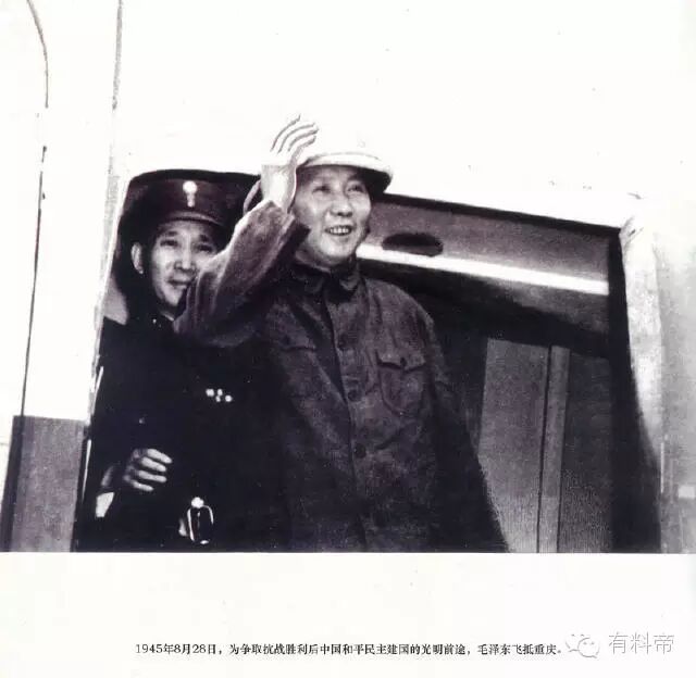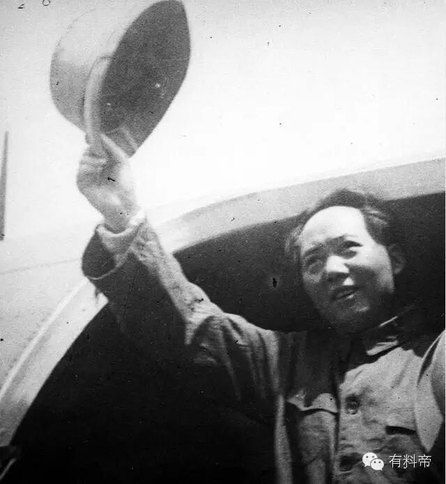图为1945年,毛泽东赴重庆谈判前在飞机舱口向欢送的人群挥手告别。