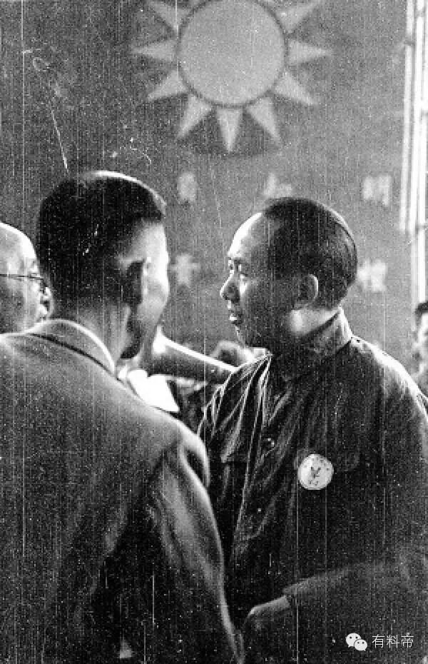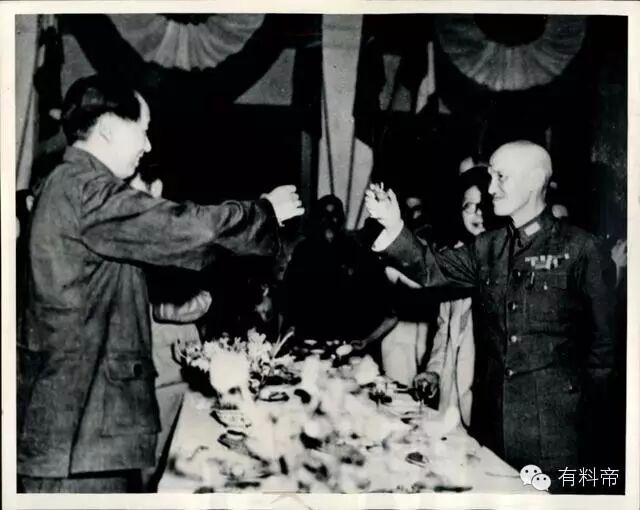 图为1945年重庆谈判,毛泽东出席抗战胜利庆祝酒会,与蒋介石在宴会上敬酒致意。