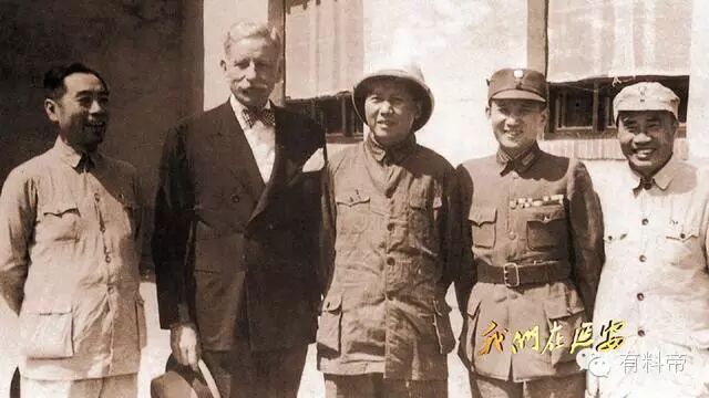 毛泽东赴重庆谈判前,与周恩来、赫尔利、张治中、朱德合影。