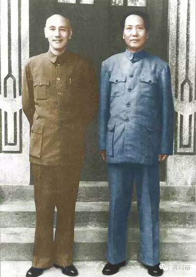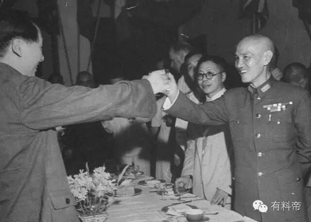 图为1945年,重庆谈判期间毛泽东与蒋介石合影。