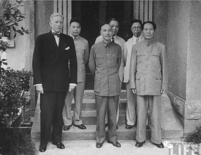 1945年,重庆谈判期间,(左起)毛泽东、美国驻华大使赫尔利、蒋介石一起合影。