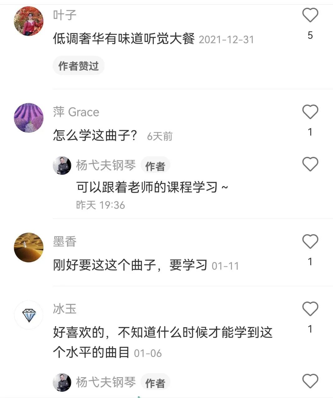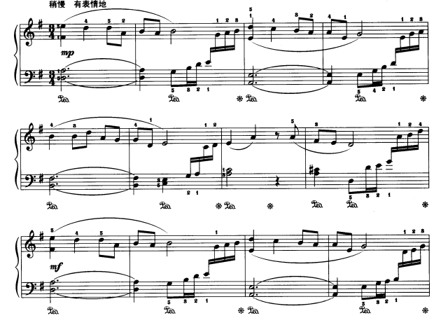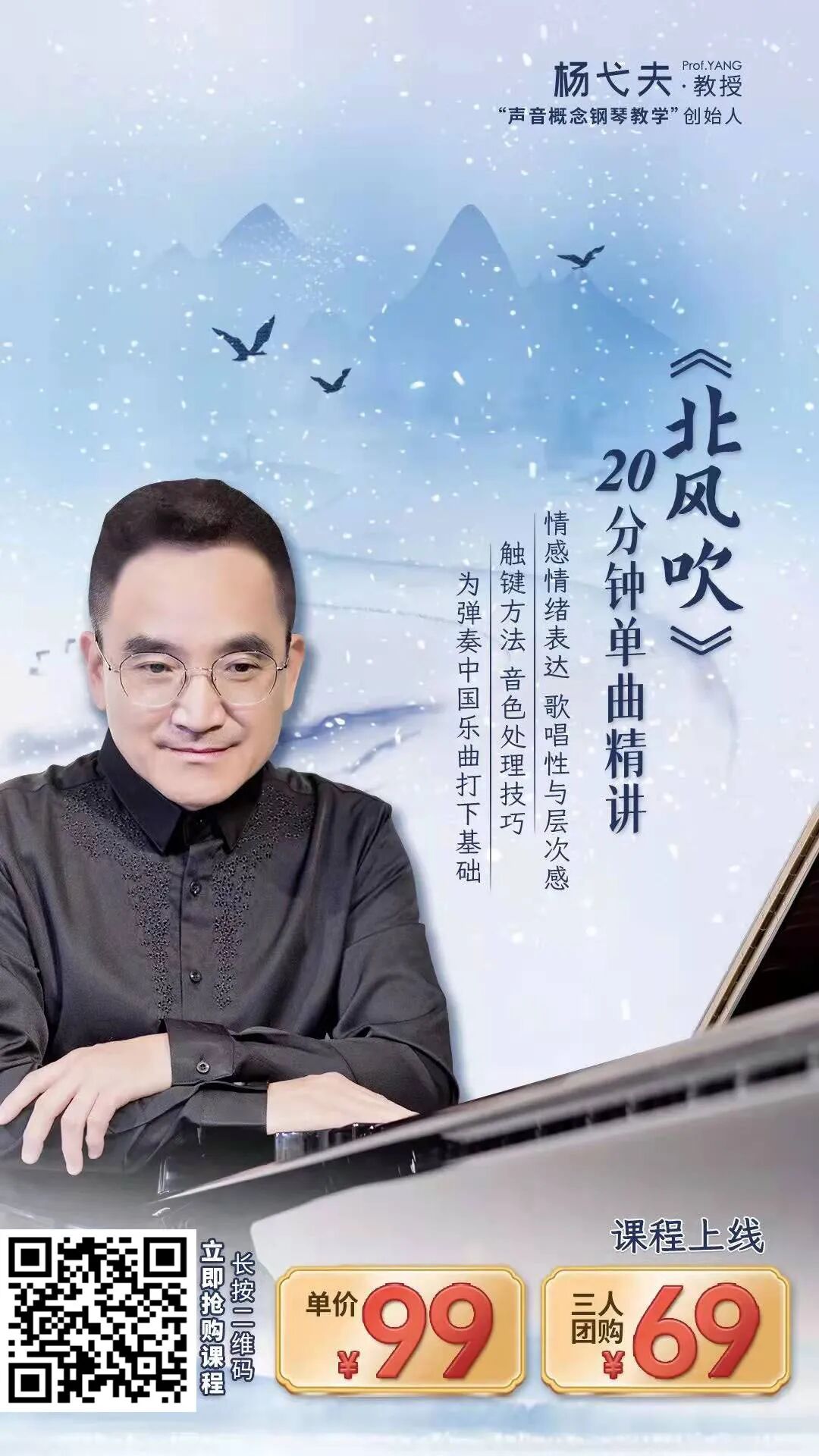 前段时间,新中国电影事业开拓者之一、我国著名表演艺术家田华老师与2022届中央戏剧学院毕业班的学生一起登上了北京卫视春晚,共同追忆峥嵘岁月。 (视频来源网络) 说到田华老师,很多人第一时间就会想到白毛女。可以说,在现在四五十岁的一代中国人中,田华和白毛女已经成为一种记忆的符号,深刻地印在了脑海中。 《白毛女》这个故事起源于晋察冀边区白毛仙姑的民间传说,1951年被拍摄成电影《白毛女》在全国上映,取得了空前的成功。曾在全国25个大城市的155家影院同时上映。据统计,首轮上映时,观众达600多万人次,单日观影人次高达47.8万余人次,创下了当时中国影片的最高票房纪录。 不仅电影和一众主演一炮而红,电影的插曲配乐也是成为经典、广为流传。比如主题曲《北风吹》就是其中的代表作。 由于电影《白毛女》的空前成功,此后还陆续诞生了京剧和芭蕾舞剧版本的《白毛女》。各版本也对经典主题曲《北风吹》进行了改编,像我们今天常听到的钢琴独奏曲《北风吹》就是谭露茜根据芭蕾舞剧《白毛女》选段所改编的。 学钢琴的朋友对这首曲子应该并不陌生,《钢琴基础教程2》和《中央音乐学院钢琴考级教程》都有收录这首曲子,可以说是钢琴学子们一定会接触到的中国乐曲之一。 那么这首曲子应该如何弹奏呢?有哪些技术要点和细节要把握呢? 针对这首经典乐曲,具有四十余年钢琴教学经验的杨弋夫教授专门制作了《北风吹》钢琴曲20分钟单曲讲解教程,详细讲解这首中国乐曲的弹奏要点与技巧,用20分钟教会你“琴情合一”,用指尖生动演绎这个家喻户晓的中国经典故事。 杨弋夫教授 “声音概念钢琴教学法”创始人 福建省音乐家协会副主席 福建省钢琴协会会长 国家文旅部文化行业专业能力评价体系钢琴演奏专业委员会委员 德国汉诺威音乐与语言中心特聘教授 福建神学院圣乐系教授 多次担任全国性钢琴比赛的评委及德国柏林、美国费城、新加坡、韩国、台湾、奥地利、香港等国际艺术节钢琴大赛评委 杨教授开创了“声音概念钢琴教学法”,多年来始终坚持“音乐为本,声音为主,概念先行,琴情合一”的教学理念。这样以声音为主的教学方法,对于演绎《北风吹》这样故事性的乐曲具有极大帮助。 《北风吹》此乐曲曲式结构为ABA三部曲式,共四部分。乐曲描绘了活泼、可爱、天真、纯朴的喜儿与男主人公大春之间纯真的爱情故事,表现出了人民解放后喜悦的心情和对未来美好生活的 ▲第一部分为引子加三个段落,旋律优雅,节奏自由。右手为颤音,弹奏时可以由慢到快,落下时适当延长;左手是和弦琶音弹奏,双手交叉要注意弹奏均匀。由于这部分拍子自由,所以弹奏者可以根据自己对曲子的理解进行适当改动。 ▲主题部分第一段亲切、优美,表现出了主人公喜儿淳朴、美丽的形象。这部分曲调舒缓,注意两个声部,衬托主题的声部要弹奏得轻巧、干净,同时注意声部的呼应。这部分旋律重复,在音色处理上要注意对比:第一遍声音要亮、集中且轻透,第二遍的声音要加厚。 ▲此段描绘的是男主人公“大春”的人物形象,所以在弹奏上要坚定、有精神、有力量。这部分要注意的是,虽然是三拍子的弹奏,但是不能进行圆舞曲式的演绎,强调每句的第一拍,弹出力量感。同时加强左手的和声练习。 ▲接下来又回到主题,与第一段的主题相比,这部分的演绎要更加热情,弹奏较之前更明亮,音色更通透。但在弹奏低八度时,又要加强厚度,与之后较为欢快活泼的旋律要衔接自然。技术上,利用臂重,运用一些连奏的弹法让旋律更连贯,注意指尖触键敏捷、灵活,有跳跃性,表现出对未来美好生活的憧憬。 课程片段试看 ↓↓↓ 全曲技术点讲解示范 扫描下方海报获取 ↓↓↓ !!课程超值优惠!! 20分钟经典名曲 《北风吹》详解教程 名师指导、永久回看 原课程总价:99元 现拼团价仅需:69元! 1、掌握《北风吹》的弹奏重点与技巧。 2、学会如何更好的把握乐曲的故事性。 3、为之后的中国乐曲学习打好基础。 1、 40年大师级钢琴教授独家教学并亲自弹奏示范,让学员快速掌握《北风吹》弹奏技巧。 杨弋夫教授坚持长期一线教学,积累了几十年的专业经验,他的系统化教学,可以让你获得最精髓的学习要点。光这些学习要点,就已经价值上万元。 2、课程内容通俗易懂,乐曲分段全面解析 真实还原上课状态,将乐曲分段逐一分析讲解,分段解释弹奏重点,让学生听得更明白,理解得更透彻,观摩得更清楚,学得更轻松。 3、双机位展示演奏状态与指法技巧,教学更直观,学的更快捷 双机位展示老师弹奏的动作要领,你能够更加直观地发现自己的问题,查缺补漏。 课程一上线就收获了众多学员的好评 ↓↓↓ !!课程超值优惠!! 20分钟经典名曲 《北风吹》详解教程 名师指导、永久回看 原课程总价:99元 现拼团价仅需:69元! *声明:本文部分图片来源于网络 Q. 购买后就马上可以学习吗? A:是的,购买后马上可以学习。课程共 1 个课时,永久保存,课程学习不限时间、不限次数,可反复观看学习. Q. 购买后如何开始学习? A:关注微信公众号 “音乐生活馆课程订阅”,在菜单 “我的已购” 中能查看到你购买过的课程,打开课程随时学习。![]()