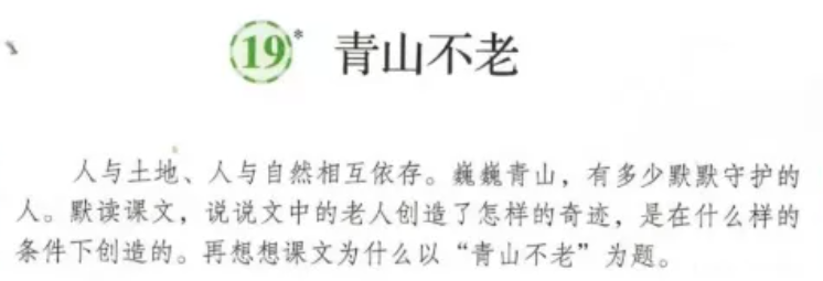 然不是这样浅显,肯定还有其他所指。那什么不老呢?和“青山不老”意思相近的词语有“万古长存”等,与“青山不老”结构相近的词语有“精神不朽”等,这样拓展,有助于你理解课文内容与中心。课文讲述了一位山野老农,面对自然条件的恶劣和生活条件的艰苦,义无反顾地用十五年时间,奇迹般创造出一块绿洲的感人故事,赞美了老人崇高的精神境界和不朽的生命意义。人与土地,人与自然相互依存。巍巍青山,有多少默默守护的人。默读课文,说说文中的老人创造了怎样的奇迹,是在什么样的条件下创造的。再想想课文为什么以“青山不老”为题。导读里有三个问题,用①②③标出来,阅读时,要想着、找到这三个问题的答案。