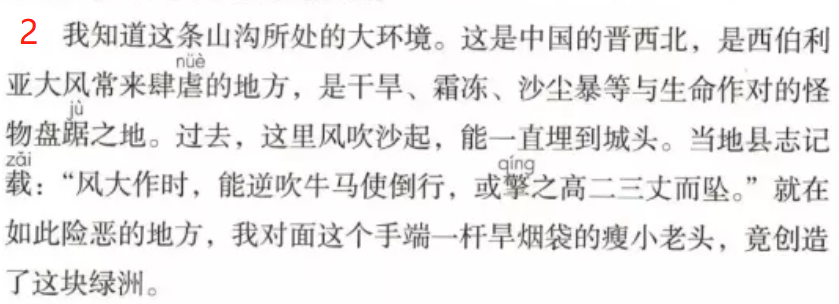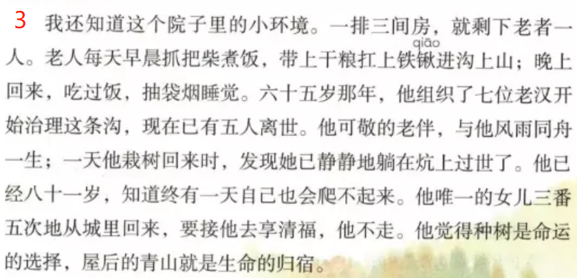 1.“院子里的小环境”与上段“山沟所处的大环境”对比,烘托了创造绿洲的难度之大,奇迹之奇。2.小环境里,原来有七位老人,现在只有老者一人,创造绿洲的奇迹,就是这样的七位老人,这是多么让人震惊,背后有多少故事啊!3.这一段,告诉读者默默付出背后的三件大事:五位老汉离世,老伴静静过世,女儿三番五次接他走遭拒。