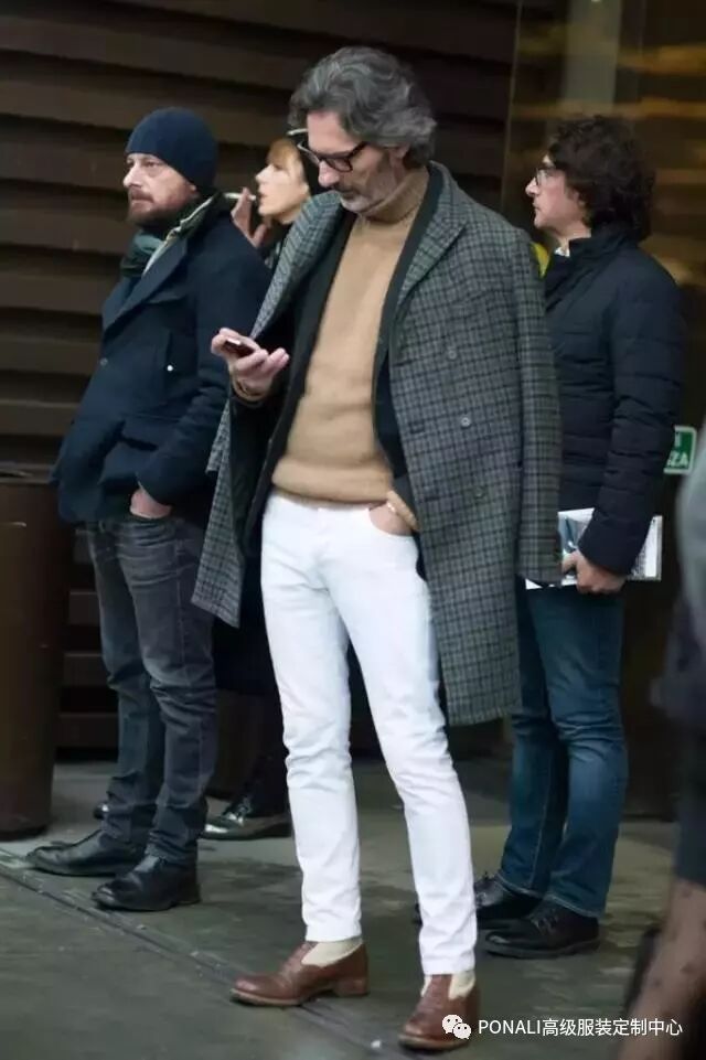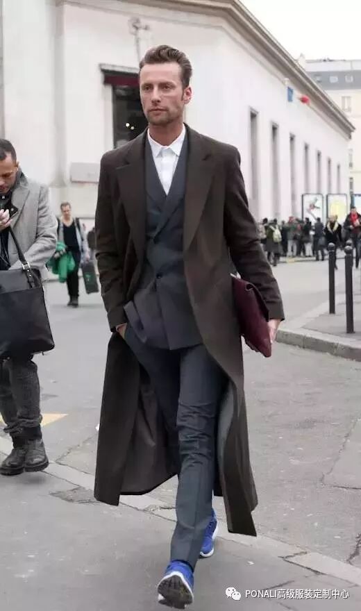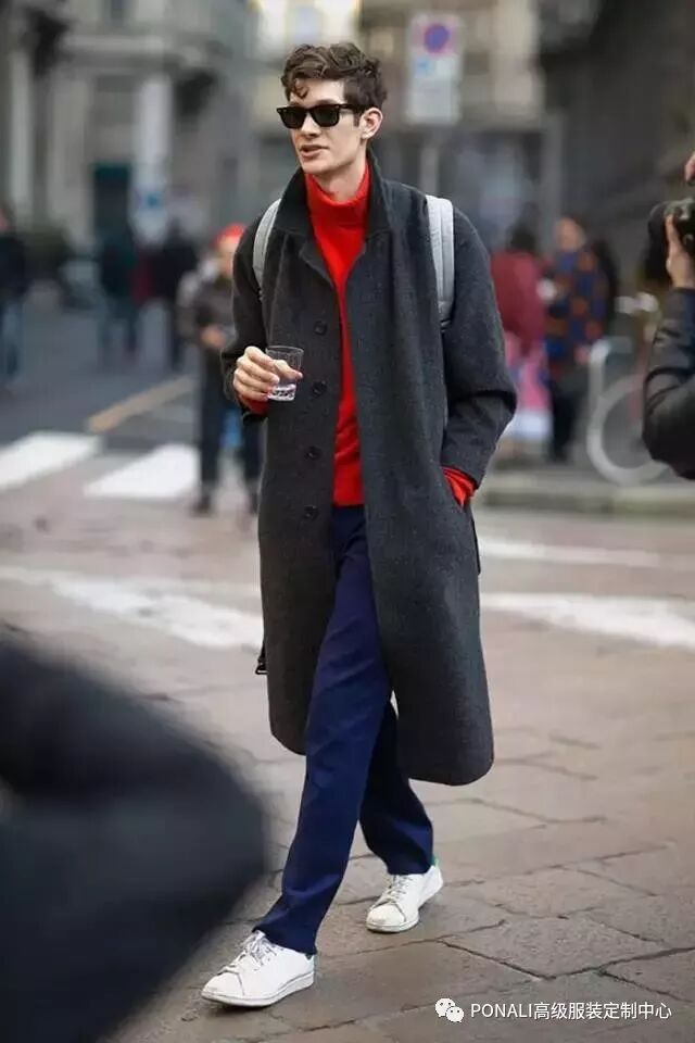 大衣的颜色最好与西装的颜色形成一定反差,这样看起来才不会过于沉闷和严肃。