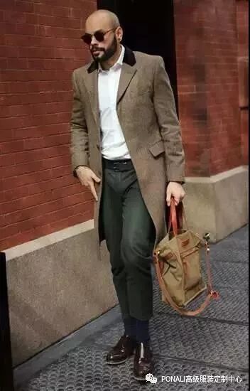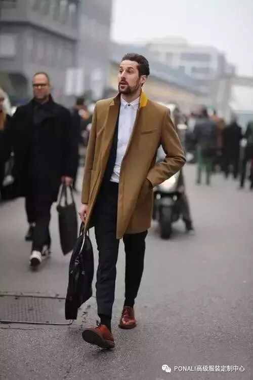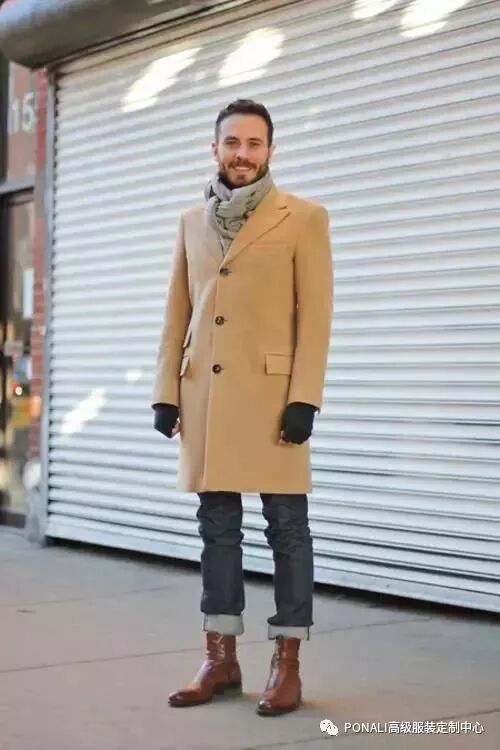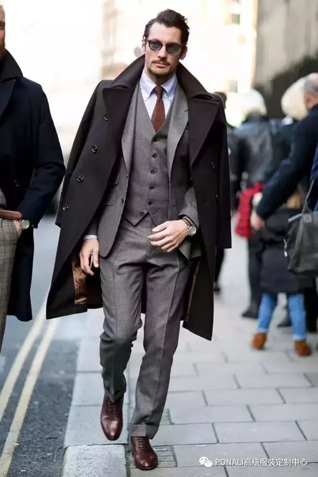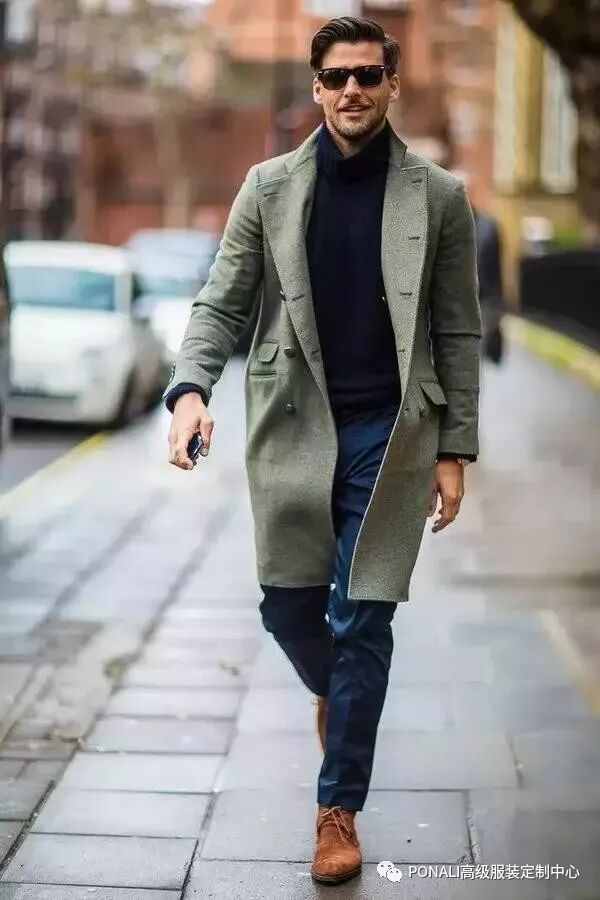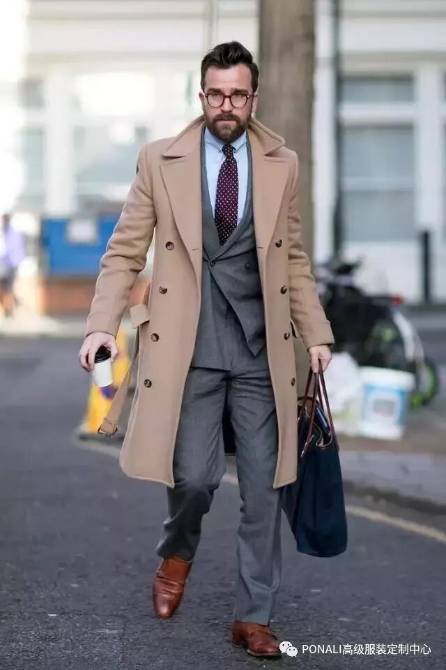 大衣与西装搭配,是比较商务的穿法,适合优雅 与硬朗并重的熟男。