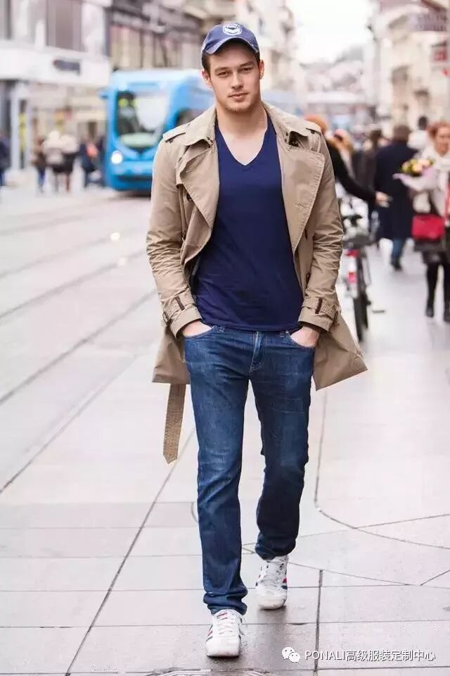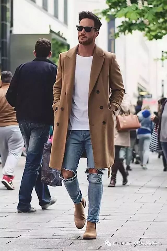 这种穿法比较适合年纪没大么大的男生。简单休闲的T恤化解了大衣的正式和厚重,看上去会比较有活力。