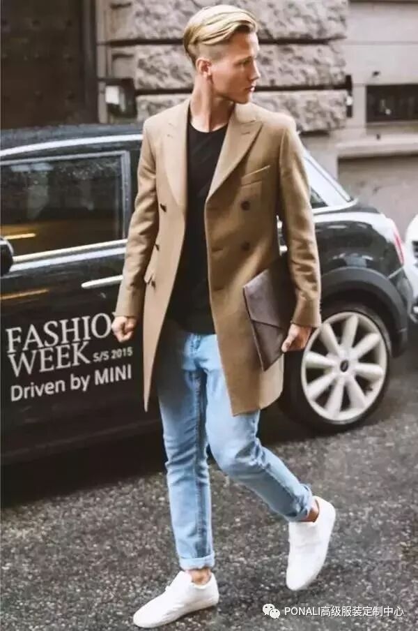 驼色风衣或大衣,内搭纯色T恤,搭配牛仔裤和sneaker,冬日也能穿出青春活力。
