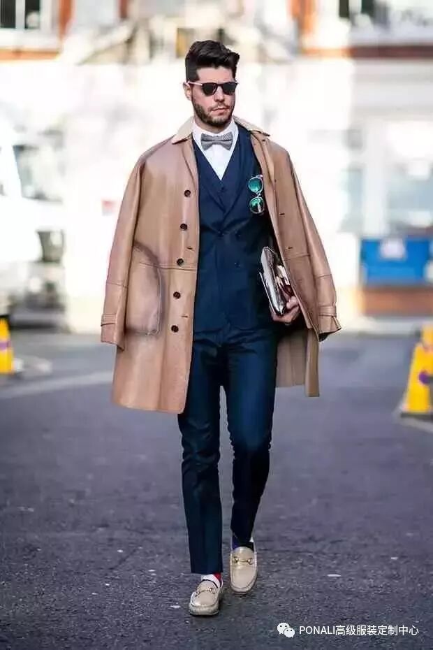 擦色的皮大衣搭配蓝色三件套西装,加上讲究的配饰,这样大胆又别致的搭配,足够让你吸引 路人的眼球。