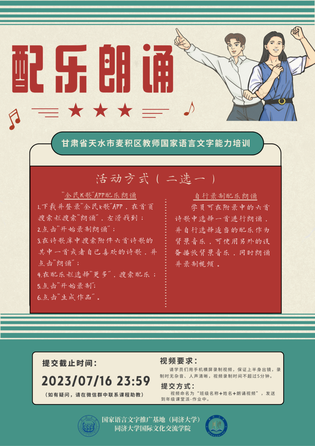 同济-甘肃省天水市麦积区教师语培项目 配乐诗朗诵“配乐诗朗诵”活动圆满结束 国家语言文字推广基地(同济大学)对口甘肃省天水市麦积区基层教师语言文字能力培训项目自6月10日正式启动以来,已经进入语段表达的训练阶段。作为该阶段训练的有效辅助,本次培训趣味活动系列之二:“配乐诗朗诵”为培训内容增加了语言诵读之美。来自麦积区一百位学员老师在优美的音乐声和朗朗的诵读声中,为本次“配乐诗朗诵”活动圆满画上了句号,更为这个炎炎夏日注入了一丝“诗意清凉”。 朗诵是一种口语交际的重要形式和传情艺术,是朗诵者把文学作品转化为有声语言的再创作、再表达的艺术活动,而诗歌朗诵更是基于了诗歌本身强烈真诚的文学表达。因此,“诗朗诵”活动是一次极好检验和呈现学员老师们近阶段学习成果的方式,也充分体现了国家语言文字推广基地(同济大学)致力于丰富培训内容,并赋予培训内容多元化、多形式、广参与的特点,最大化提升培训效果,充分展示学员学习风采。 “配乐朗诵”活动是由同济大学国际文化交流学院的培训团队组织并策划,近百位甘肃天水麦积区学员老师积极参与的一次趣味活动。 该活动为学员们精选了六首古今中外经典诗歌佳作,充分涵盖了不同体裁、内容、情感表达等要素,学员可选择其中之一并配以合适的背景音乐,录制成视频作业提交。各班级任课老师和助教对每一份视频作业点评打分,并选出班级优秀作品,由培训团队制作成合集,充分展示学员们的学习成果。 本次活动开展的目的是希望学员老师们能够在前一阶段字词发音的基础上,锻炼完整的语段表达,体会将文学作品赋予声音与情感的再创作的过程,同时提升语段表达中普通话的语音面貌。“以乐声作伴,听诗声琅琅”---配乐诗朗诵不仅能够实现培训效果,也增强了趣味性。 在甘肃麦积区学员老师们的积极参与下,朗诵视频作品非常丰富,各具特色。学员老师们各个寓情于言,以言抒情,言情交融,充分展示了诗歌朗诵的艺术与真诚! 配乐诗朗诵对学员老师们的语言表达提出了更高要求,不仅要做到吐字清楚、发音清晰,还要在把握诗歌节奏,在情感的基础上实现“生动表达”,以更好地传达诗歌的思想内容,引发听众们的共鸣。学员老师们在不断练习后,最终呈现出较为成熟的配乐朗诵作品,也借助此次活动切实感受到了诗歌的魅力。接下来,让我们跟着音乐一起走入学员老师们的“诗歌世界”中吧! 成果展示——古诗词朗诵 成果展示——散文诗朗诵 寓教于乐,融学于趣,化教于心。在本次“配乐诗朗诵”活动中,相信无论是同济大学的培训团队,还是甘肃天水麦积区的学员老师们都收获颇多,在一起交流感受、共享经验的过程中充分体会中国的语言文字魅力,感受诗朗诵在音乐中的艺术表达,一起携手共同进步! THE END 图文 | 施珍妮 校对 | 张蕾 排版 | 花泽楠![]()