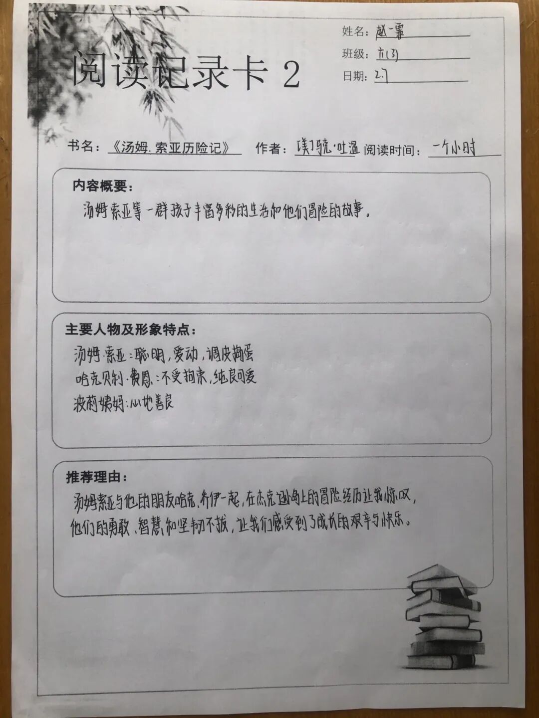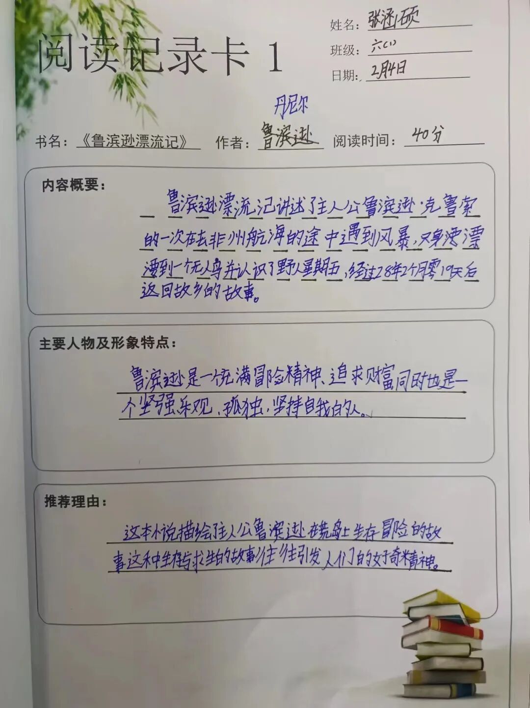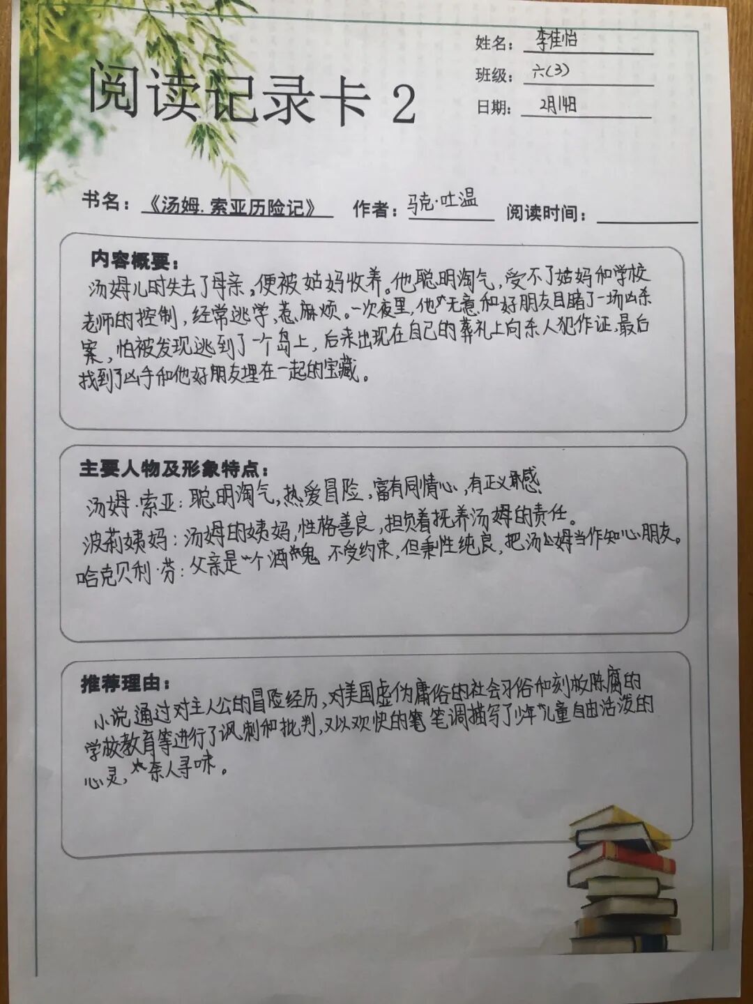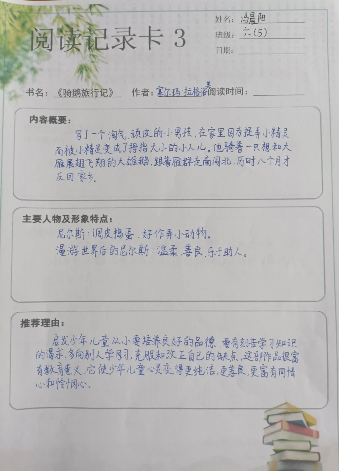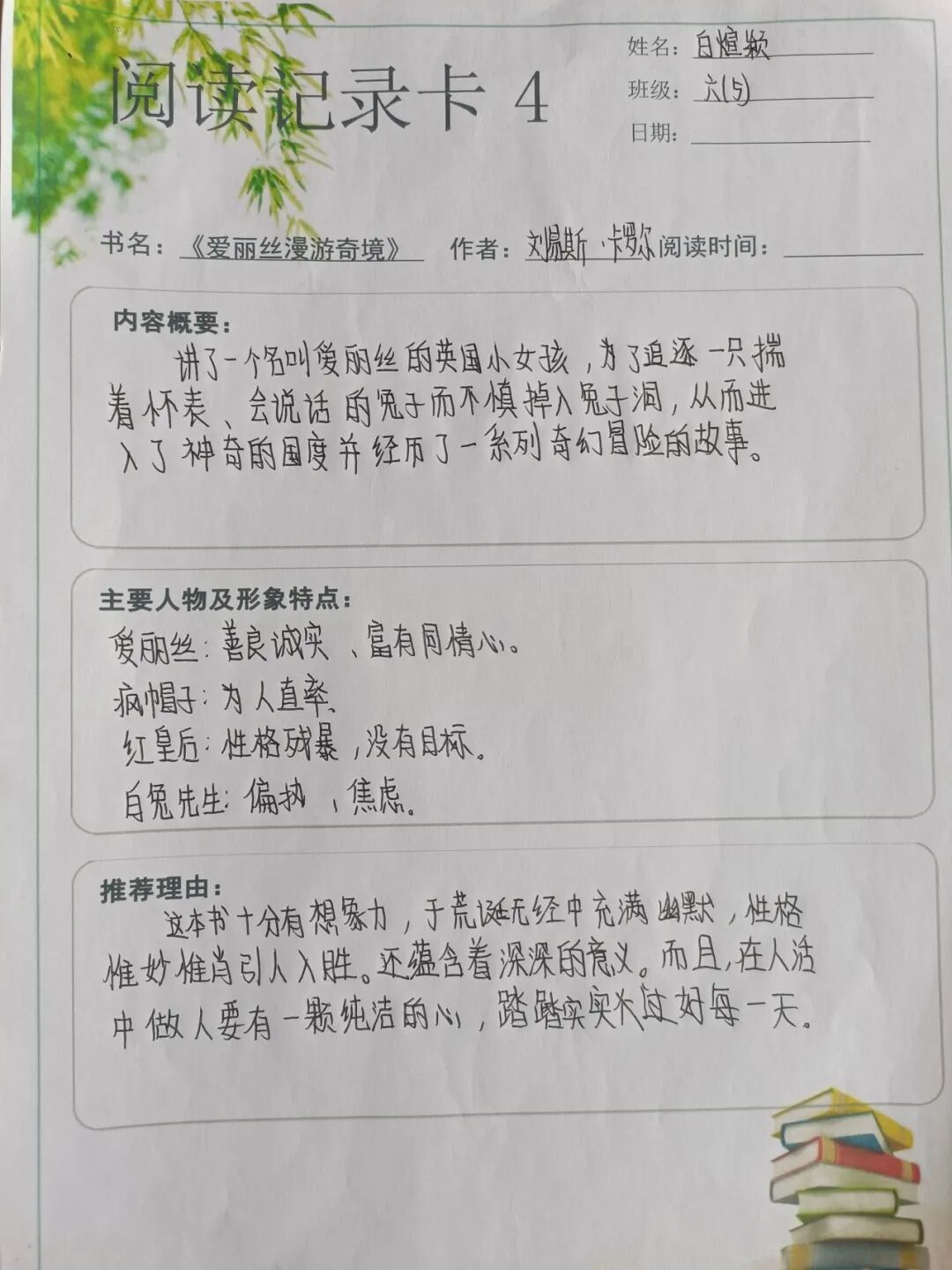 “立身以立学为先,立学以读书为本”。小学阶段是培养阅读习惯和阅读能力的黄金期,不仅要引导学生多读书、读好书,更要引导学生有效的读书。 针对六年级学情,六年级组语文教师站位学生阅读需求、阅读目标和阅读效果去考量,从内容概要、精彩语句、人物形象、印象深刻的情节以及读后感悟五个方面设计了阅读记录卡,引导学生在记录中积累,在记录中思考,在记录中感悟,在记录中成长。 一张张阅读记录卡让读书变得有深度有质感。孩子们在填写记录卡中加深了记忆、促进了理解、深入的感悟、有效的表达,从而更好地掌握书籍的精髓,提升阅读的能力和效果。同时,孩子们通过分享阅读记录卡,互相学习、交流、借鉴,形成了浓厚的阅读氛围。 六一班 六二班 六三班 六四班 六五班 六六班 本次阅读记录卡展示活动是学校书香校园系列活动的一个“缩影”,是持续助推学生阅读成长计划的一部分。学生们在享受中阅读,在阅读中成长,同时为书籍又增添了一道浓郁的书香。中心路小学学子将继续沉浸阅读、深入思考,让读书点亮心灵,书香润泽人生。 六一班:丁雯轩 卢悦宁 王岳新 任迪赫 张涵硕 六二班:张皓焱 张文约 李梓煊 吴筱萱 吕泽涵 六三班:张曼妮 李佳怡 肖雨菲 赵一霏 万乙儒 六四班:童话 周宸羽 徐国萱 殷思琦 马天阅 六五班:冯晨阳 刘浩泽 段童馨 白烜颖 佟思慕 六六班:杨佳昕 王子尧 姚钦帅 简立喆 李慕晨 供稿:黄珂 图片:六年级语文组 编辑:王凯红 责编:迟秋燕![]()