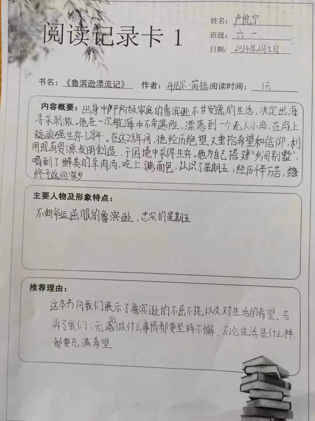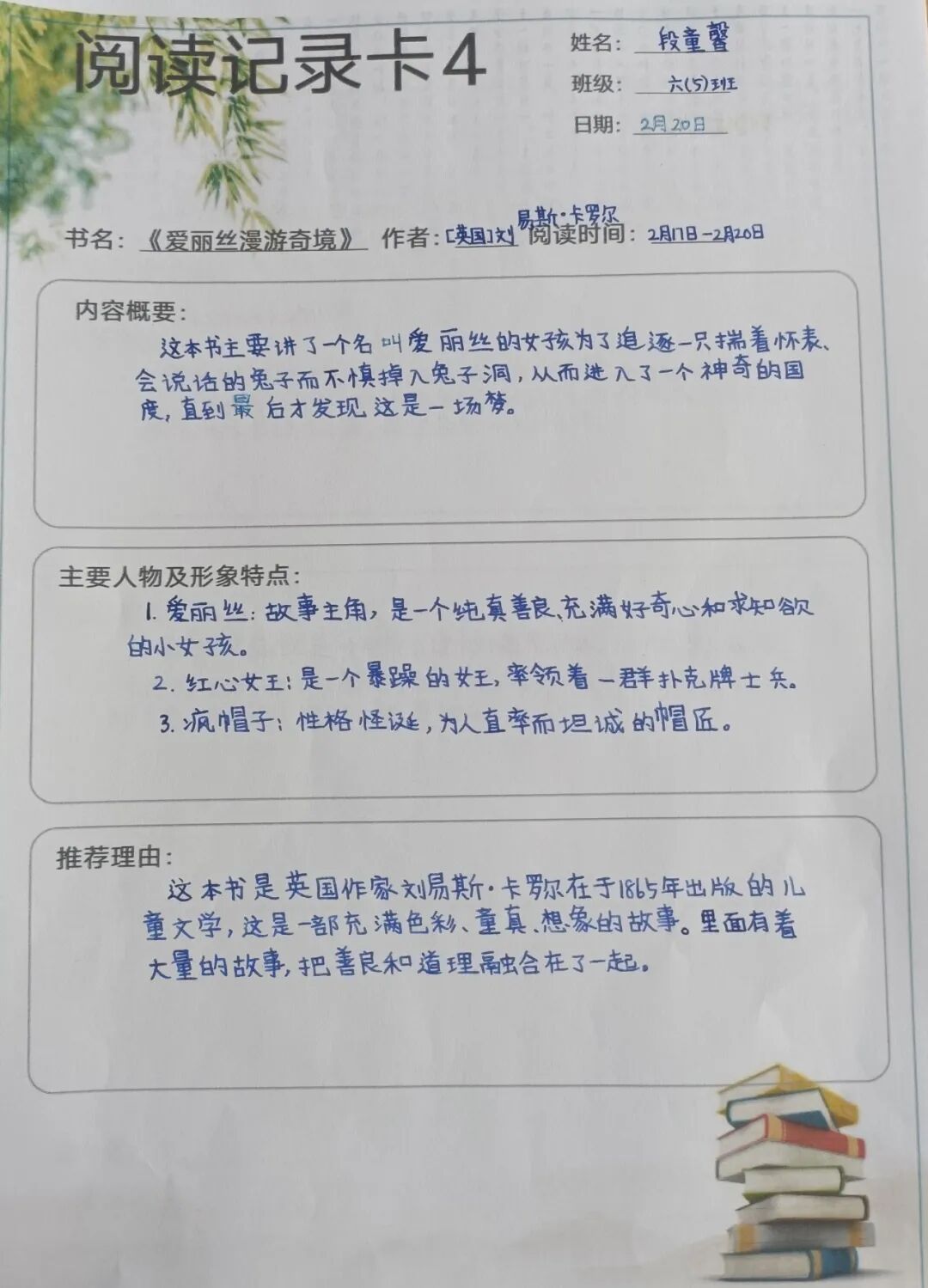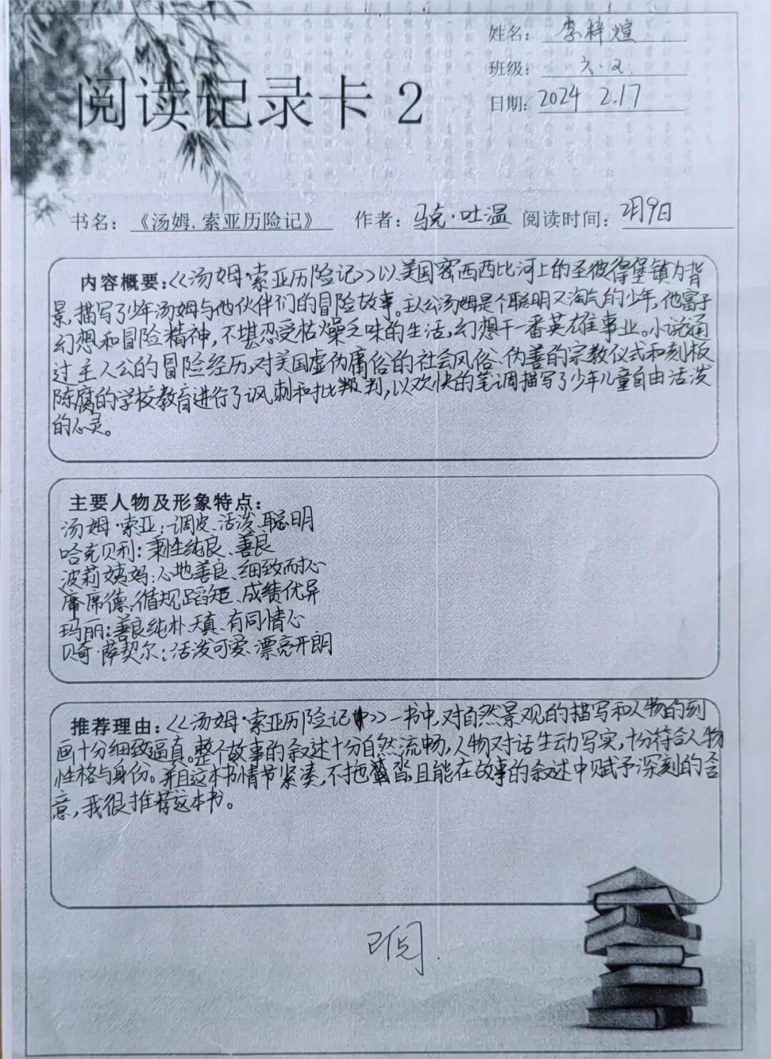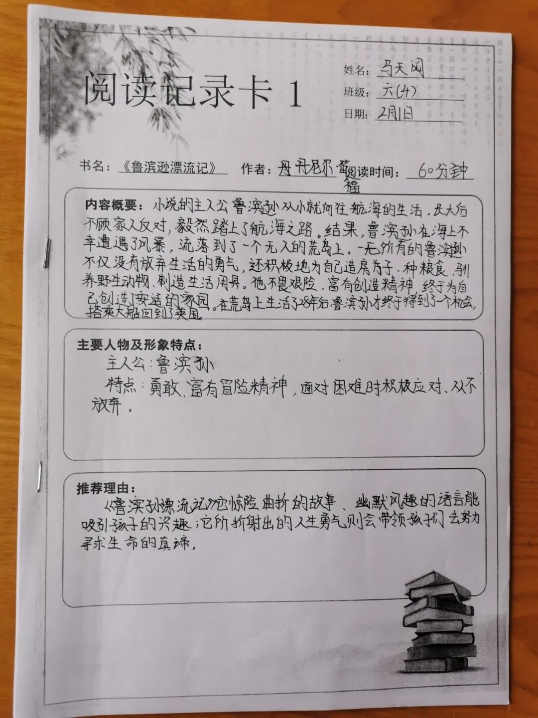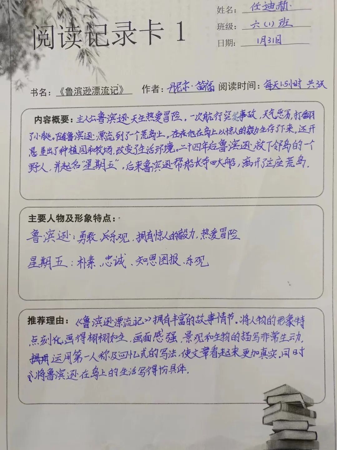 “立身以立学为先,立学以读书为本”。小学阶段是培养阅读习惯和阅读能力的黄金期,不仅要引导学生多读书、读好书,更要引导学生有效的读书。 针对六年级学情,六年级组语文教师站位学生阅读需求、阅读目标和阅读效果去考量,从内容概要、精彩语句、人物形象、印象深刻的情节以及读后感悟五个方面设计了阅读记录卡,引导学生在记录中积累,在记录中思考,在记录中感悟,在记录中成长。 一张张阅读记录卡让读书变得有深度有质感。孩子们在填写记录卡中加深了记忆、促进了理解、深入的感悟、有效的表达,从而更好地掌握书籍的精髓,提升阅读的能力和效果。同时,孩子们通过分享阅读记录卡,互相学习、交流、借鉴,形成了浓厚的阅读氛围。 六一班 六二班 六三班 六四班 六五班 六六班 本次阅读记录卡展示活动是学校书香校园系列活动的一个“缩影”,是持续助推学生阅读成长计划的一部分。学生们在享受中阅读,在阅读中成长,同时为书籍又增添了一道浓郁的书香。中心路小学学子将继续沉浸阅读、深入思考,让读书点亮心灵,书香润泽人生。 六一班:丁雯轩 卢悦宁 王岳新 任迪赫 张涵硕 六二班:张皓焱 张文约 李梓煊 吴筱萱 吕泽涵 六三班:张曼妮 李佳怡 肖雨菲 赵一霏 万乙儒 六四班:童话 周宸羽 徐国萱 殷思琦 马天阅 六五班:冯晨阳 刘浩泽 段童馨 白烜颖 佟思慕 六六班:杨佳昕 王子尧 姚钦帅 简立喆 李慕晨 供稿:黄珂 图片:六年级语文组 编辑:王凯红 责编:迟秋燕![]()