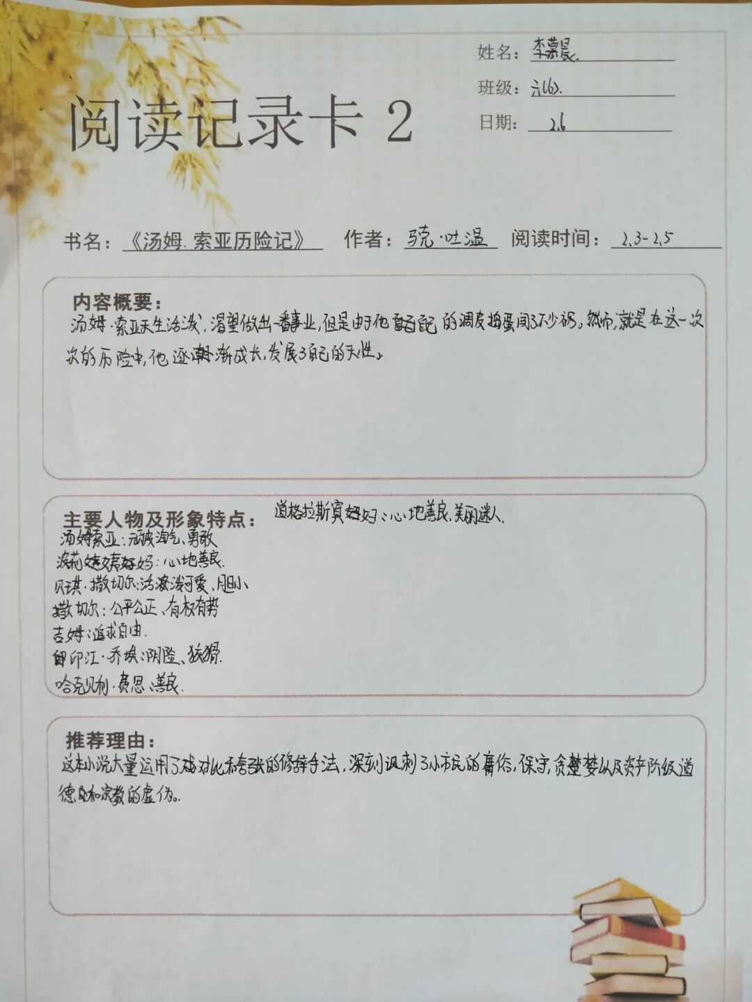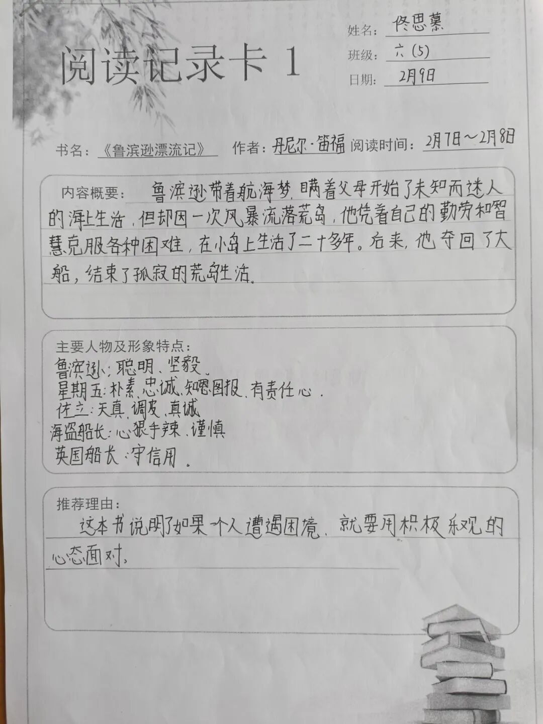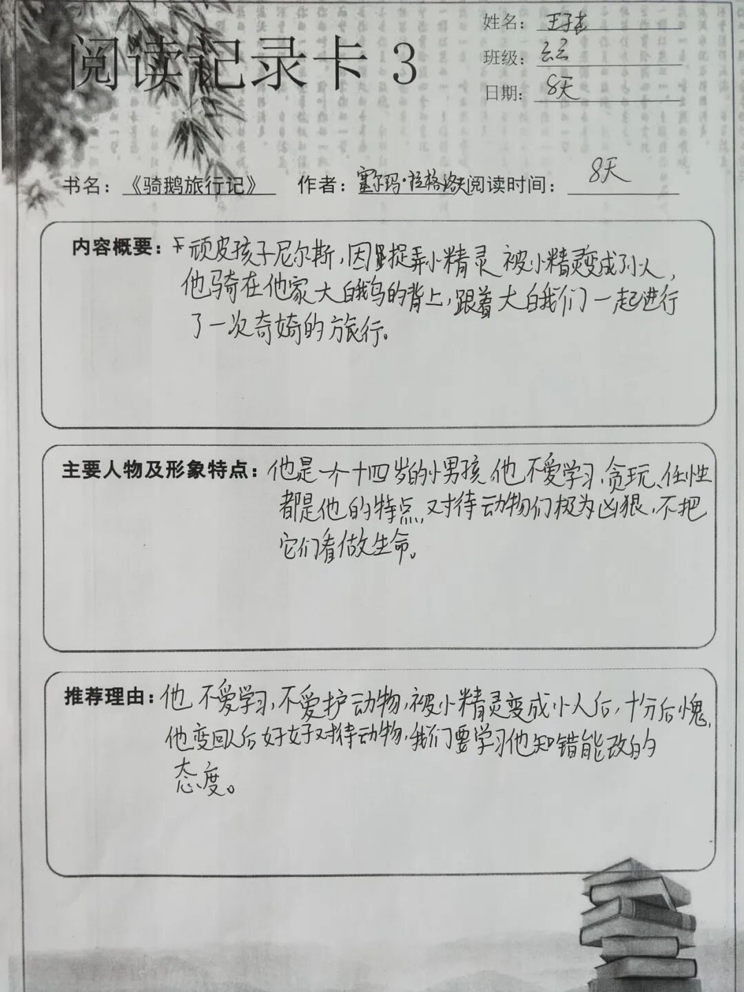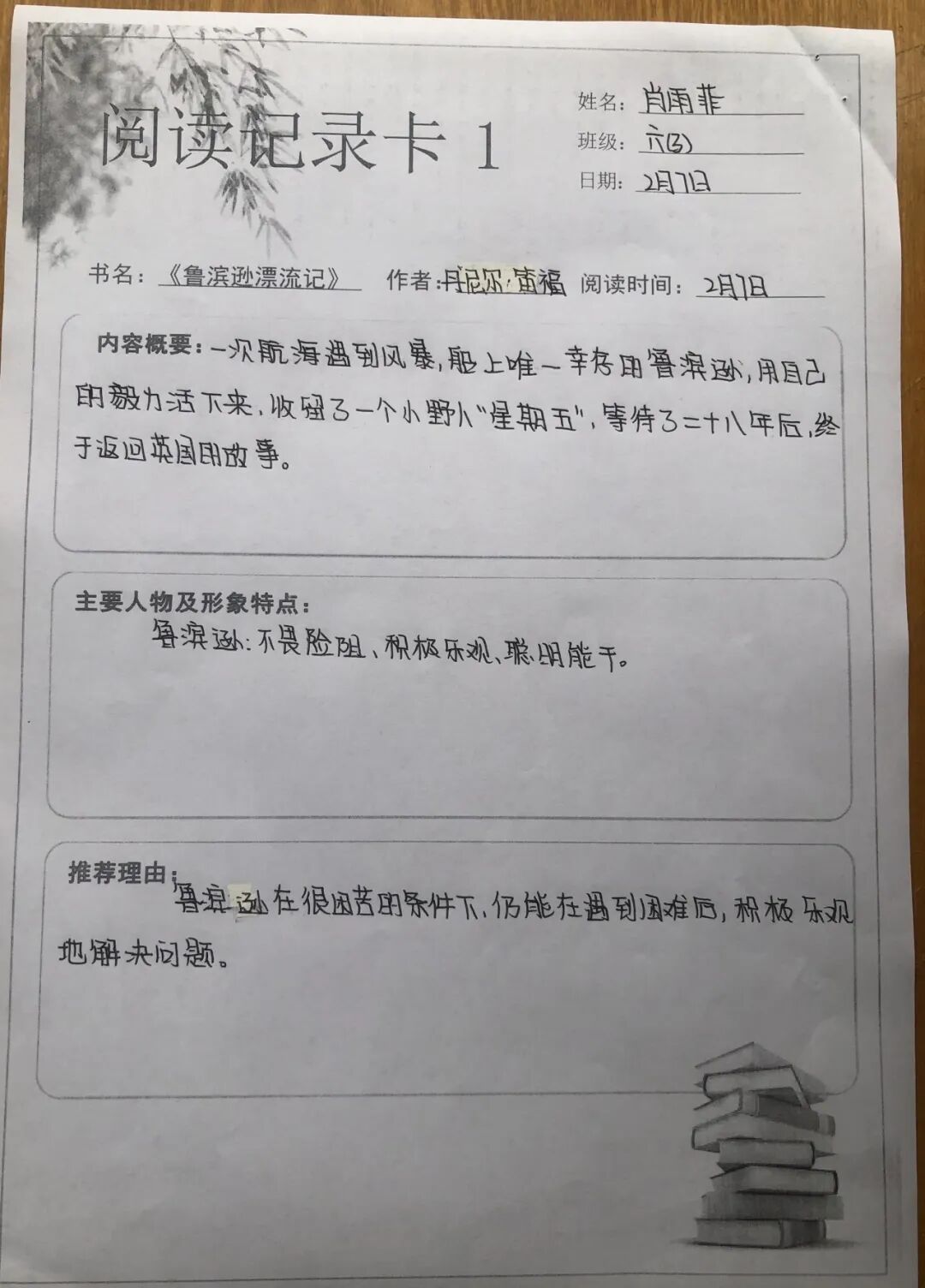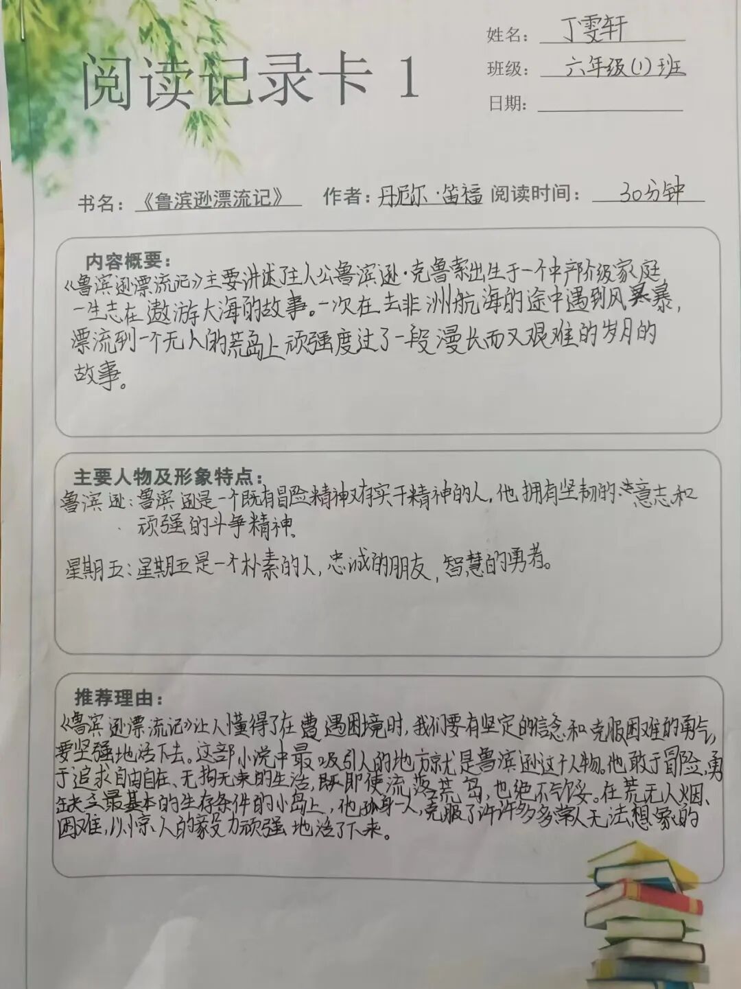 “立身以立学为先,立学以读书为本”。小学阶段是培养阅读习惯和阅读能力的黄金期,不仅要引导学生多读书、读好书,更要引导学生有效的读书。 针对六年级学情,六年级组语文教师站位学生阅读需求、阅读目标和阅读效果去考量,从内容概要、精彩语句、人物形象、印象深刻的情节以及读后感悟五个方面设计了阅读记录卡,引导学生在记录中积累,在记录中思考,在记录中感悟,在记录中成长。 一张张阅读记录卡让读书变得有深度有质感。孩子们在填写记录卡中加深了记忆、促进了理解、深入的感悟、有效的表达,从而更好地掌握书籍的精髓,提升阅读的能力和效果。同时,孩子们通过分享阅读记录卡,互相学习、交流、借鉴,形成了浓厚的阅读氛围。 六一班 六二班 六三班 六四班 六五班 六六班 本次阅读记录卡展示活动是学校书香校园系列活动的一个“缩影”,是持续助推学生阅读成长计划的一部分。学生们在享受中阅读,在阅读中成长,同时为书籍又增添了一道浓郁的书香。中心路小学学子将继续沉浸阅读、深入思考,让读书点亮心灵,书香润泽人生。 六一班:丁雯轩 卢悦宁 王岳新 任迪赫 张涵硕 六二班:张皓焱 张文约 李梓煊 吴筱萱 吕泽涵 六三班:张曼妮 李佳怡 肖雨菲 赵一霏 万乙儒 六四班:童话 周宸羽 徐国萱 殷思琦 马天阅 六五班:冯晨阳 刘浩泽 段童馨 白烜颖 佟思慕 六六班:杨佳昕 王子尧 姚钦帅 简立喆 李慕晨 供稿:黄珂 图片:六年级语文组 编辑:王凯红 责编:迟秋燕![]()