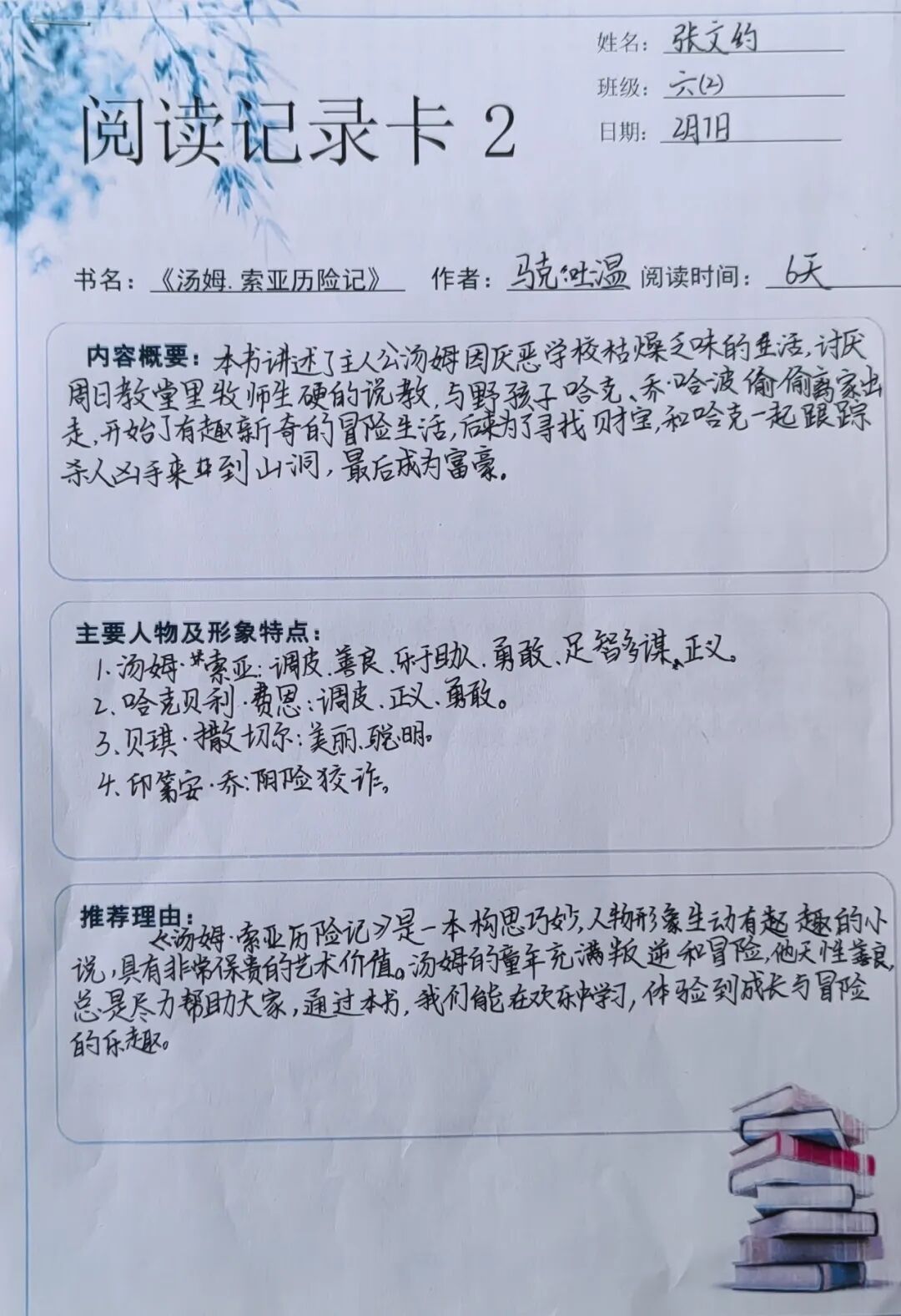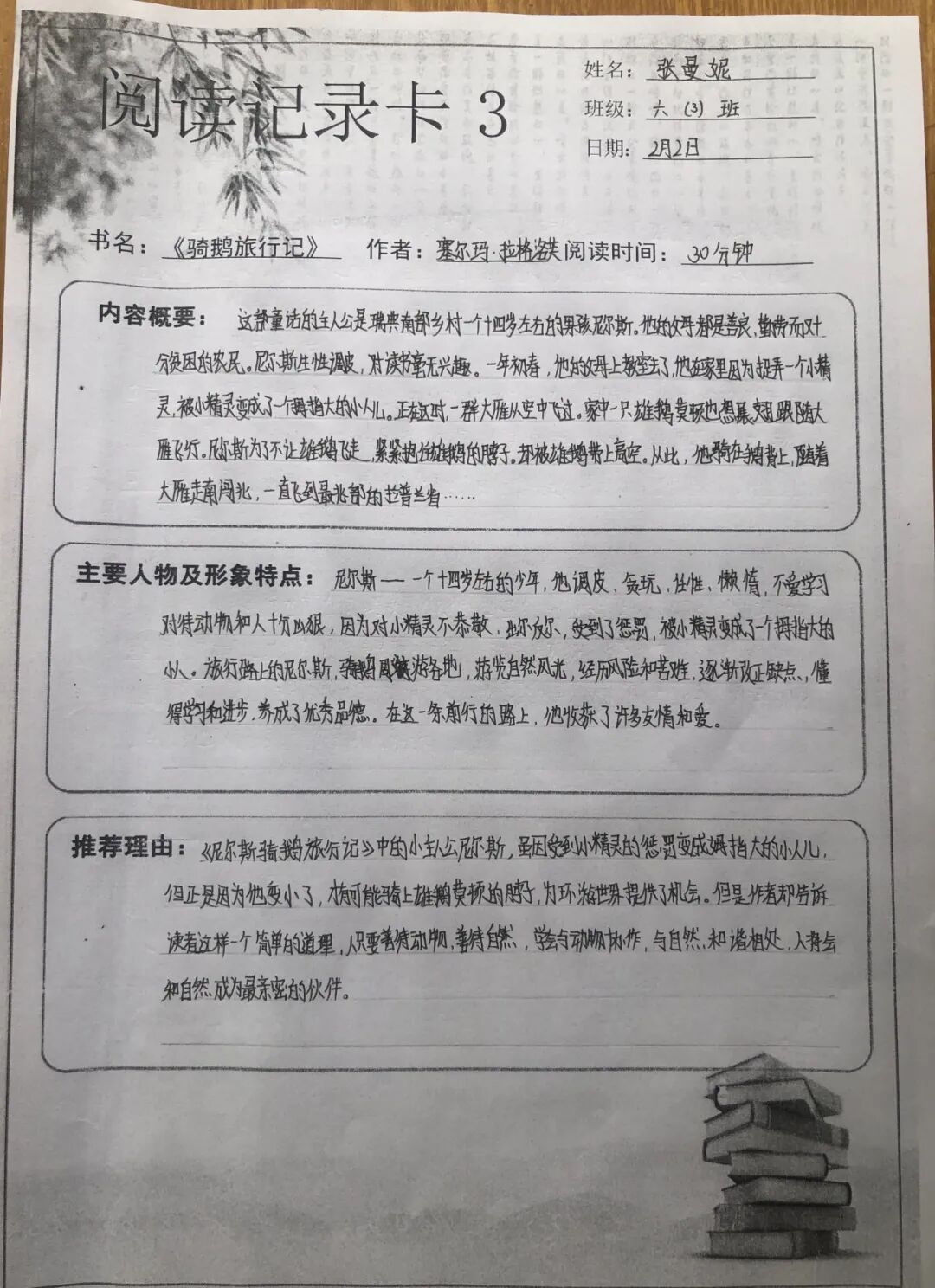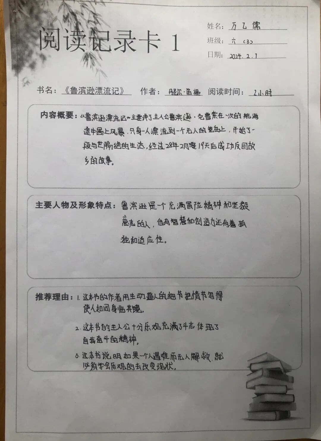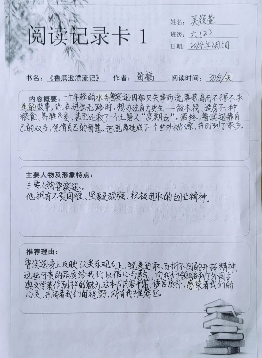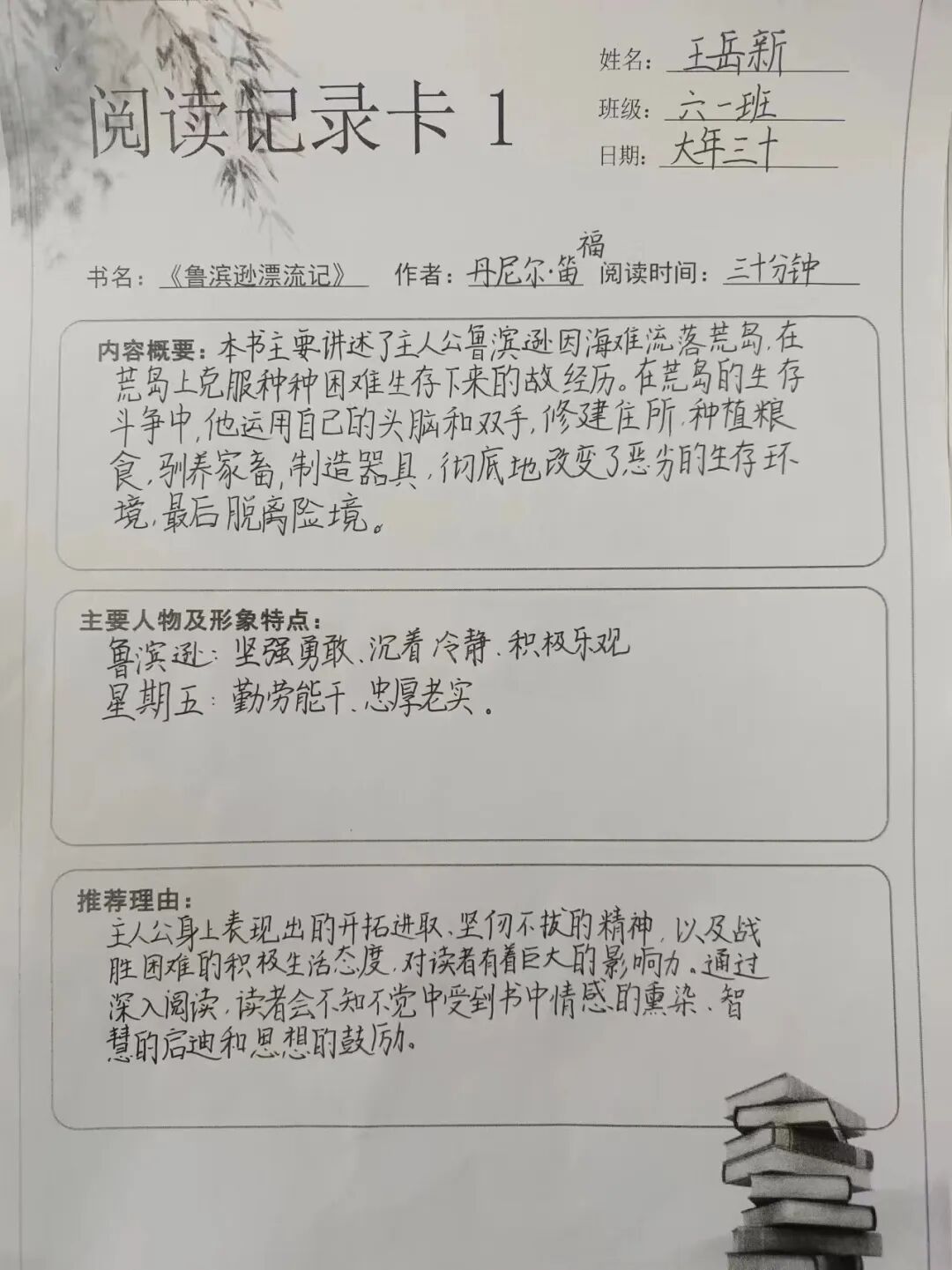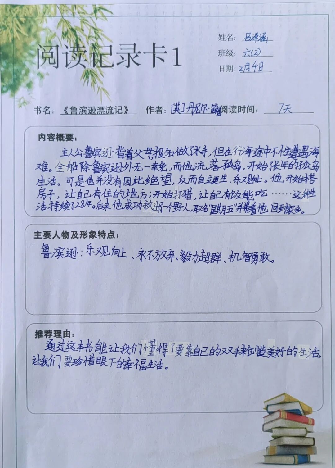 “立身以立学为先,立学以读书为本”。小学阶段是培养阅读习惯和阅读能力的黄金期,不仅要引导学生多读书、读好书,更要引导学生有效的读书。 针对六年级学情,六年级组语文教师站位学生阅读需求、阅读目标和阅读效果去考量,从内容概要、精彩语句、人物形象、印象深刻的情节以及读后感悟五个方面设计了阅读记录卡,引导学生在记录中积累,在记录中思考,在记录中感悟,在记录中成长。 一张张阅读记录卡让读书变得有深度有质感。孩子们在填写记录卡中加深了记忆、促进了理解、深入的感悟、有效的表达,从而更好地掌握书籍的精髓,提升阅读的能力和效果。同时,孩子们通过分享阅读记录卡,互相学习、交流、借鉴,形成了浓厚的阅读氛围。 六一班 六二班 六三班 六四班 六五班 六六班 本次阅读记录卡展示活动是学校书香校园系列活动的一个“缩影”,是持续助推学生阅读成长计划的一部分。学生们在享受中阅读,在阅读中成长,同时为书籍又增添了一道浓郁的书香。中心路小学学子将继续沉浸阅读、深入思考,让读书点亮心灵,书香润泽人生。 六一班:丁雯轩 卢悦宁 王岳新 任迪赫 张涵硕 六二班:张皓焱 张文约 李梓煊 吴筱萱 吕泽涵 六三班:张曼妮 李佳怡 肖雨菲 赵一霏 万乙儒 六四班:童话 周宸羽 徐国萱 殷思琦 马天阅 六五班:冯晨阳 刘浩泽 段童馨 白烜颖 佟思慕 六六班:杨佳昕 王子尧 姚钦帅 简立喆 李慕晨 供稿:黄珂 图片:六年级语文组 编辑:王凯红 责编:迟秋燕![]()