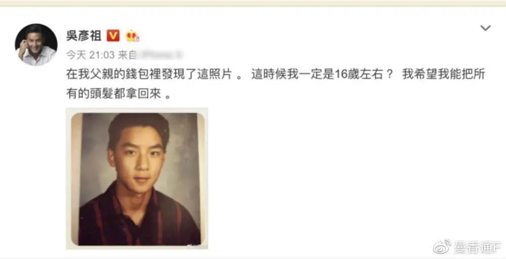 2018年,吴彦祖就曾在社交网站上怀旧PO照,透露自己在爸爸的皮夹里找到1张自己年轻时的照片,约莫是16岁依然青涩的时候。粉丝一看便纷纷惊叹“我的天,好帅”、“我如果是你同学,会因为太害羞不敢坐隔壁”。