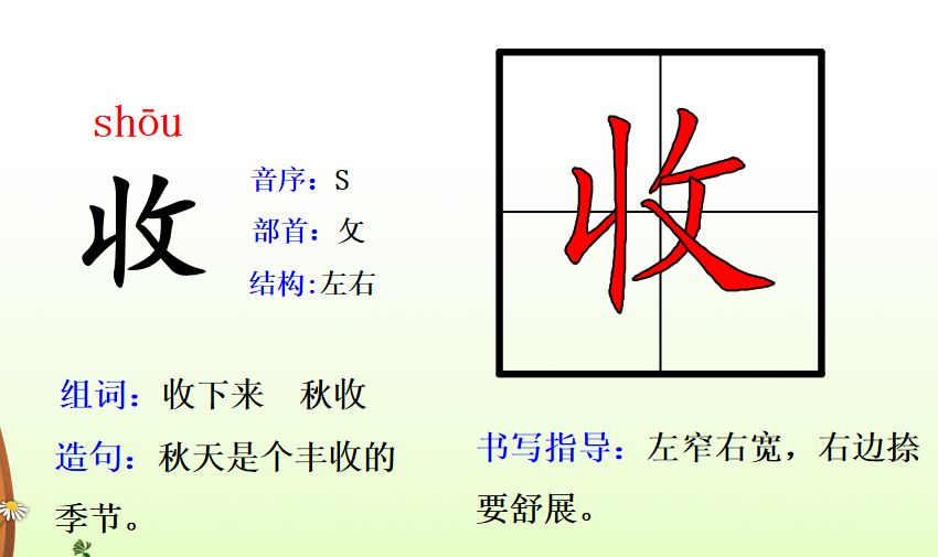 收shōu(秋收、收下、收到)
