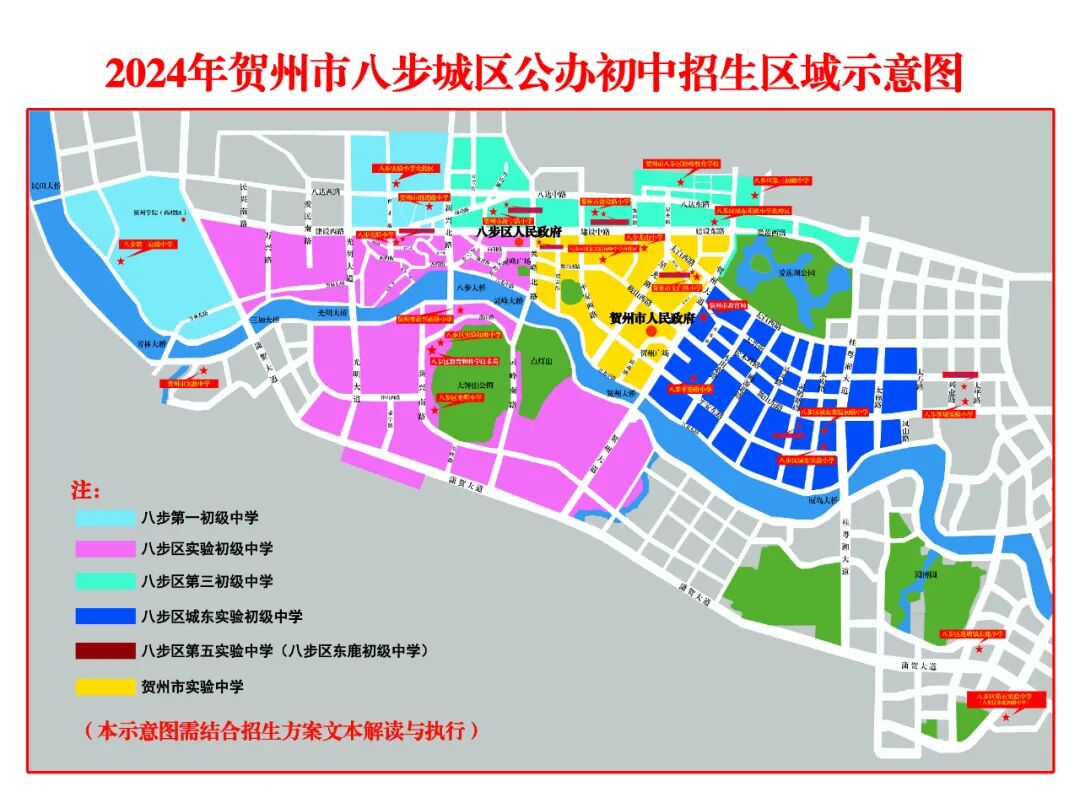 一、指导思想坚持以习近平新时代中国特色社会主义思想为指导,以国家、自治区、市有关法律及规范性文件为依据,以切实维护教育公平为准则,认真组织实施贺州市实验中学招生入学工作。(一)坚持免试就近原则。按照“户籍地段划片、相对就近、免试入学”的新生入学管理原则,有序确定入学对象,规范办理入学手续。(二)坚持公平公正公开原则。通过多种形式及时向社会公布招生入学政策及相关信息,充分发挥舆论监督作用,实行“阳光招生”。(三)坚持入学优待政策原则。认真落实教育优待政策,妥善安排解决各类符合条件的优待对象子女入学。(四)坚持统筹协调原则。学校按照“城区户籍的适龄少年”“符合条件的进城务工人员随迁子女”和“民族班”三个批次,科学统筹新生入学工作,优化教育资源配置,切实保障各类适龄群体受教育权利。(一)入学对象:具有八步城区户籍的适龄少年及符合政策性照顾对象、民族班、招生地段服务范围随迁子女就读条件的2024年小学应届毕业生。(二)招生计划:初中七年级新生共21个班1050人。其中八步城区地段生12个班600人,学校周边区域1个班50人,政策性安置2个班100人,民族班6个班300人。(1)八步城区:灵峰北路以东至贺州大道,建设路以南至江北中路区域。