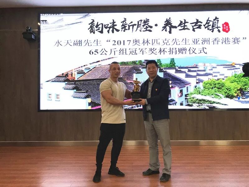 昨天下午2点半,水天翮带着“2017奥林匹克先生亚洲香港赛”65公斤组级冠军来到故乡新塍镇,将这座代表荣誉的奖杯捐赠给新塍镇政府,水天翮的父母、亲人及徒弟都来到了捐赠仪式现场。