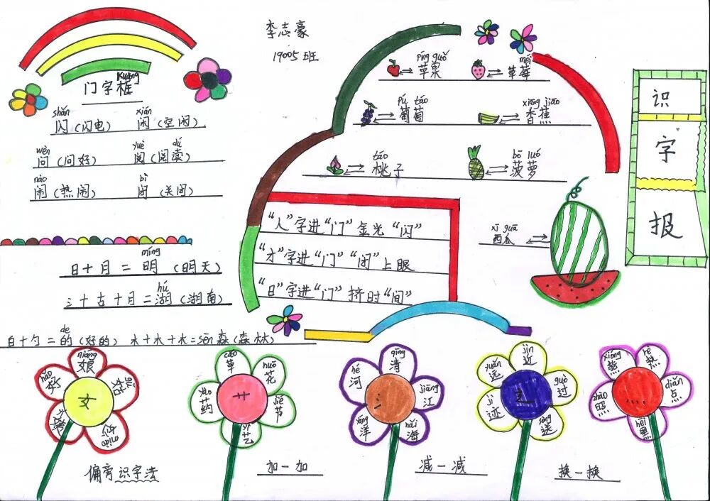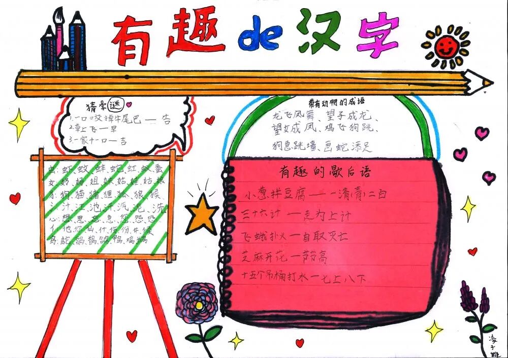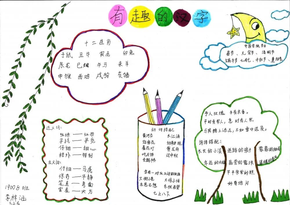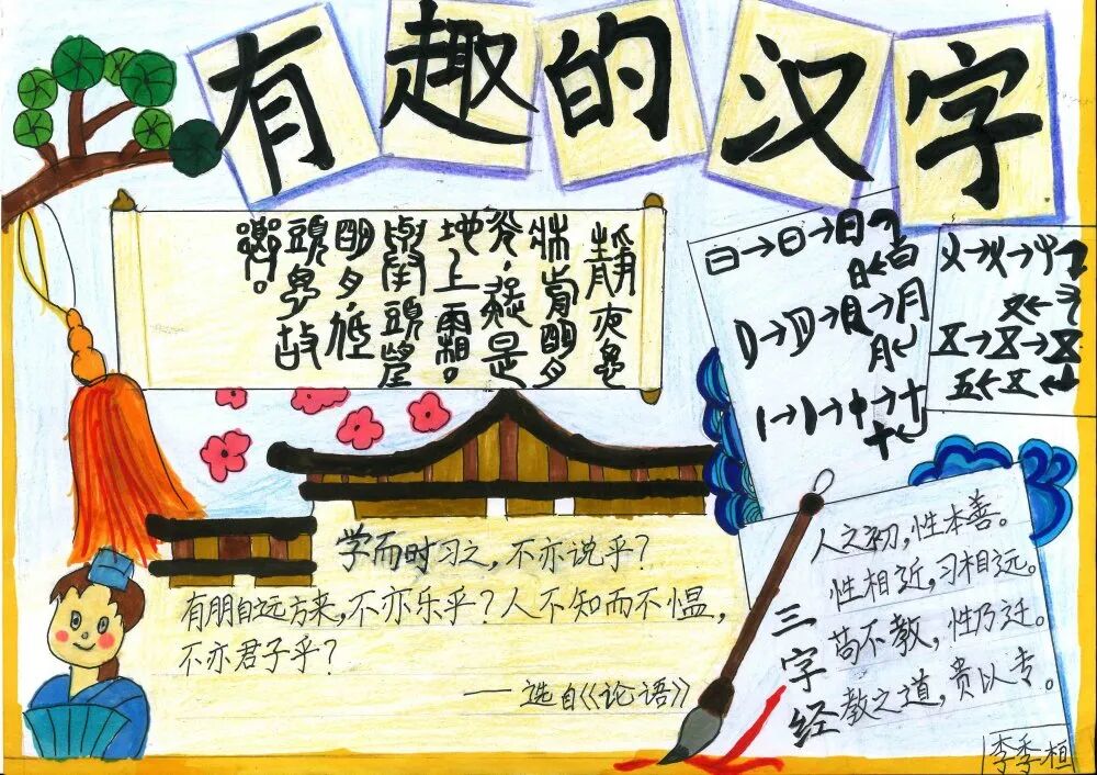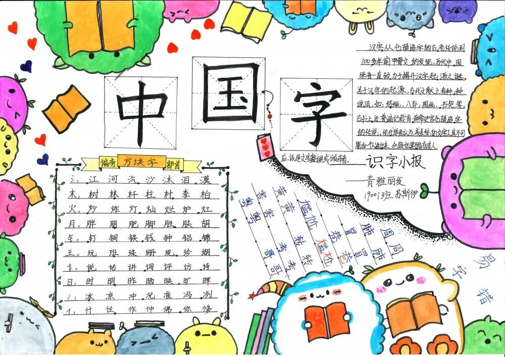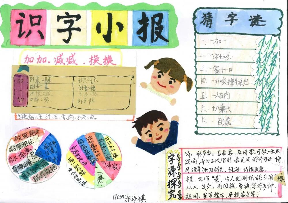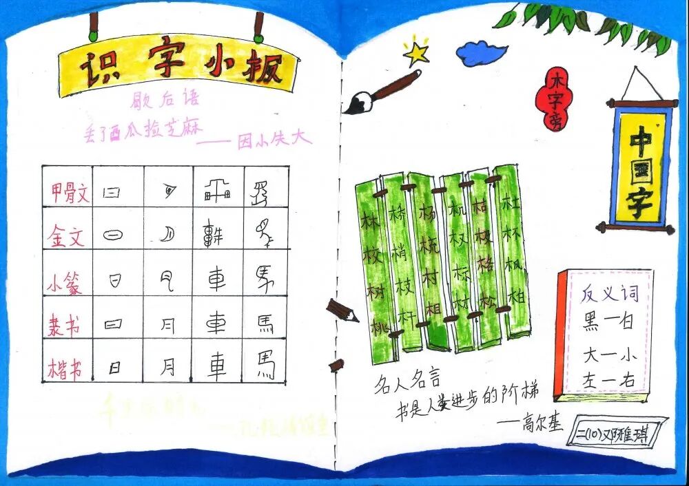 学语文重在积累,重在习得。生活处处皆语文,汉字在生活中便无处不在,时刻与我们相伴。为了激发孩子们的识字兴趣,拓宽识字面,培养识字能力,青雅丽发学校二年级语文组近期开展了制作识字小报实践活动。在本次活动中,学生们积极参与,用自己的智慧和巧手,制作出了一张张精美的识字小报,内容丰富多彩,主题各式各样,有趣味识字小报、识字知识小报、汉字演变过程的探究类小报等等。 学生作品 左右滑动查看 小脑袋,大智慧。孩子们根据老师所教授的制作识字小报的过程和方法,积累了丰富的素材,并且运用了低年段所学的识字方法,如:形声字识字法、偏旁归类、换一换、笔画加减等,对汉字进行整理归纳,精心对手抄报进行排版构图,充分发挥想象力,在小报上画上各种美丽的图案,制作成了一张张精美的小报,并在班级和同学们一起分享交流。 这次活动,家长们也主动和孩子们一起动手画画、贴贴、剪剪,不仅很好地实现了亲子互动,更在活动中培养了孩子们留心观察身边的事物的习惯,还能感受认读的无穷乐趣,寓教于乐,为今后阅读奠定了基础,同时促进了孩子们语文素养的形成。 END 撰稿:周凤飞 审核:丁再南、张庆娟 编辑:张欣 二年级语文小报
