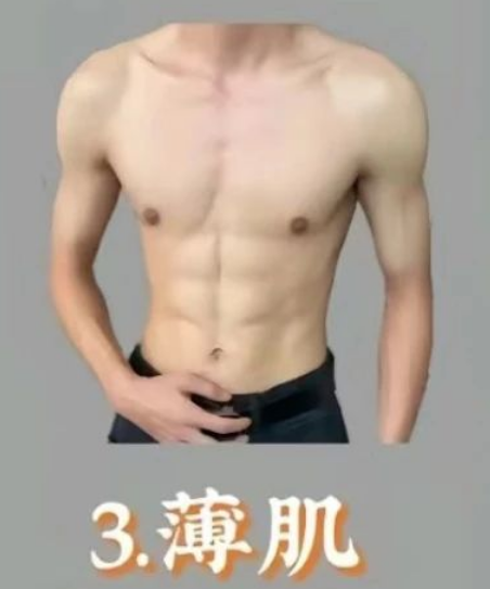 有一些肌肉了,但也属于又瘦又累的形象,薄肌常常给人一种饿惨了的感觉,也算是大众的一种调侃。“薄壳”的上身和肢体显得没有力量,整个人的状态仿佛随时都能被风刮走。对于这份“薄肌”而言,最好制定一个合理的饮食和训练计划。多吃坚果、蛋白质丰富的肉类和充足的碳水化合物,你让身体不仅看起来更健康,还能提升精神面貌!