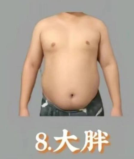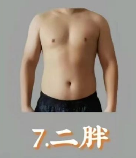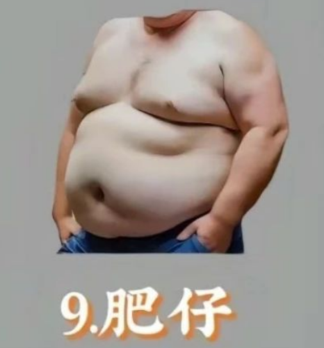 “肥仔”无疑是一种极典型的体型,常常被归为“放纵”的象征。上身赘肉明显,整体给人一种保险的感觉。生活中往往容易吃喝玩乐,对于日常锻炼完全没有兴趣。肥仔们往往对自己的体型充满自嘲。建议肥仔们开始定一个实际目标,逐步开始健身,搭配清淡饮食,慢慢就能让体型有显著转变,成为朋友们眼中的“健身狗”,但是这难度就很大了,需要极强毅力。