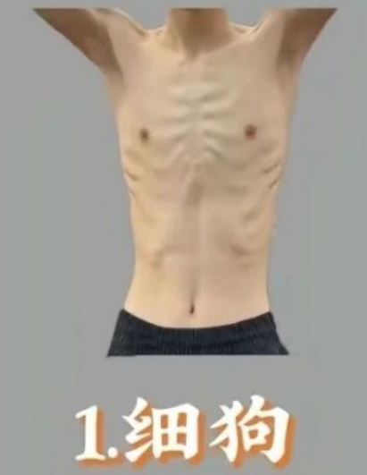 细狗体型,顾名思义,就是那种让人一眼看上去觉得很瘦的身材。可能身高不高,骨架稍小,刚一站上体重秤,所有的数字都会让人心痛不已。这样的体型大多由遗传和不良生活习惯形成,如果你是一个狂热的跑步爱好者,而不重视饮食的话,可能就会成就“细狗”这一阶层。对于细狗来说,增加肌肉量才是关键!加强力量训练,多吃高蛋白的食物,才有可能在风吹日晒下不被肆意牵引。想成就一个比风更大的体型,细狗们,努力吧!