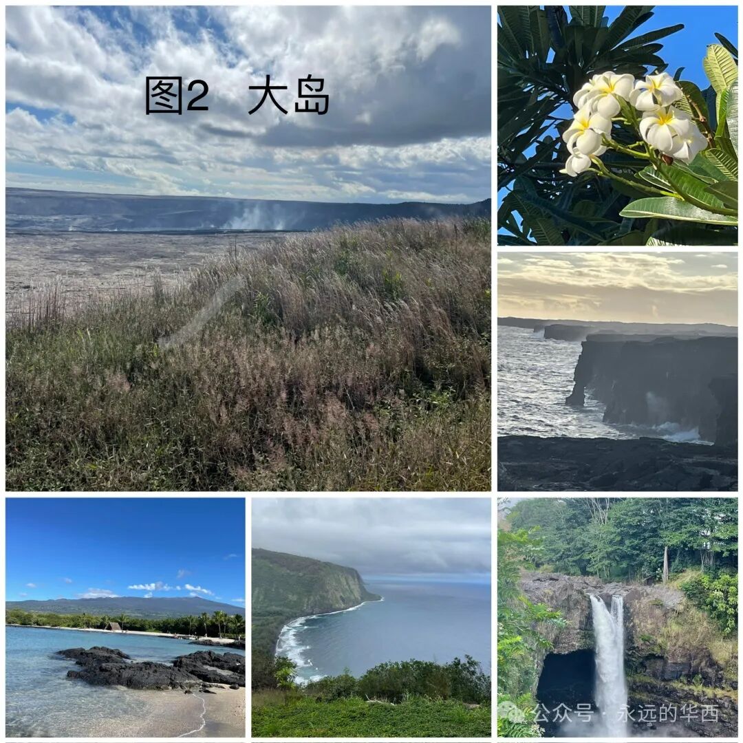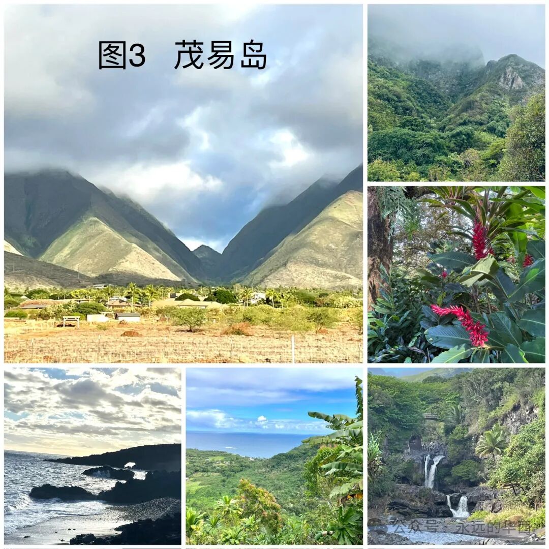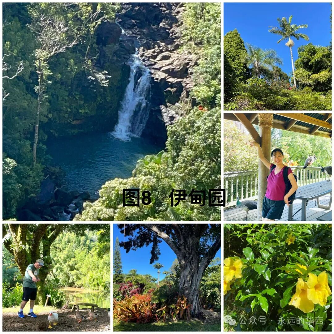 1908 年,美国国会把夏威夷欧胡岛的珍珠港定为美国的海军基地。1941年月7日,日本帝国空军三百多架飞机对珍珠港进行多轮狂轰滥炸,摧毁了八艘美国军舰,180多架飞机,导致2393人丧生,1178人受伤。日本偷袭珍珠港将美国卷入了第二次世界大战。访问珍珠港(图6),看到无数亡魂葬生的战舰残骸,祈祷珍珠港是最后一个为和平付出代价的地方。祈祷美丽的夏威夷和地球上任何一个地方都不再遭受战争的蹂躏。2023年8月,茂易岛有处高压线被风吹倒引发火灾。大火烧毁了茂易岛最著名的旅游胜地拉海纳小镇,一百多位居民葬身火海。站在鬼城般的拉海纳小镇和其邻近豪华的度假村之间,问大自然是否对过度开发茂易岛有所异义?为了节省开支和避免拥挤,我和老伴选择了12月初去夏威夷。这时的机票和旅馆费比圣诞节期间低一半。我们从大岛登上夏威夷,然后坐小飞机从大岛到茂易岛,再从茂易岛乘小飞机到欧胡岛,最后从欧胡岛返家。登上大岛时,我们被温暖的晚霞和公路两边盛开的鲜花和婀娜多姿的椰树所感动(图7)。波士顿此时正万木凋零,冰天雪地。首先来到一家餐馆吃晚饭。如波士顿的美式餐馆一样,这里昏暗,拥挤,酒吧电视上放着激烈的球赛。游客们耐心地排着长队。说是要等30分钟。我们挪到邻近一个泰国餐馆。这是个楼上的露天餐馆,可看街景,但不知为何门可落雀。胖胖的女老板和光着膀子的伙计在吹着风扇看电视。他们三五分钟就端出了上百美元的三个菜,蔬菜没炒熟,鸡肉和牛肉太老。而且太咸太辣。我们还被这里饥肠辘辘的蚊子饱餐了一顿。第二天晩上我们享受了夏威夷独有的传统歌舞宴会叫做Luan。宴会在海边星空下,椰树旁举行。各式自助正餐,凉菜,甜点,还有酒水让人眼花缭乱。乐队弹奏着轻柔的的岛国音乐,穿着艳丽服饰的姑娘们跳着曼妙的草裙舞,扮成部落勇士的壮汉舞动着火棍。让我们尽享岛国风情,希望这个晚宴永不结束……在大岛的最后一个早上,我们踏着朝阳在海边散步。可见垂钓的老者和躺在海堤上睡懒觉的流浪汉。想到这里的流浪汉不用受寒冬之苦,为他们感到庆幸。三月前遭受火灾的茂易岛西部是是很商业化的地方。这里有昂贵的度假村和成片的居民住房。我们的旅馆在较便宜的茂易岛中部,但还是这次旅行中最贵的。不提供早餐,还要付度假费(resort fee)。茂易??人赚钱有方。哈纳之路(Road to Hana)是60多英里长的风景驾车公路。沿着茂易岛东部北侧海岸线所建,从中部通向哈纳镇。一路上没有饭店和公厕。有小贩在路边搭篷做烧烤,十八美元一盘白米饭加个烤鸡腿和芥蓝,解决了吃饭问题。正在担心方便的问题,路边豁然出现一个叫“伊甸园“的植物园(图8)。三十美元看尽人间奇花异草,享受公厕和观看瀑布的最佳景点。还可以与鸡鸭同乐,与孔雀共舞。要不是穷追不舍的蚊子提醒,还以为自己真的到了伊甸园……到了茂易岛才知道公园需要预约(网站为recreation .gov)。原因是游客多,停车位有限。由于这个原因,我们跑了两趟才看到伊奥山谷,且错过了Wai’anapanapa 州立公园和Haleakala国家公园的日出。但有机会完成了茂易??东部环岛游。与茂易岛西部相比,东部显荒凉(如下视频 )。部分路为石子路,沿着悬崖峭壁而开,让人心惊胆颤。老伴眼神不好,得专心开车,不敢往两边看。让他停车照像的时候,一定要有一个让他“哇噻“的景点。他认为始终没有等到,结论是“茂易岛没什么好看的!“。