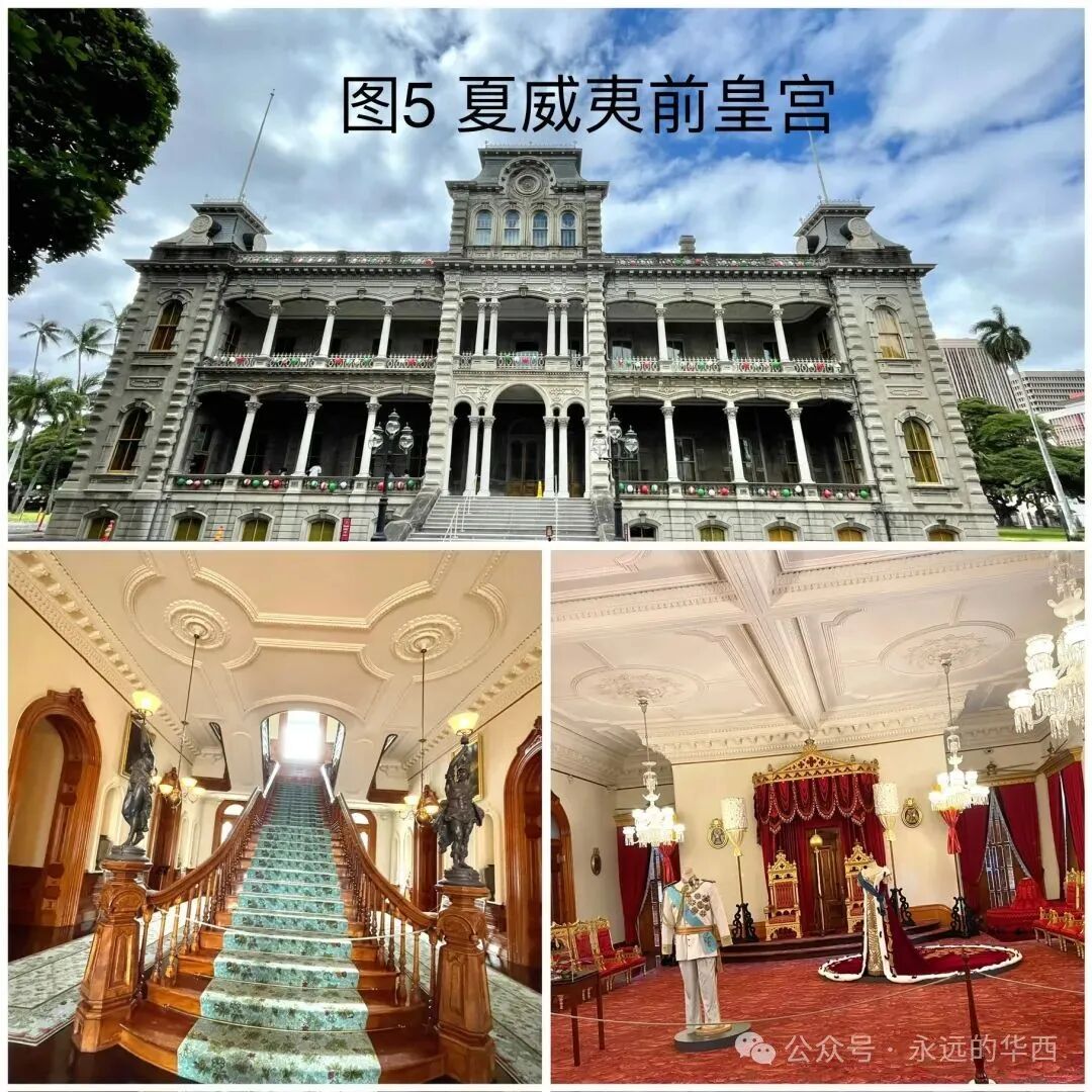 笔者在2023年游览了夏威夷后,认为夏威夷是天堂,有时是地狱,但却更是人间。较知名的有大岛(Big island),茂易岛 (Maui),欧胡岛(Oahu)和可爱岛(Kauai)。大岛是国家火山公园所在地(图2)。欧胡岛(图4)是夏威夷首府檀香山所在地。可爱岛开发较少,是电影“侏罗纪公园”的拍摄地。无论身在哪个岛,都会有明媚的阳光,清新的空气,湛蓝的天空,碧绿的海水和葱郁的山峦。白云萦绕在山间,花草点缀着大地。山谷里,小溪潺潺,瀑布跌宕。海岸边,或海浪舒卷,绽放延绵不断的白色浪花。或惊涛拍岸,形成各种形状奇特的悬崖峭壁。在每个地方驻足凝神,都会感到心旷神怡,感慨万千:造物主创造的世界本该如此……1893年1月,美国军队没有任何正义理由强侵夏威夷。夏威夷王国最后一位女王为了避免流血,选择投降,结束了夏威夷王国80年的统治。所幸的是,现任统治者美国联邦政府不仅保留了老王朝的王宫作为历史博物馆(图5),还保留了夏威夷民族的文化。1899年12月,欧胡岛中国城一名22岁的男子死于"黑死病“。为了防止瘟疫的扩散,夏威夷政府对中国城实行了隔离。但未能控制“黑死病“的蔓延。政府被迫下令焚烧感染地区。大火烧了整整17天,几乎烧毁了整个中国城。但所幸的是,没有造成与火灾有关的死亡。今天的中国城是檀香山旅游景点之一,以美食,购物,和特色文化著称。希望不堪回首的往事随海风飘散。