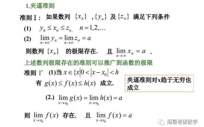 听着有点吓人哈。在定义中,理解为,这么个不等式,不等式两边的 式子的极限存在,那么不等式中间的式子极限也存在,而且极限值彼 此相对,由不得它自己选择,是这么个意思。